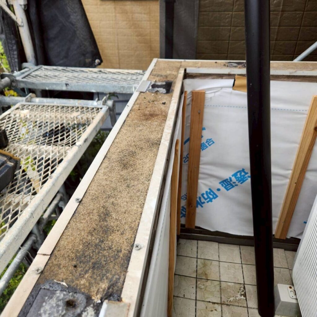 この工事で特に重要なのは、一旦バルコニーのアルミ笠木を取り外し、その内側の防水を貼り直すことです。