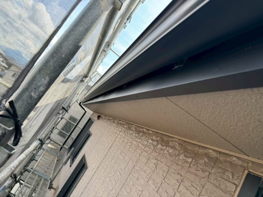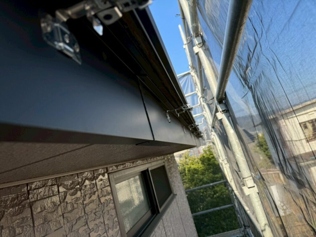 鼻隠し部分の雨どいについても、既存のものを取り外し、新しい吊り金具と新しい軒どいへと交換いたしました。