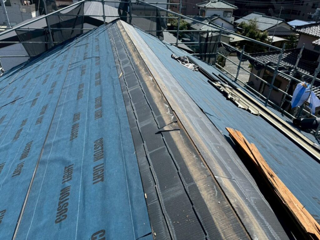 こちらのお宅は、現時点で大きな雨漏りが発生していたわけではありませんが、築20年が経過していることや、ルーフィングの寿命も踏まえ、今後も安心して暮らしていけるようにとのことで、屋根カバー工事をご希望いただきました。