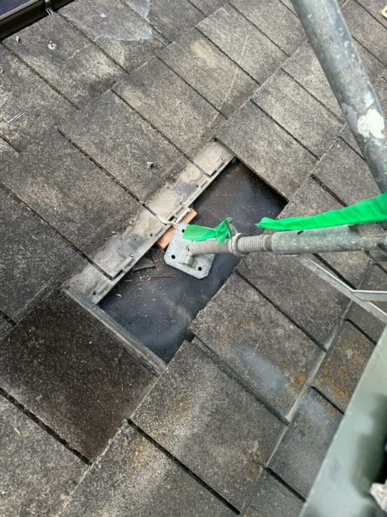 足場設置作業中、下屋根の瓦が一枚割れる事象が発生いたしました。