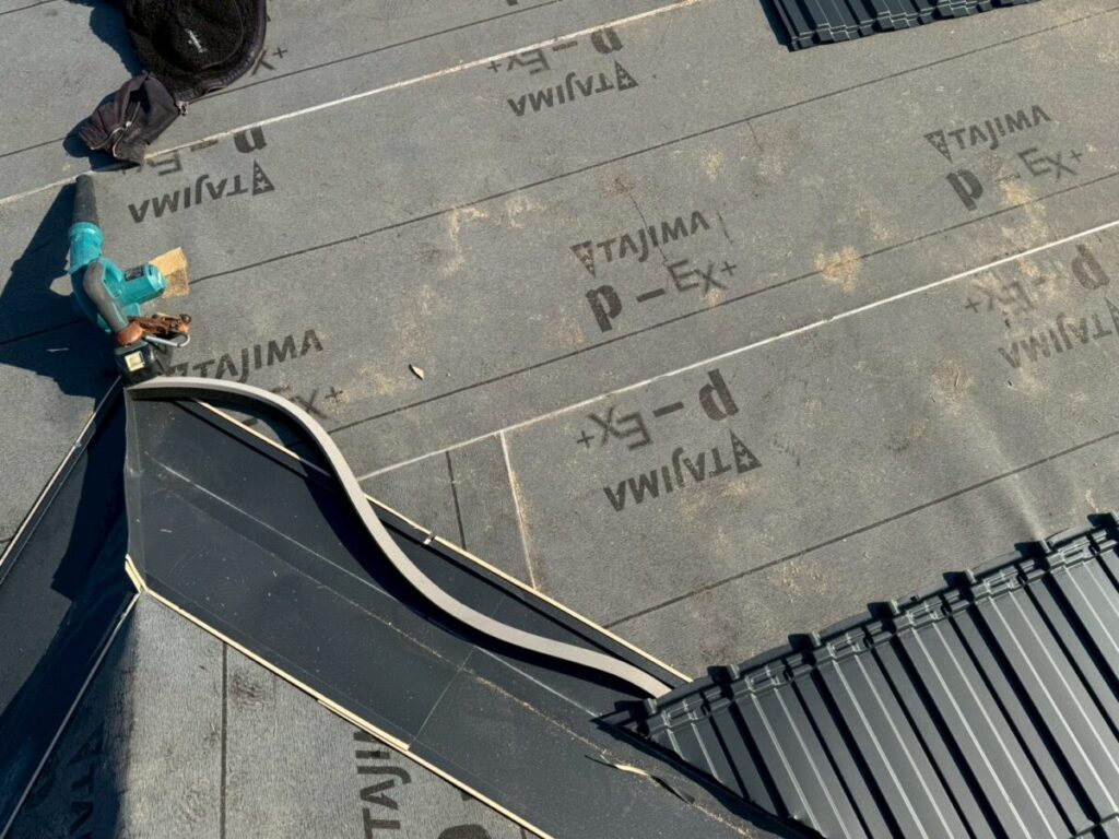 下地施工完了後、本体屋根材であるレクトプルーフの施工に移ります。