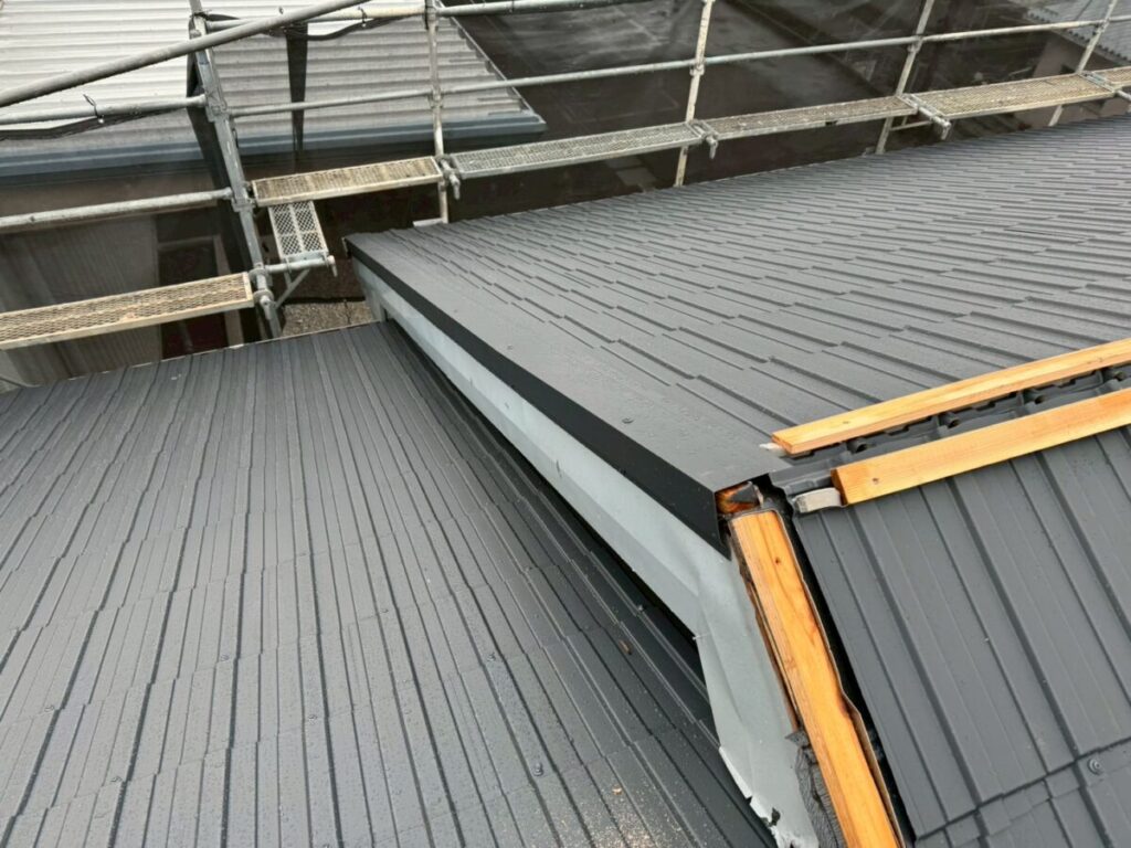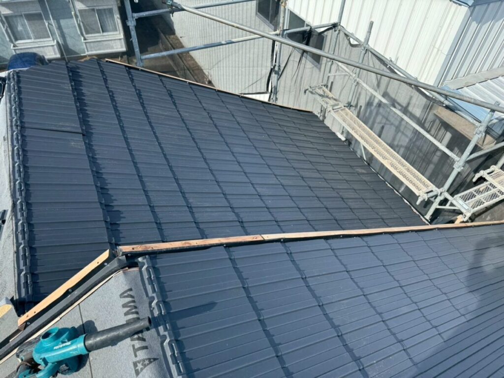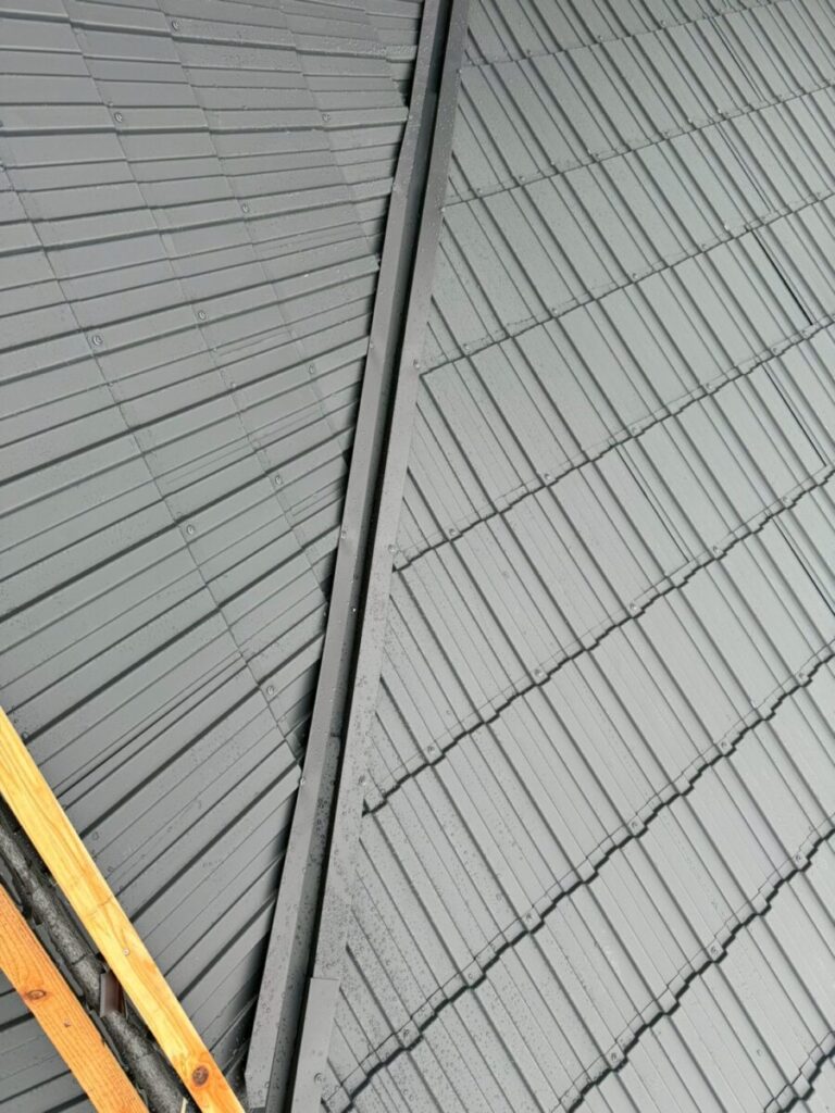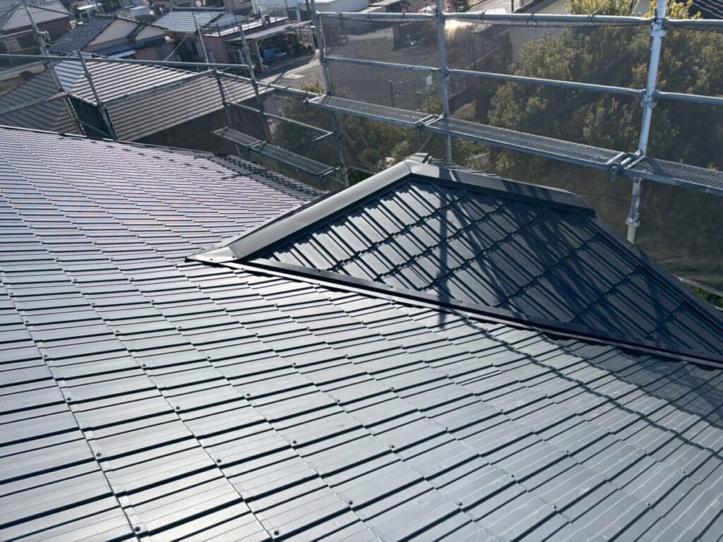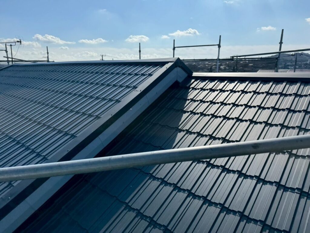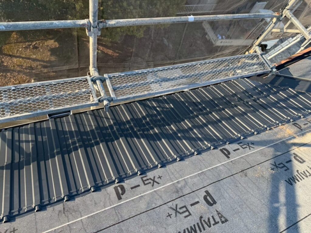 レクトプルーフは金属屋根でありながら、陶器瓦のような重厚感のある外観を実現できる屋根材です。足場上から近距離で見ると金属屋根であることが分かりますが、地上からの視認では瓦屋根のような印象を与えます。