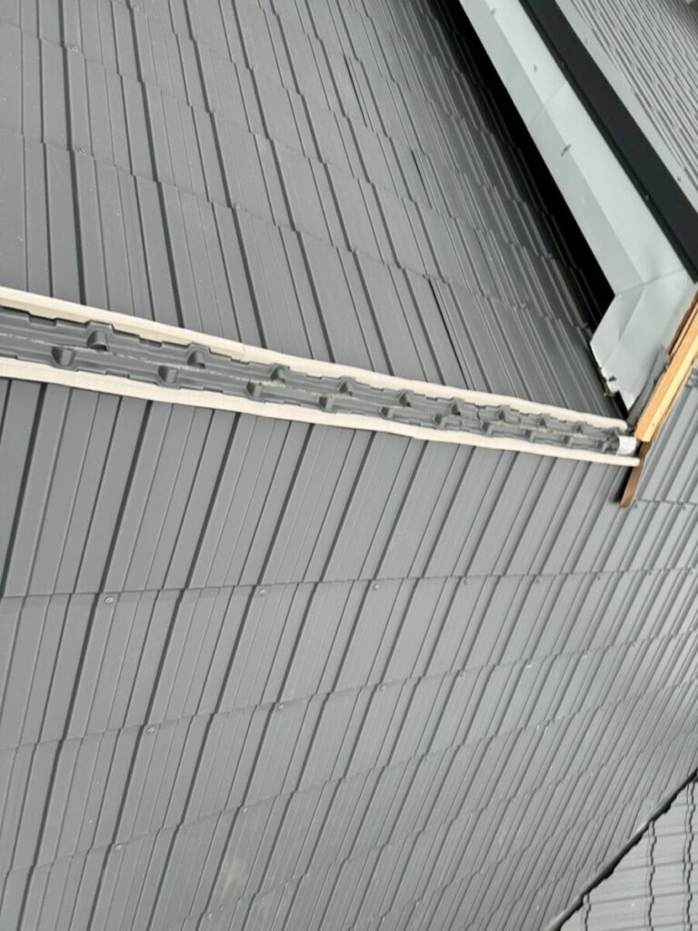 ケミカル面戸をはじめとする雨仕舞い部材も細分化されており、各役物ごとに適切な部材を使用しながら施工を進めます。細部の納まりまで設計思想が反映された屋根材です。