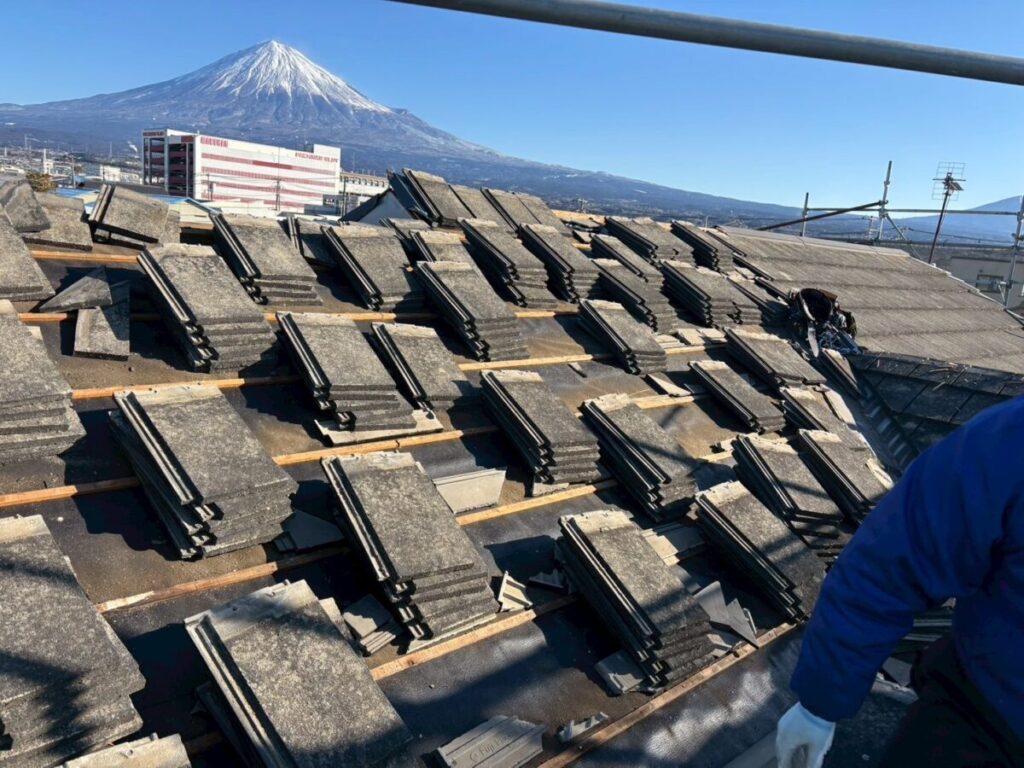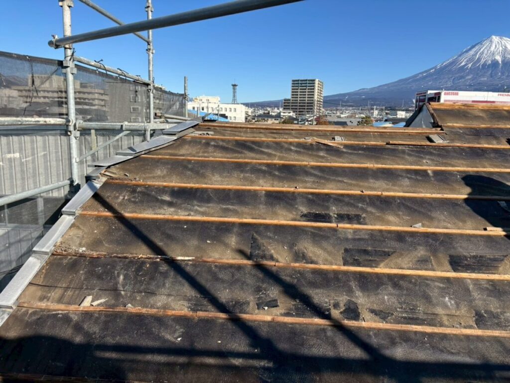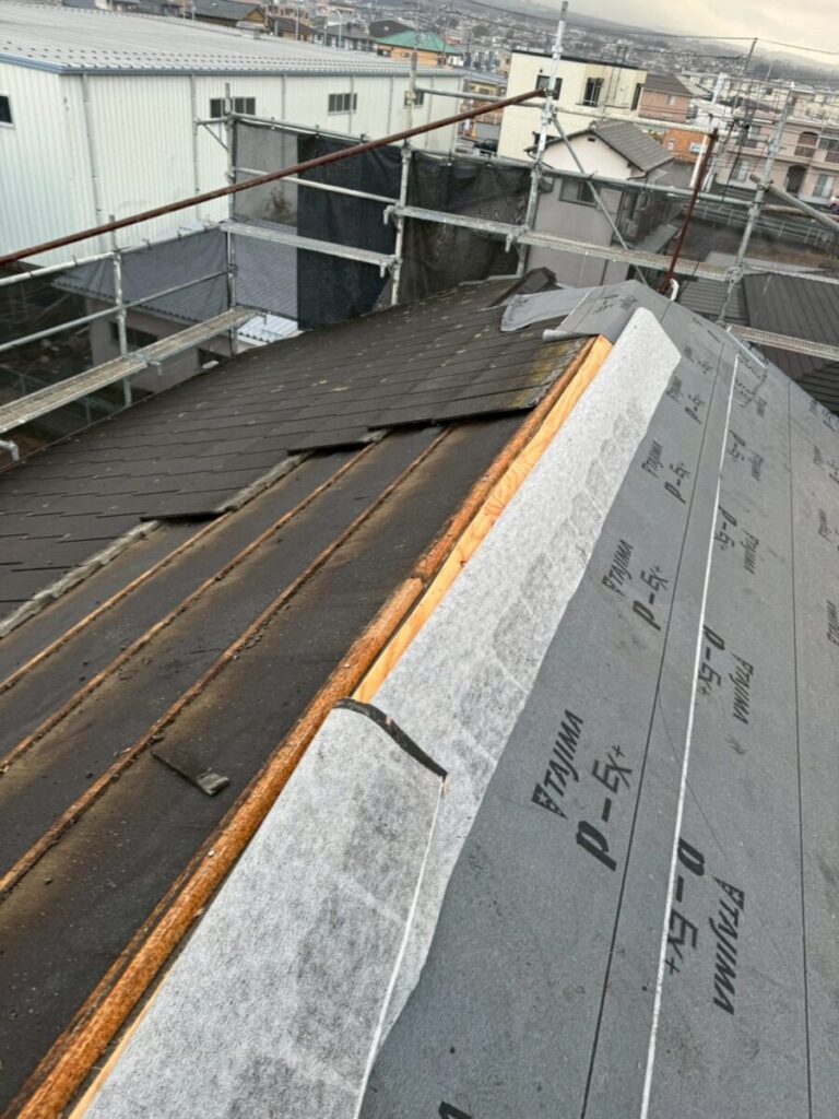 一般的な葺き替え工事では、瓦桟および既存ルーフィングを撤去し、野地板を露出させたうえで新規合板を直貼りする方法が多く採用されています。
