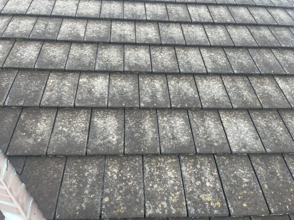 屋根材はセメント瓦でしたが、表面上は割れや著しいズレなどの明確な異常は確認できませんでした。