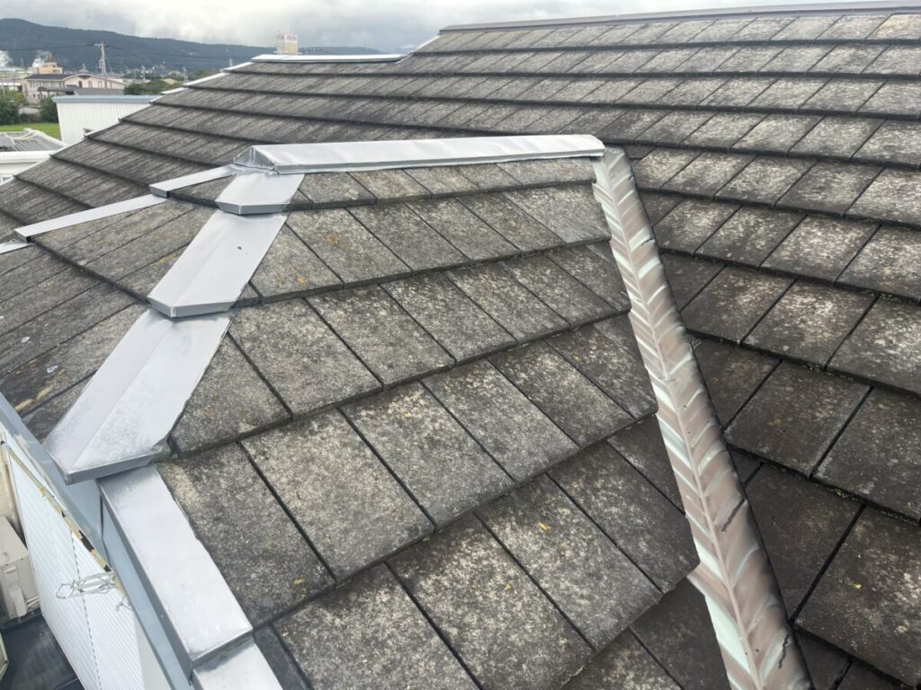 下屋根は足場を必要としない高さであり、将来的に施工可能であることから、今回は2階屋根の全面葺き替え工事を行う方針となりました。