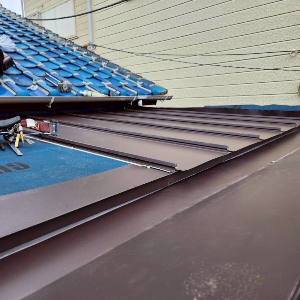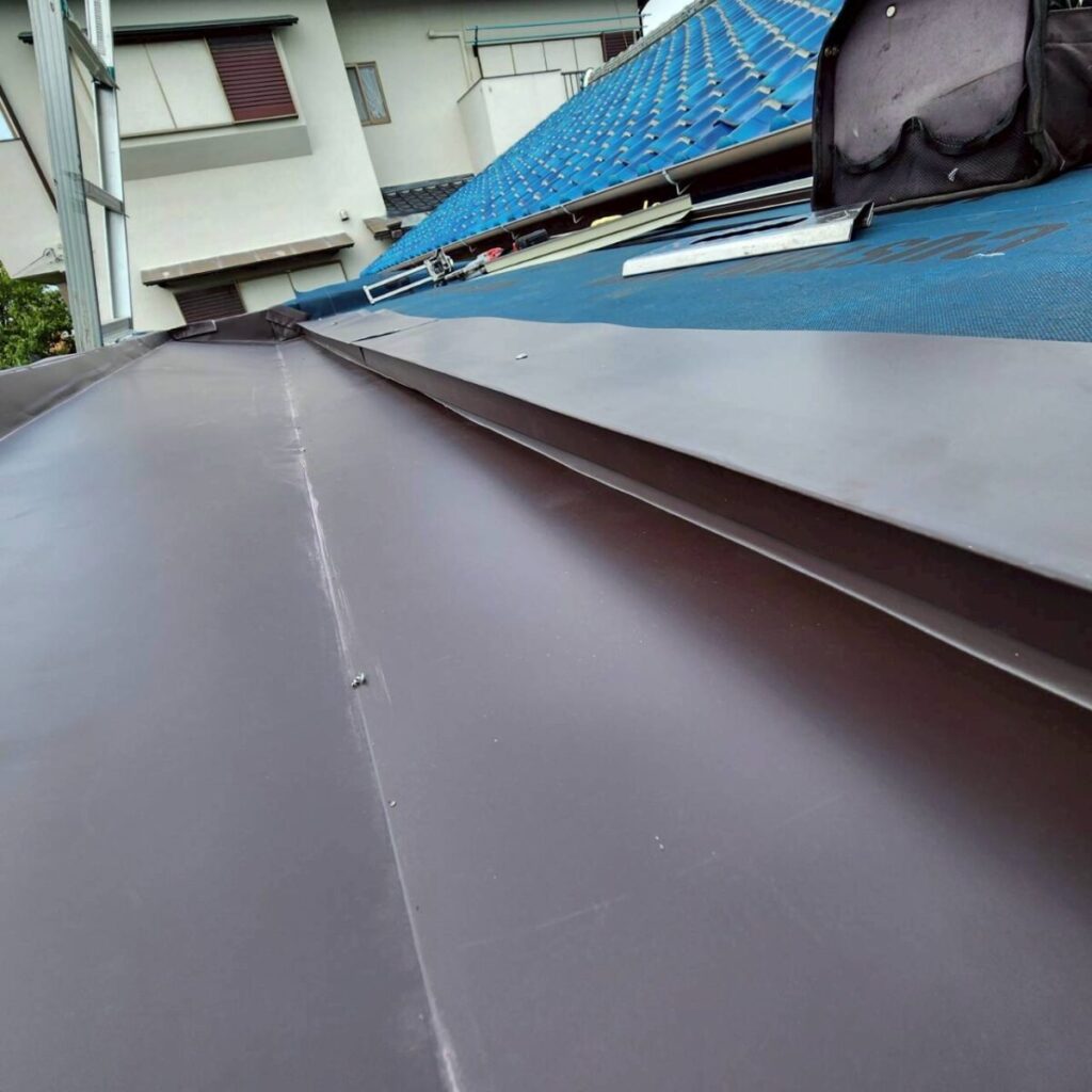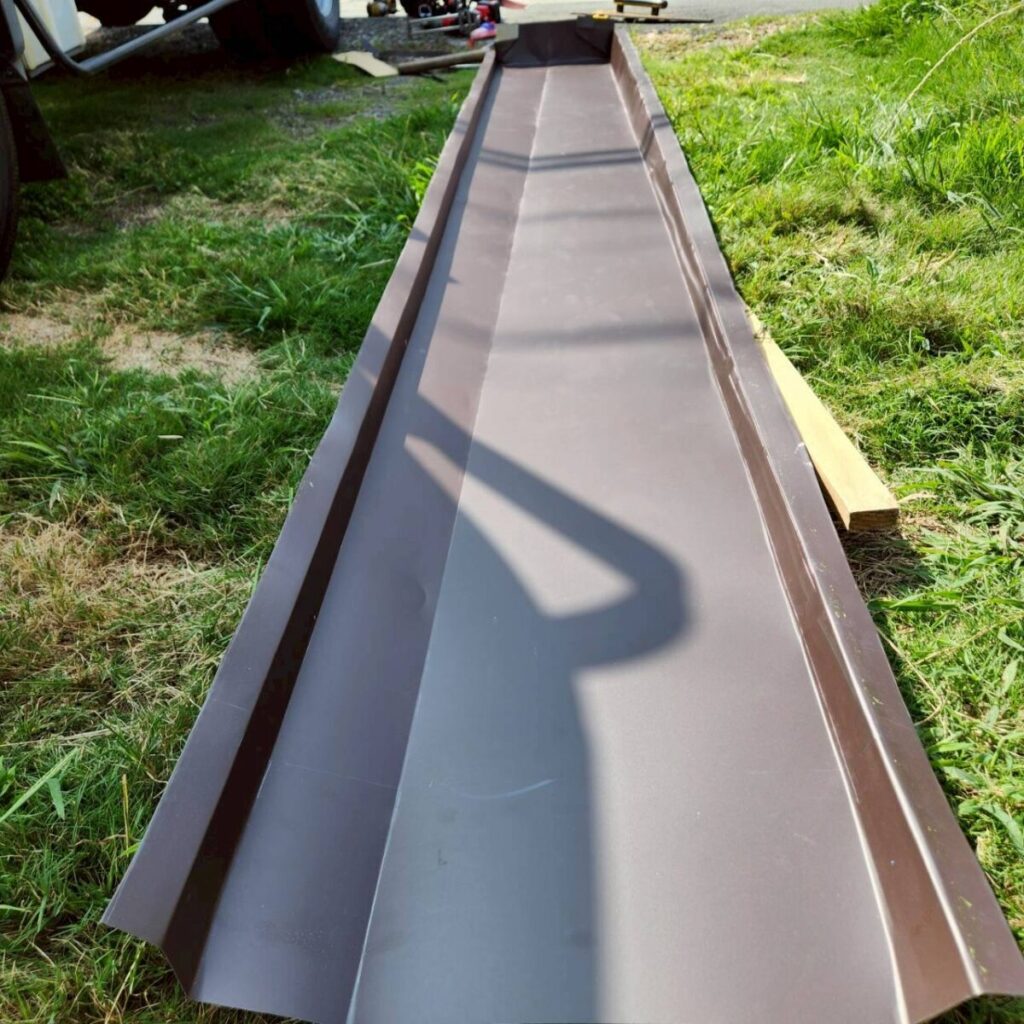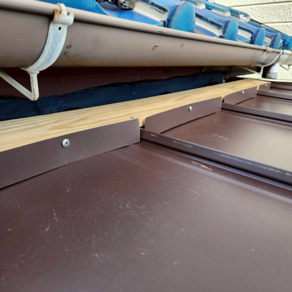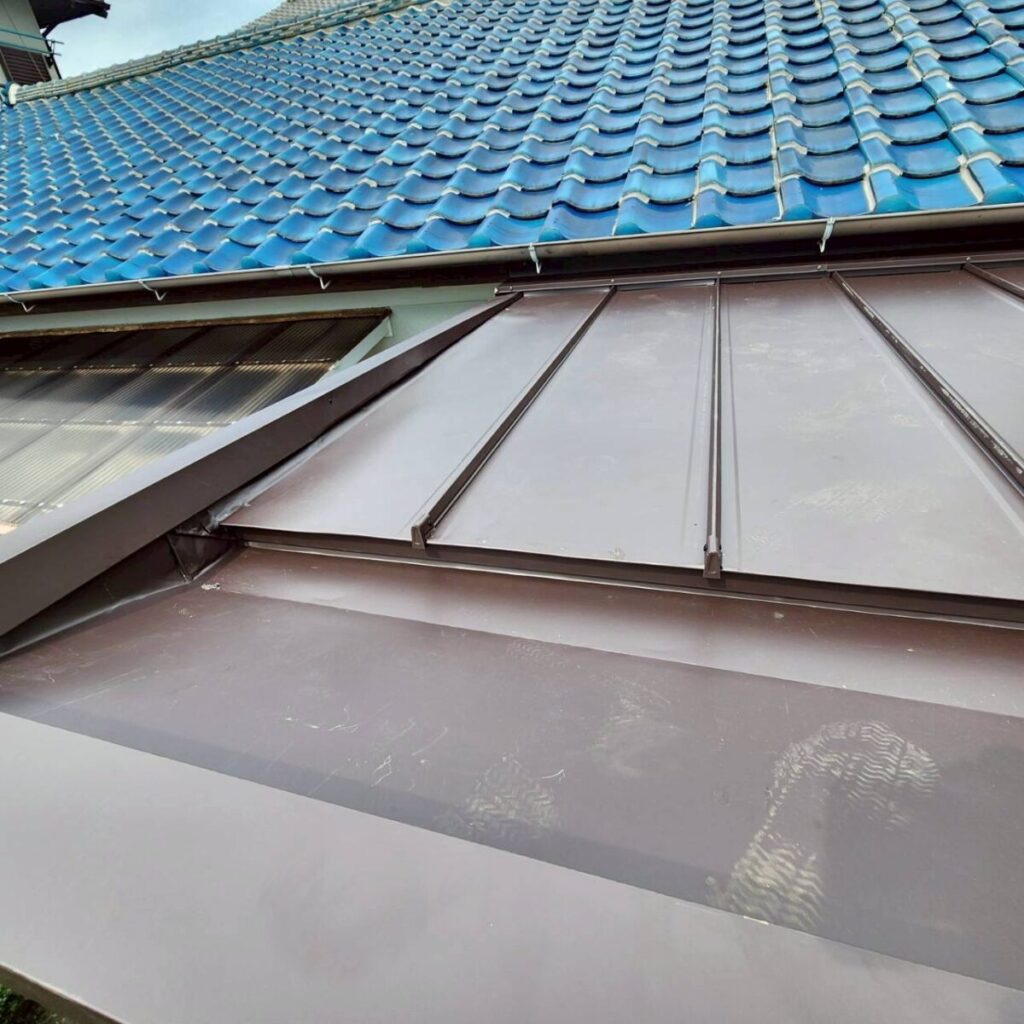 谷を現場で作成し段差部分に軒先水切りを取り付けガルバリウムの立て平葺きを取り付け軒先を掴み込んでいきます、壁際は雨押さえを取り付け残りの三方は笠木板金で蓋をして仕上げます。