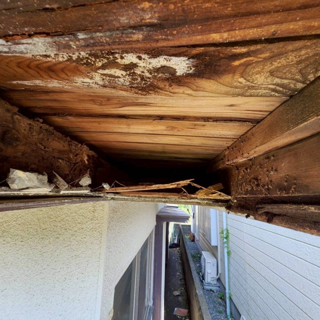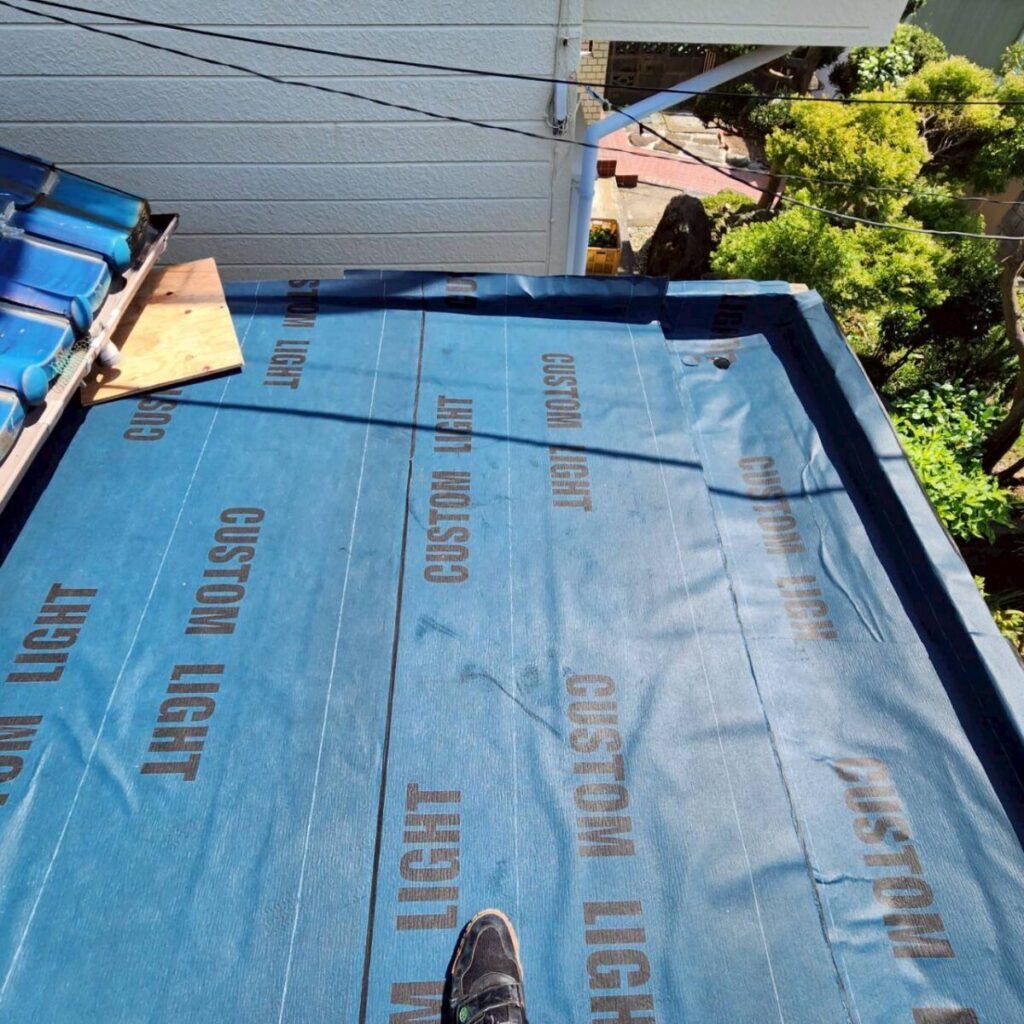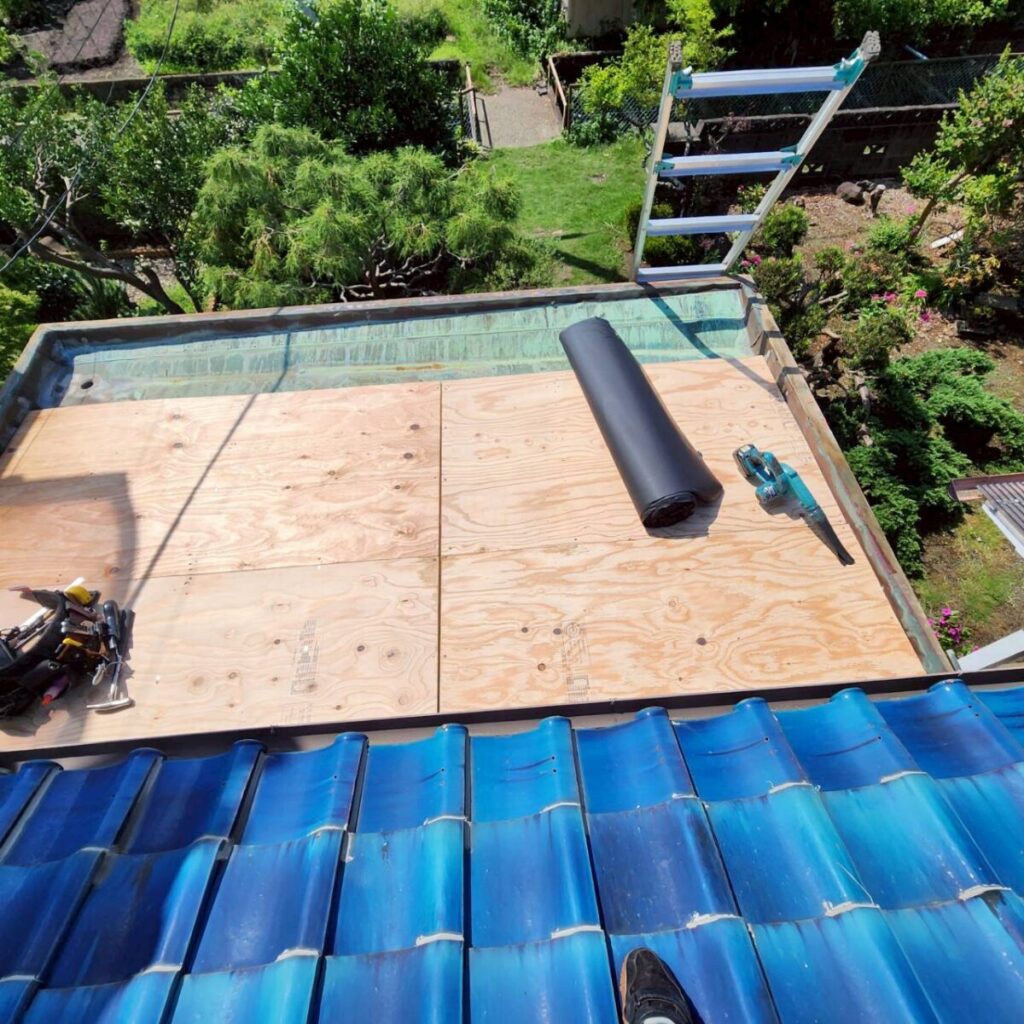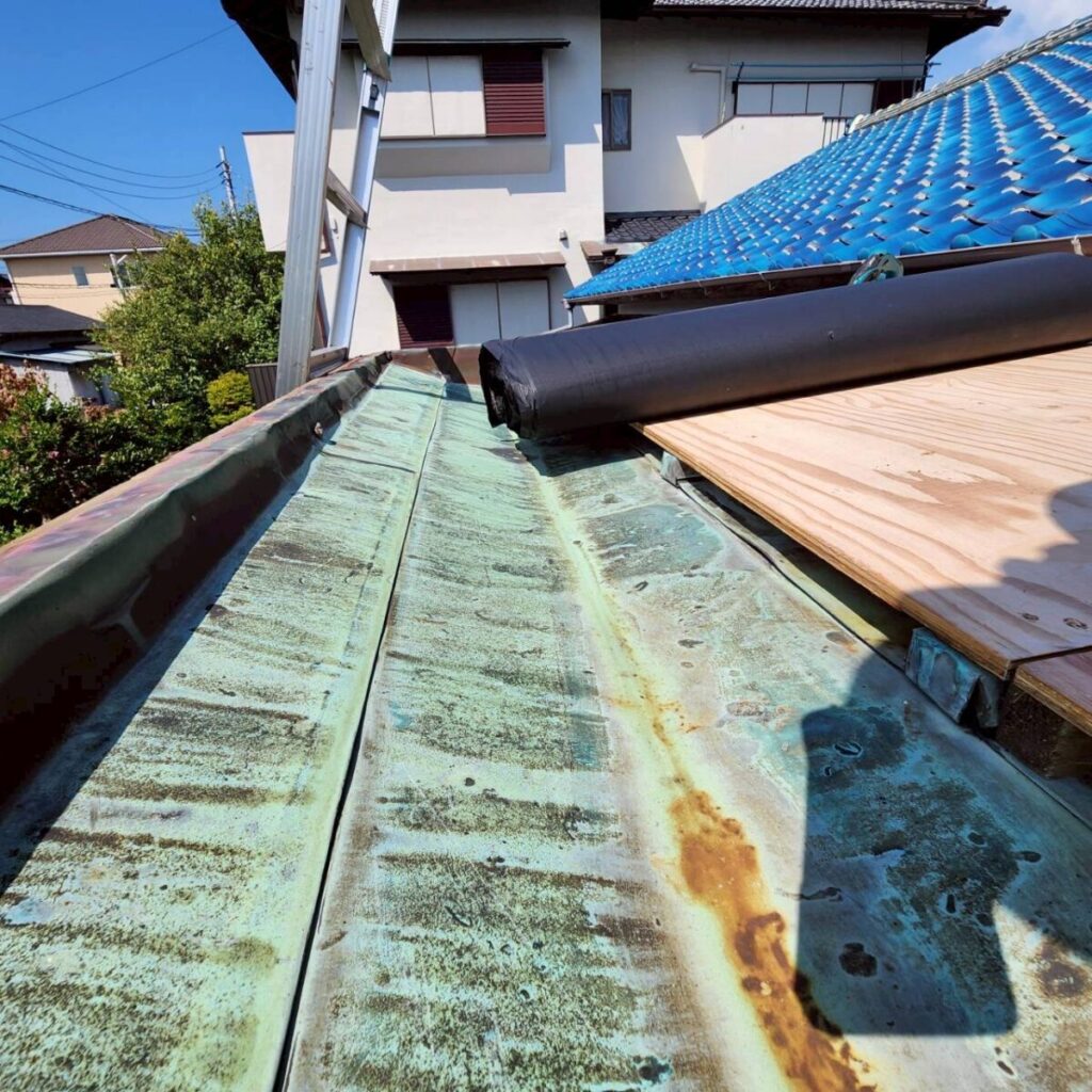 軒天部分をバラしてみて大分水が廻っている状況では有りますが、発見ご報告が比較的早かったようで腐食具合はそれほどでも有りませんでした、前回の瓦棒の桟の部分は敢えてバラさずに合板を乗せて既存の谷との段差を付けます、ここがポイントです!そして粘着層付きルーフィングでガッチリ防水します。