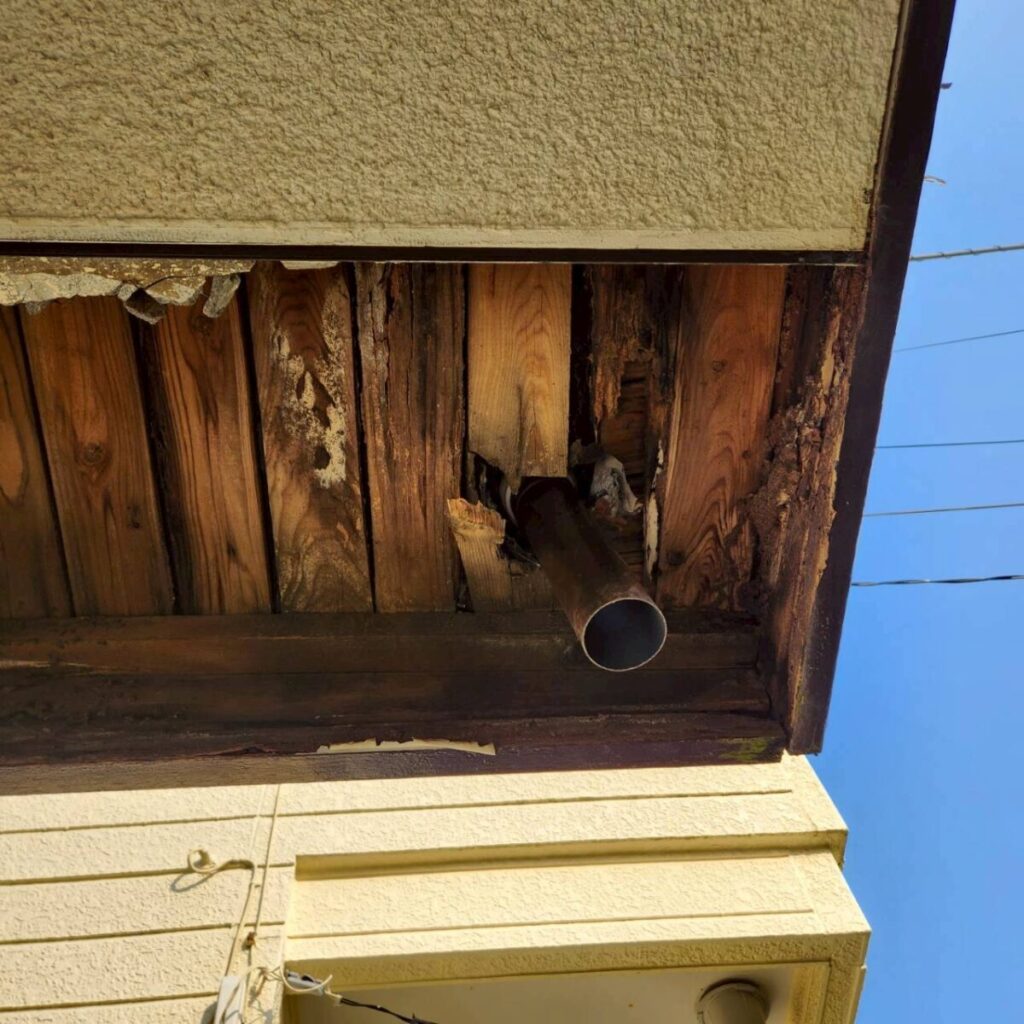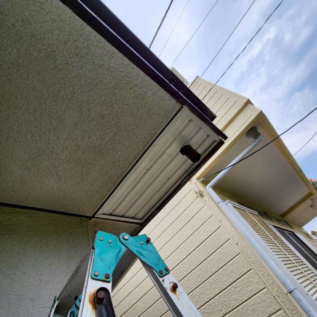 軒先部分を角波板金で復旧しポーチ升を戻して完成しました、欲を言えば左官屋さんを呼び左官工事で仕上げる事も出来ますが予算が嵩んでしまうので私共だけの板金工事で仕上げました、業者によっては木工事は大工さんにと更に分配するケースが有りますが予算的にどんどん上がるので私共は多能工として全ての作業を仕上げる事を心がけています。