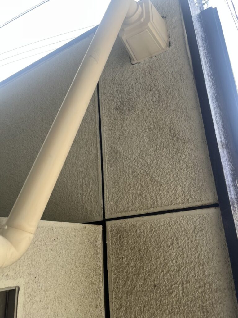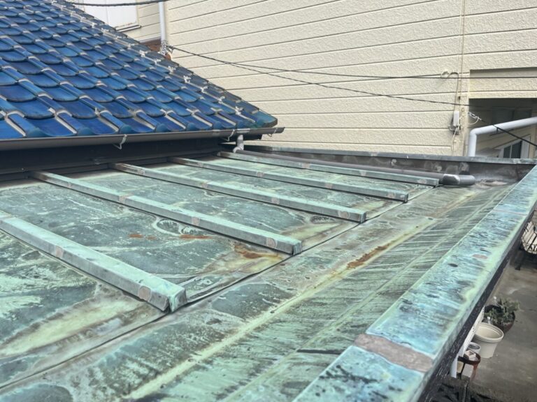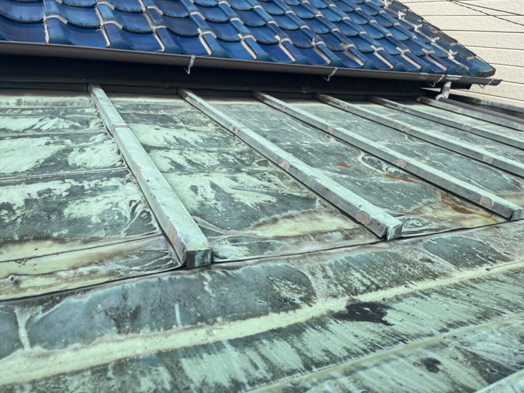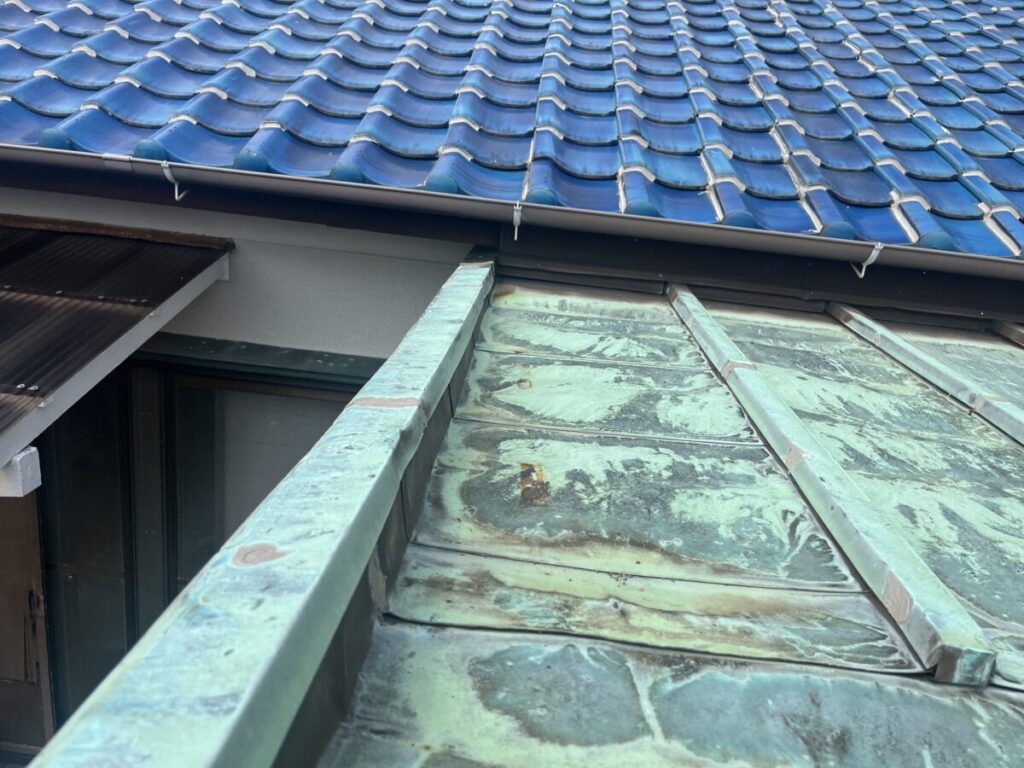 ぱっと見は銅板の屋根で穴も無く大丈夫そうな感じですが近くで見るとボコボコになっています、多分瓦屋根を修繕した業者さんが荷物の仮置き場等に養生もせずに使用したのだと思われます、瓦棒葺きなのですが谷部分との繋ぎ目が段差が無くフラットなのが気になります、実際に雨漏りしてきるのは軒天部分のポーチ升付近からだと言う事です。