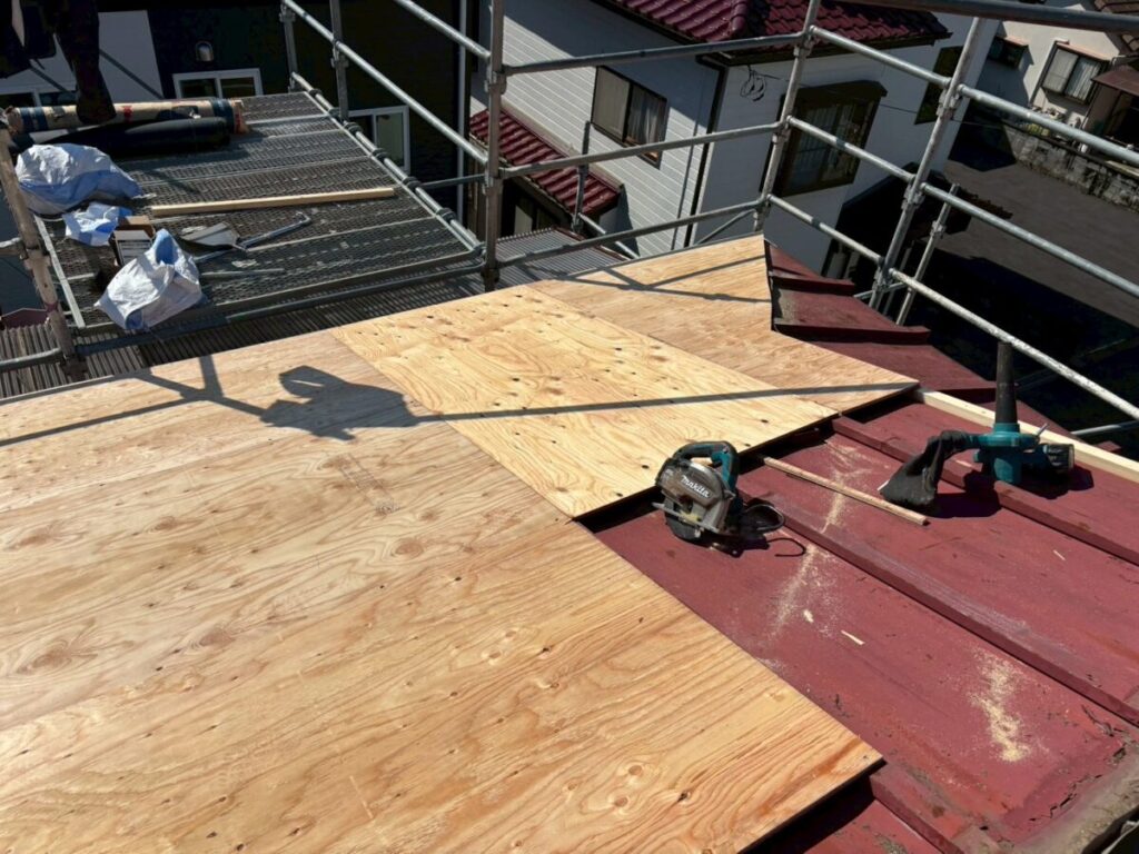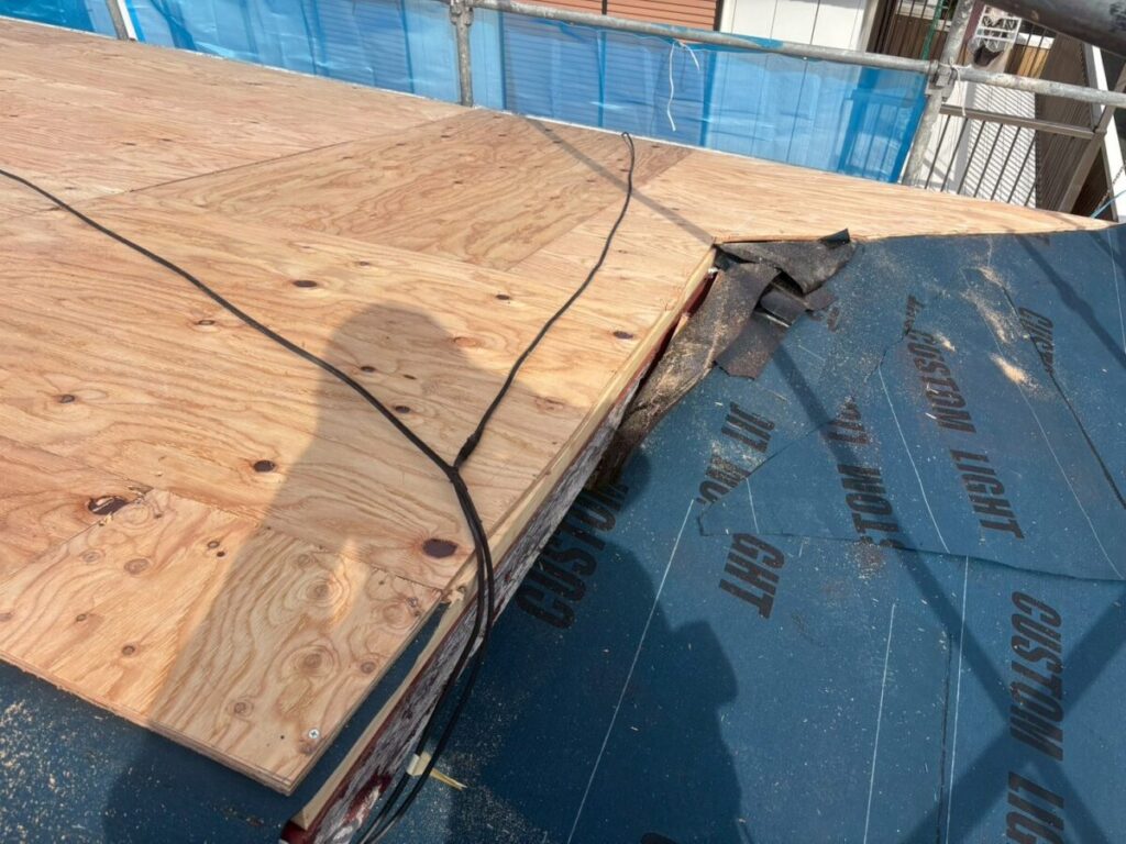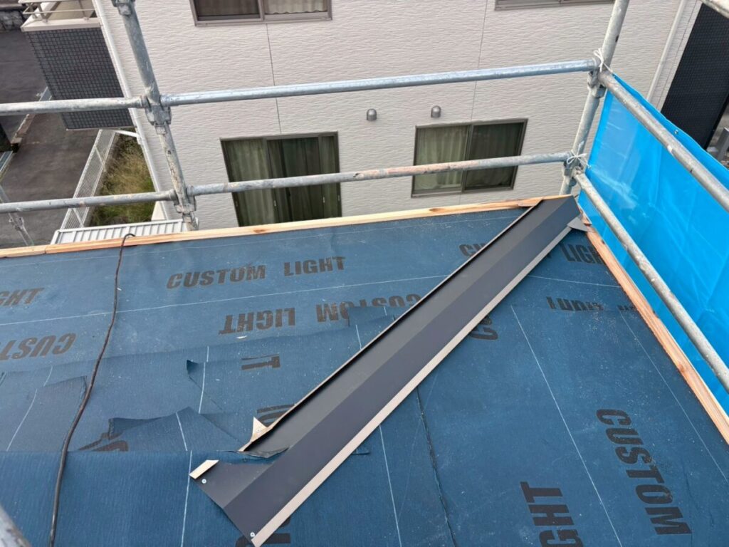 合板を木ビスでしっかりと絡ませて粘着層付きルーフィングを貼ります、勾配が2寸なので今回施工するレクトプルーフは一寸五分から対応可能なので大丈夫なのですが、適応勾配との差が五分しかないので念のため粘着層付きルーフィングを貼ります。