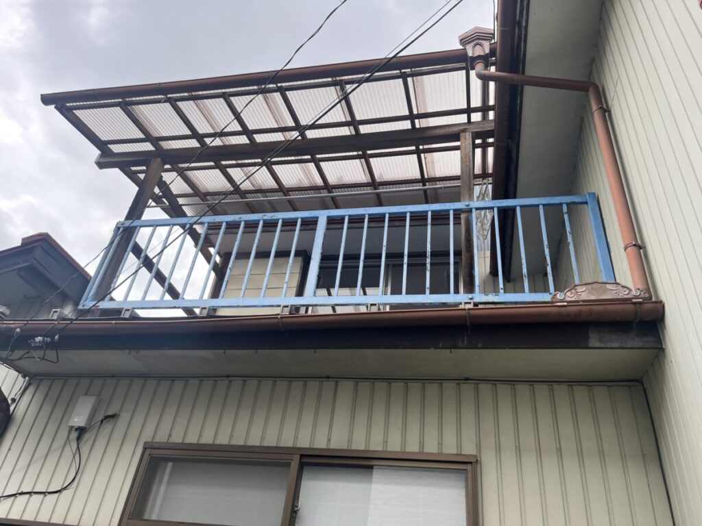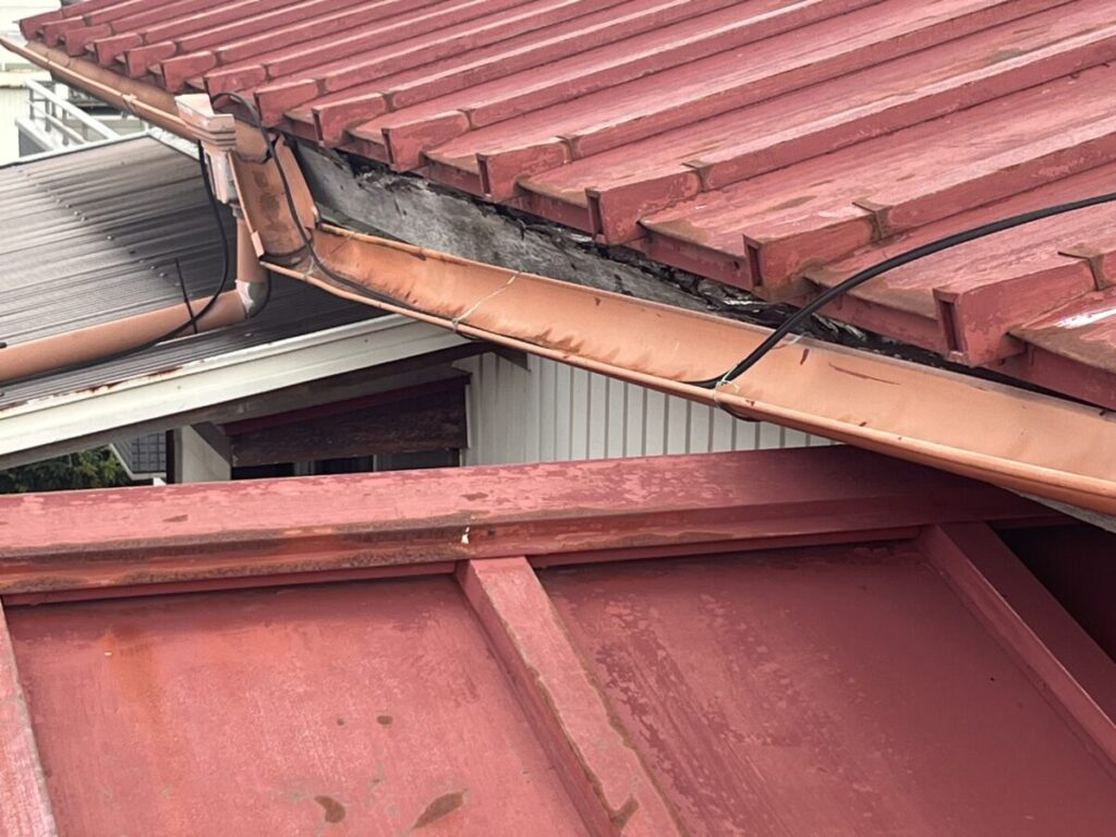 今回は一階のバルコニーの下の部分からの雨漏りと言う事で伺いましたバルコニー部分の屋根が壊れているのかと思いましたが、現場で見てみるとどこも悪そうな箇所は無く、ふと2階の屋根部分をみたら雨樋が壊れていましたので、壊れた雨樋から大量の雨水がバルコニーの掃き出し窓にかかるのが原因かと思われ、雨樋を直せば良いのですが雨樋を支える鼻隠し板が雨漏りにより壊れてましたので先ず屋根の雨漏りを直し鼻隠し板を直し雨樋を取り替えると言う作業になりました。