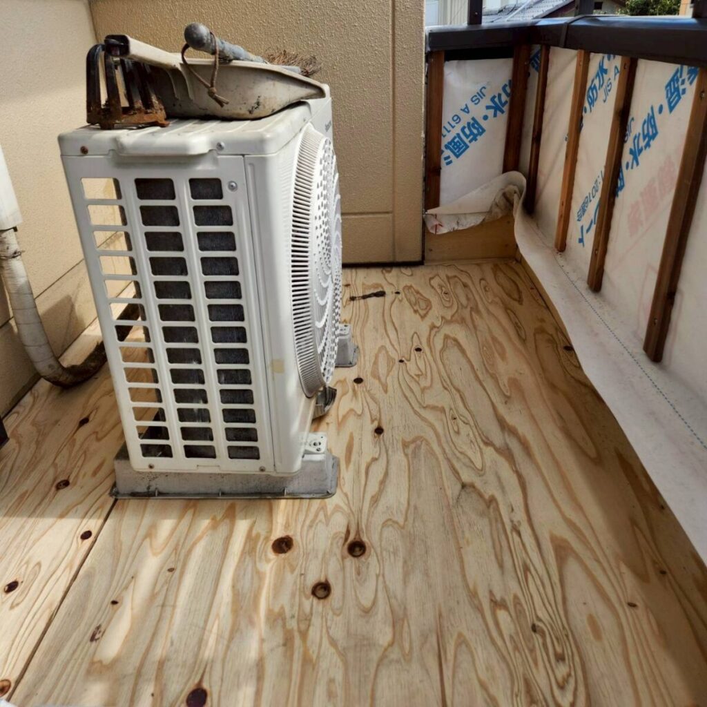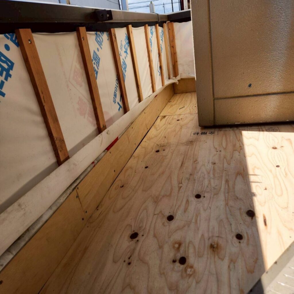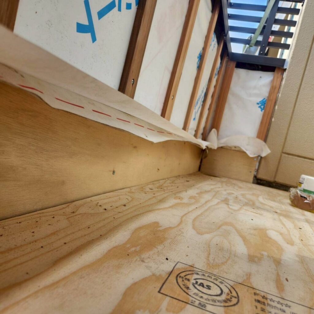 このような場合、悪い下地の上にさらに防水を重ねても、根本的な解決にはなりません。そのため今回は、下地からしっかりとやり直す形で工事を進めました。床には合板をしっかりと貼り、立ち上がり部分についても合板で確実に下地を作り直した上で、タックシート防水を施工しました。