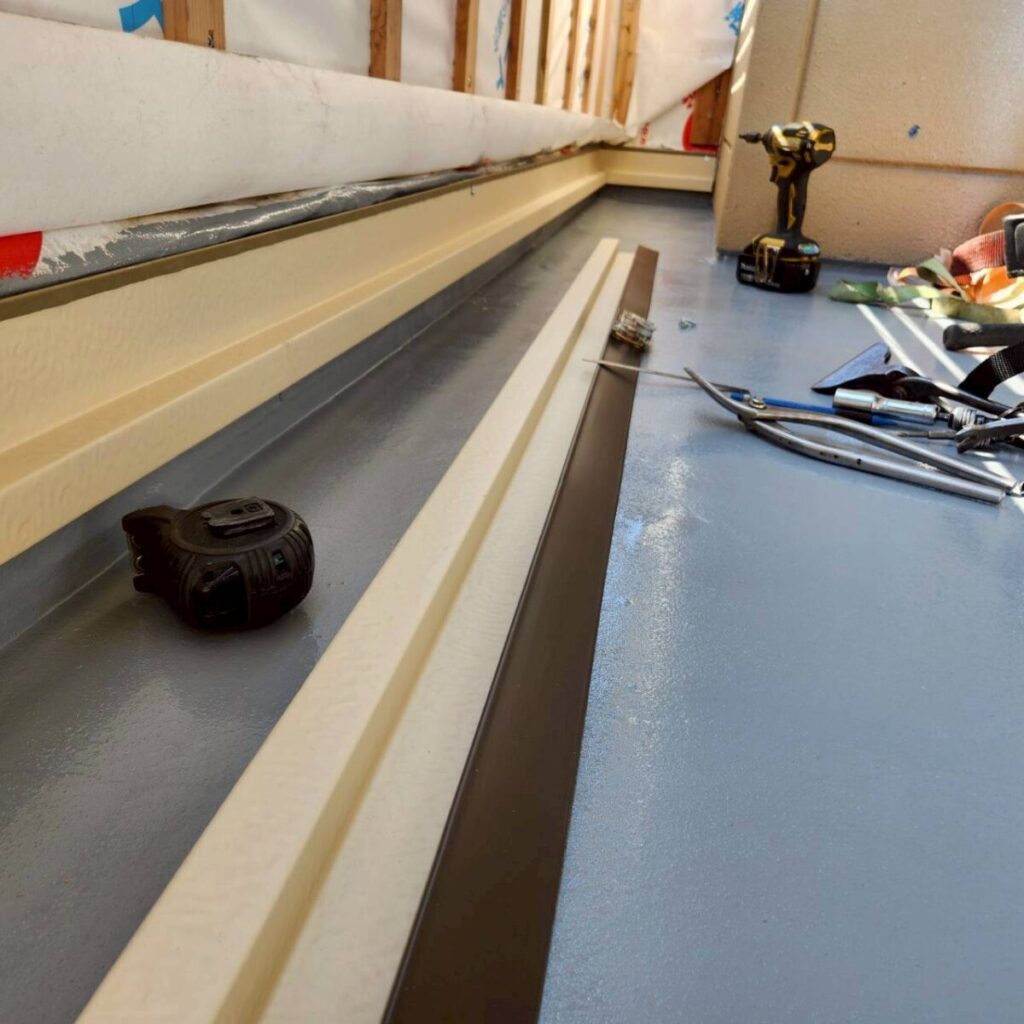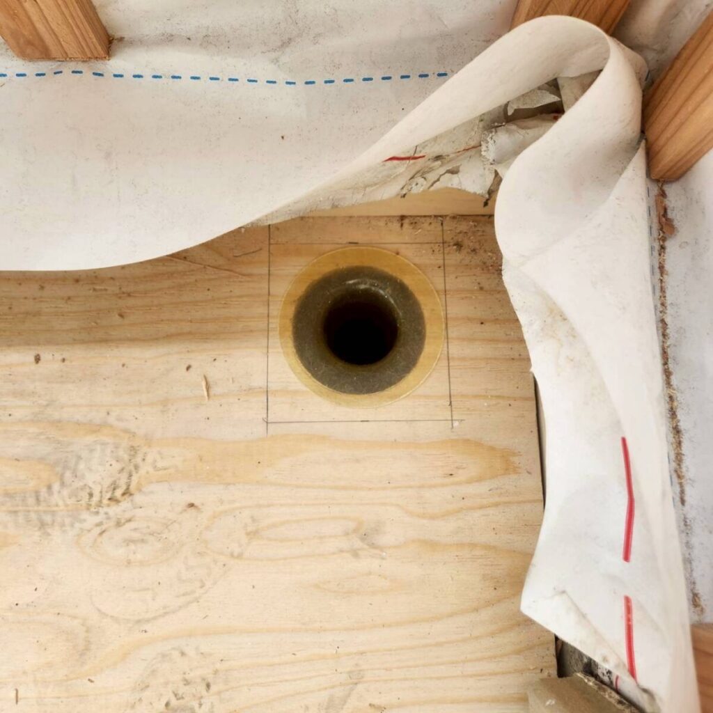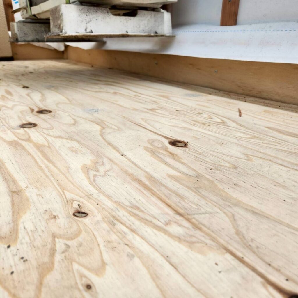 このような場合、悪い下地の上にさらに防水を重ねても、根本的な解決にはなりません。そのため今回は、下地からしっかりとやり直す形で工事を進めました。床には合板をしっかりと貼り、立ち上がり部分についても合板で確実に下地を作り直した上で、タックシート防水を施工しました。