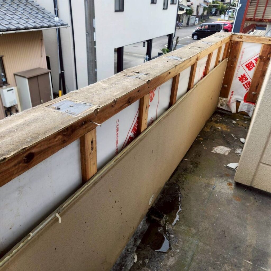 まず最初に行ったのは、アルミ笠木下の外壁の解体です。この作業では、外壁だけでなく、アルミ笠木や手すりも一度取り外して進めていきます。