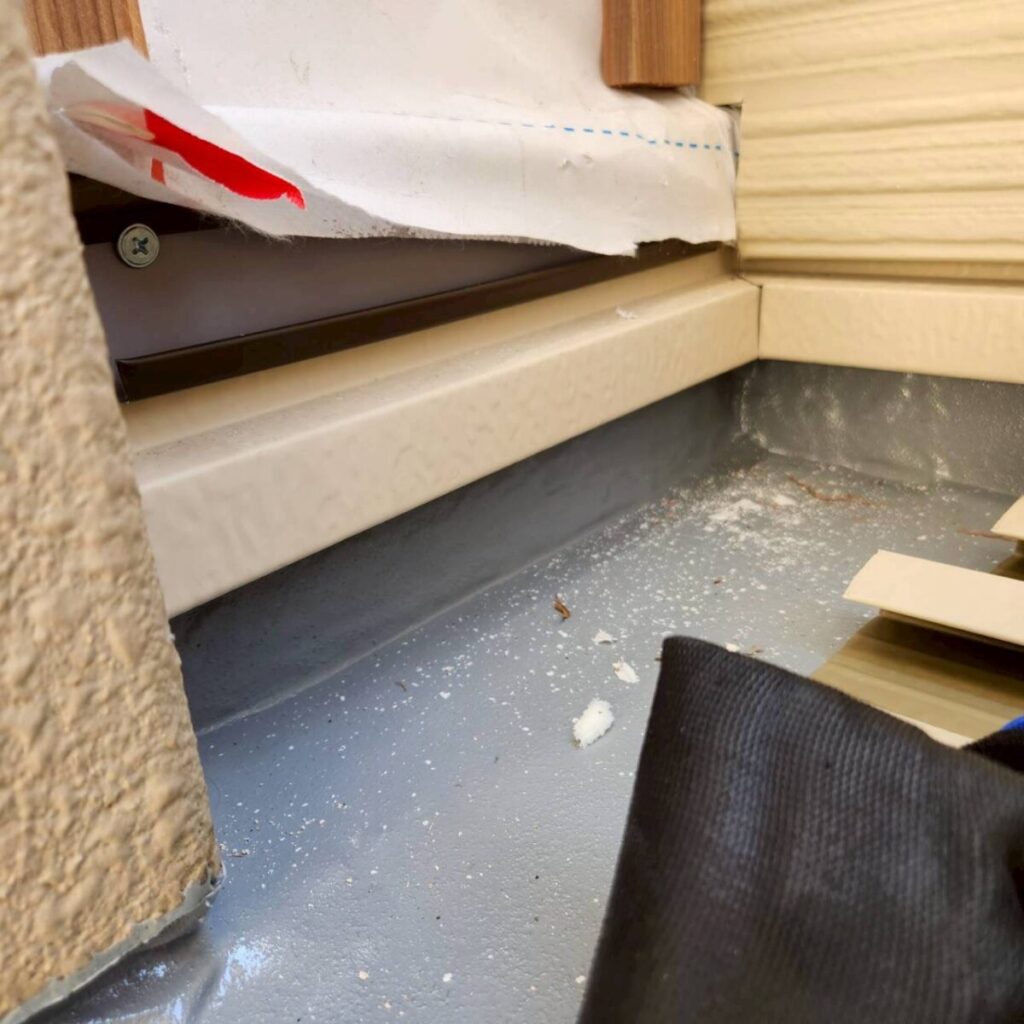 今回の雨漏り修理では、この工程がとても重要でした。なぜなら、もともとの防水の立ち上がりも、過去に修理された防水の立ち上がりも、どちらも適切な納まりとは言えない状態だったからです。さらに今回は、床からの防水の立ち上がりを今までよりもしっかり大きく取りたかったため、表面だけを直すのではなく、一度解体して下地から確認する必要がありました。