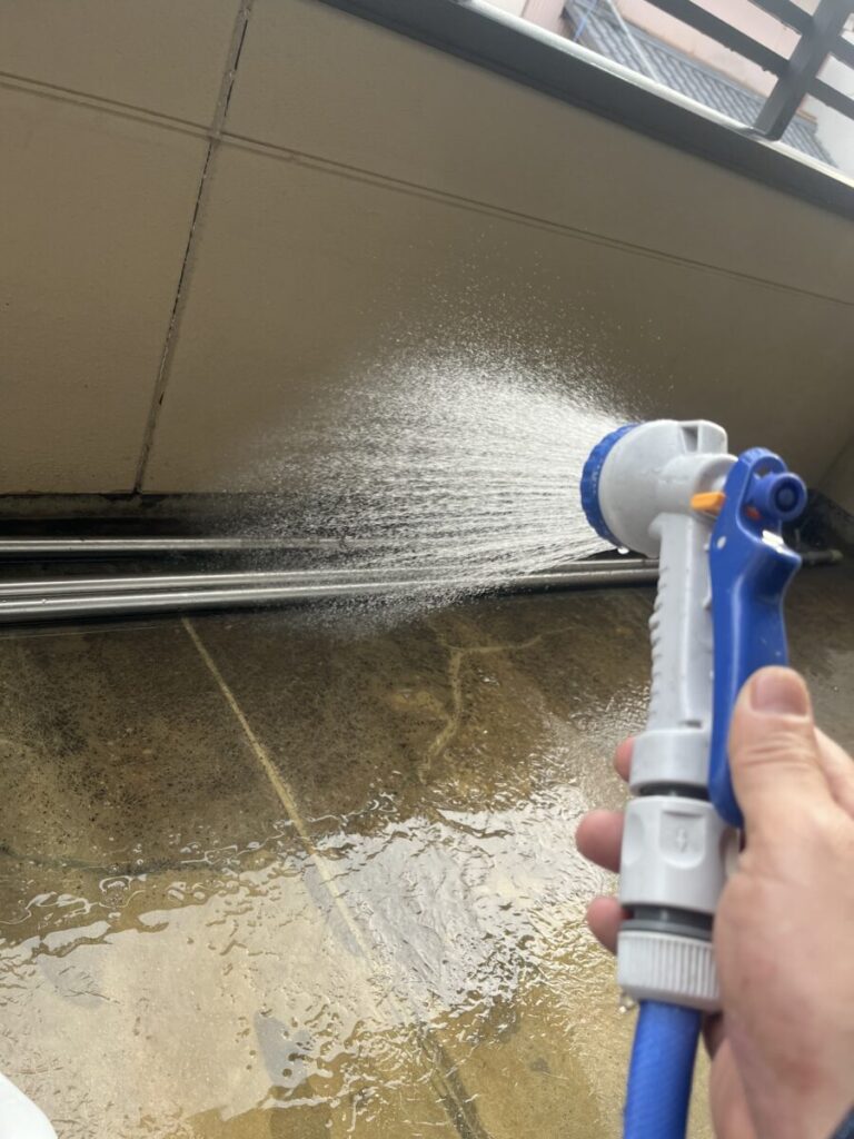 ただ、気になる部分が1か所ありました。それが、手すりの付いているアルミ笠木部分です。ここが雨漏りの原因になっているかどうかは非常に判断が難しく、散水調査をしても断定しづらい場所でした。実際、笠木の内側にホースで水をかけた際には水が漏れたのですが、その水は笠木下だけでなく床の防水層にもかかってしまうため、原因を完全に切り分けることができませんでした。