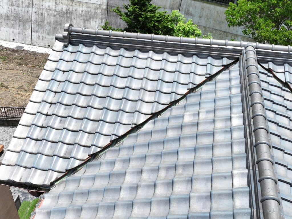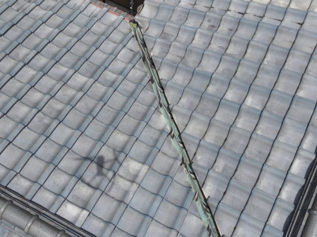 まずは屋根全体の状態を把握するため、ドローンを使用して上空から詳しく点検を行いました。地上からでは確認できない細かな部分までチェックしたところ、銅製の谷板金に複数箇所の穴あきを確認しました。銅板は経年により酸性雨や雨水の影響を受けやすく、長年の使用で腐食し穴が空いてしまうことがあります。