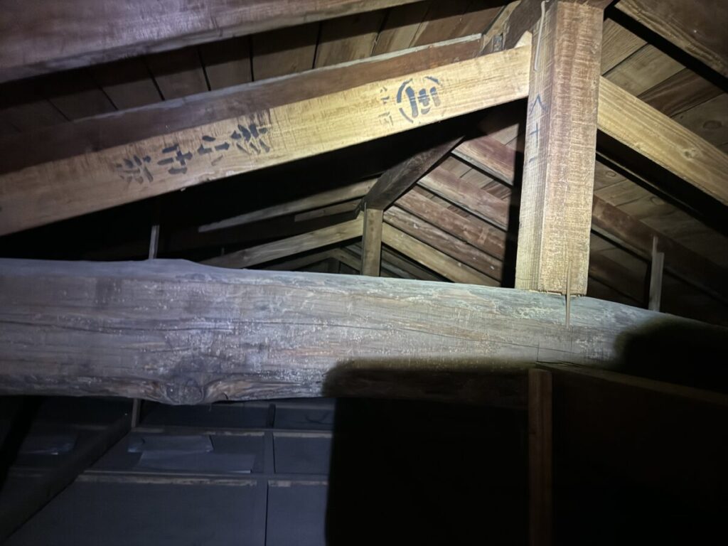 谷板金に穴が空いている場合、そこから雨水が浸入し雨漏りの原因になるケースが多いため、まずはこの箇所が原因かどうかを確認するため室内および屋根裏も点検させていただきました。