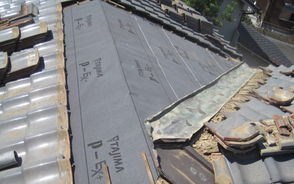 棟廻りの下葺き材を新しくする場合は一度棟や桟瓦を撤去してから新しい改質アスファルトルーフィングを施工します。この瓦は再利用しますので割らないように丁寧に撤去していきます。