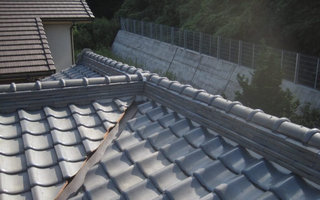 桟瓦(平部の瓦)を施工したら棟を積みなおしていきます。棟の積み直しは左右の屋根面が合わさる部分にナンバンを詰め込みのし瓦を積んでと交互に積み上げ最後に冠瓦を被せたら完成です。棟はのし瓦の積む段数で施工難易度が変わっていきます。屋根瓦の葺き直しは瓦の下の下葺き材を交換するため他のカバー工法や葺き替え工事とは違い、施工前と施工後の見た目の変化がない工事になりますが実際には雨漏りが止まりお施主様に安心していただける工事です。