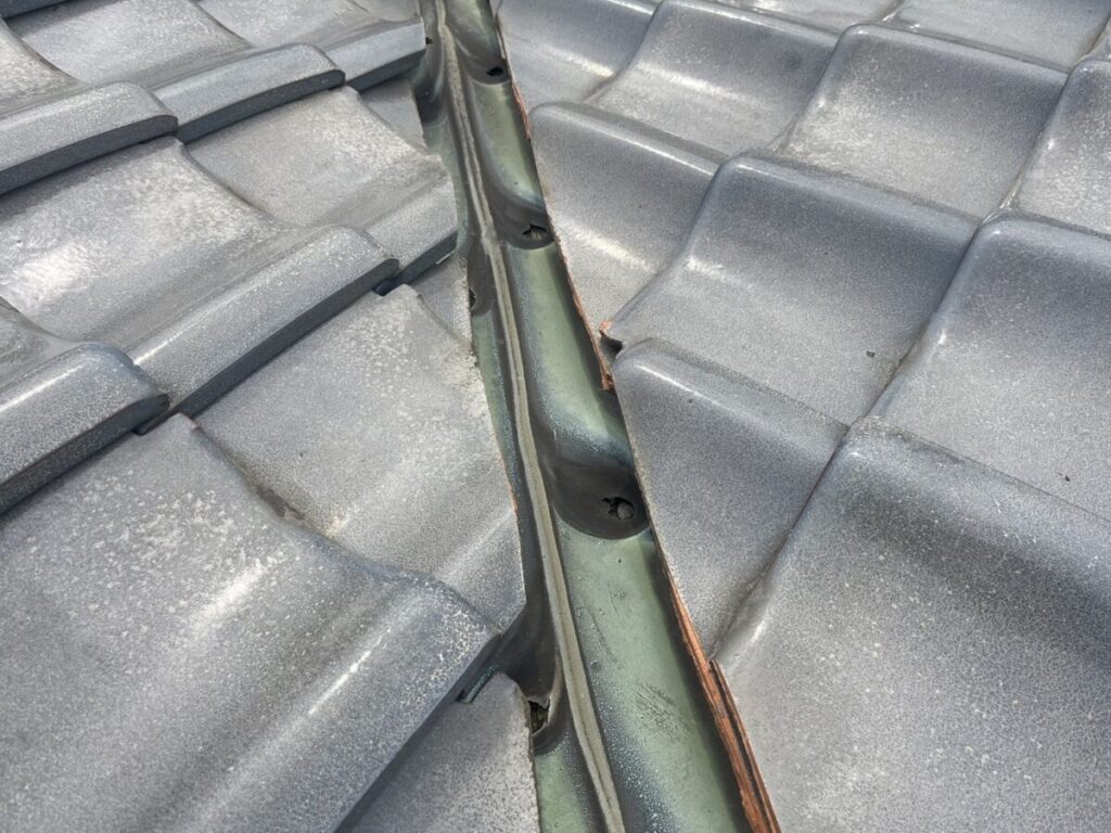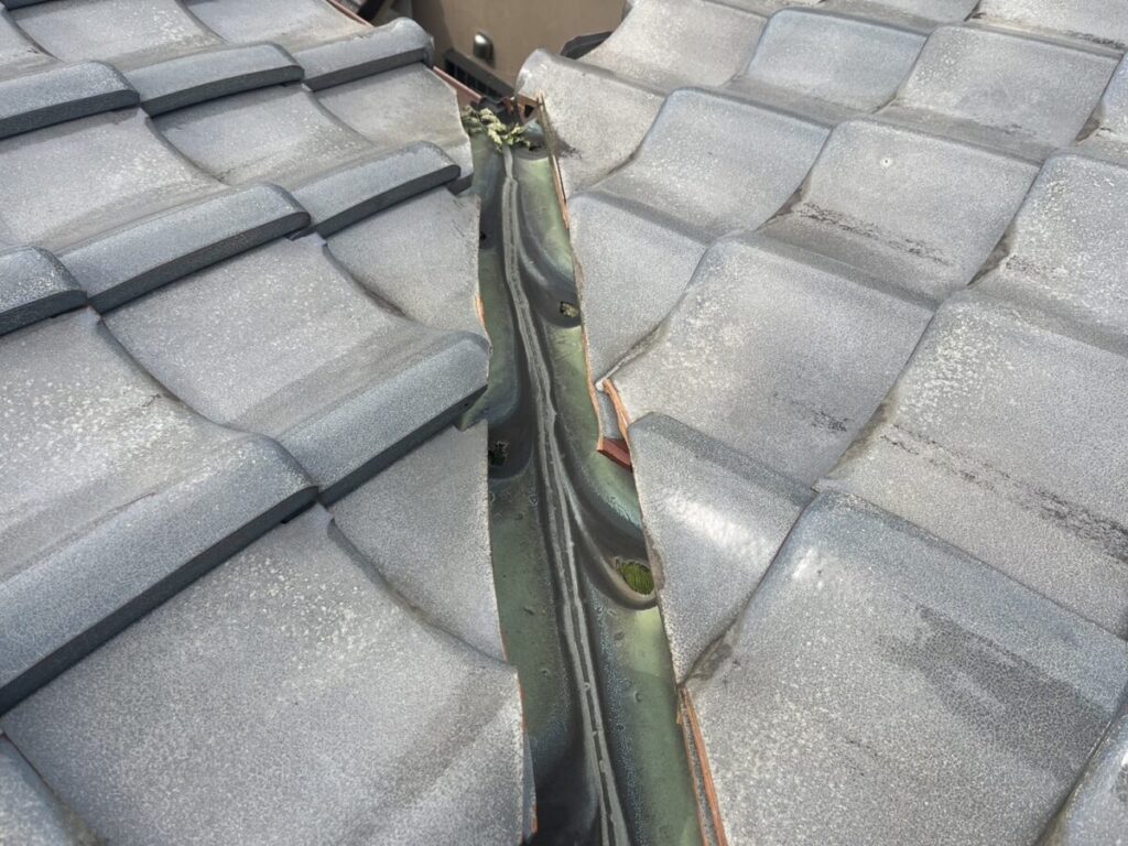 穴の開いた谷板金の廻りにある瓦を左右2~3枚づつよけて、棟も谷に干渉している部分があるので一度解体して谷が入る余裕を確保してから新しい谷を設置していきます。この谷板金は現場で加工して寸法通り取り付けます。