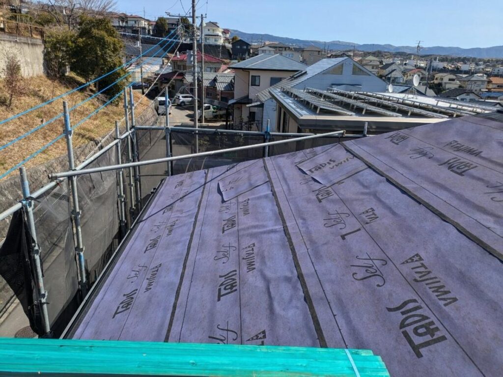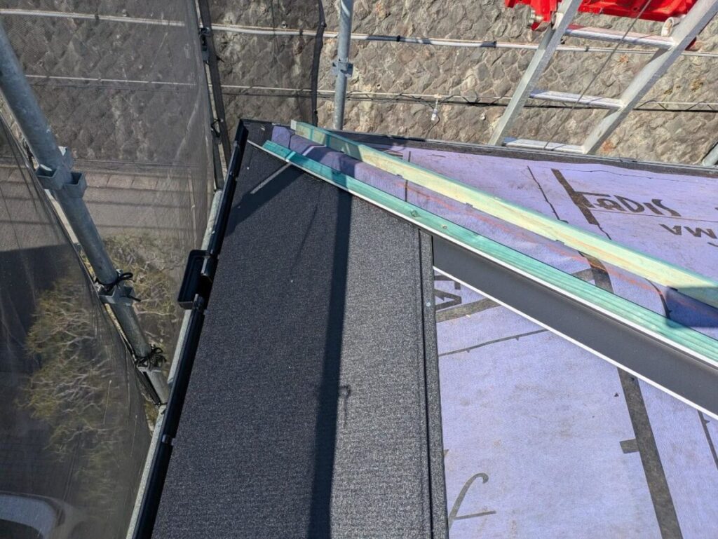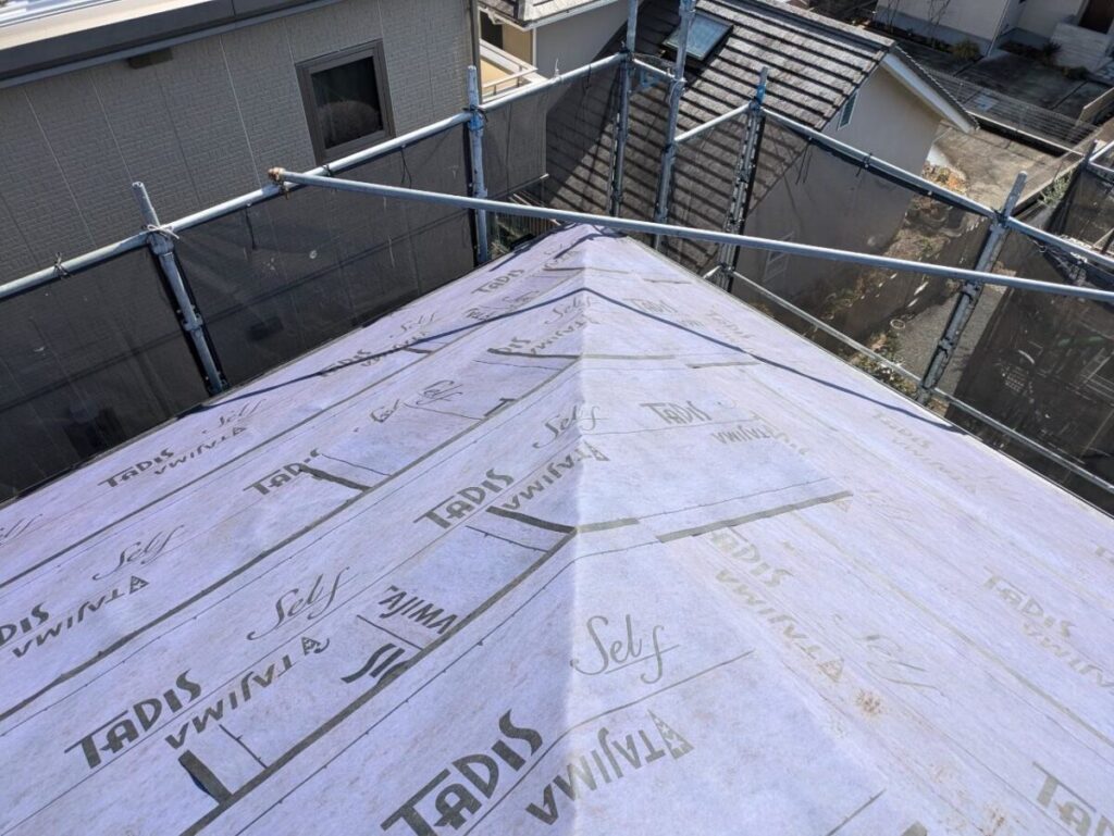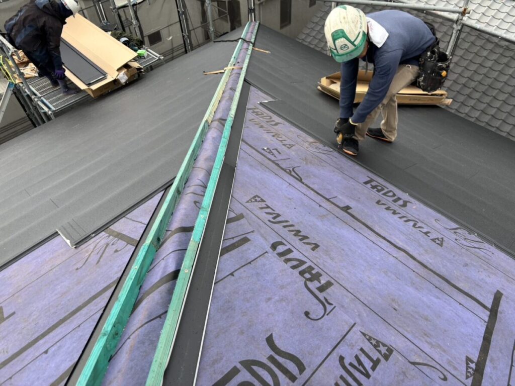 既存の棟板金と棟下地を撤去したら軒先に軒先水切りを取り付けます。粘着層の付いたルーフィングを軒先の先端から張っていきます。