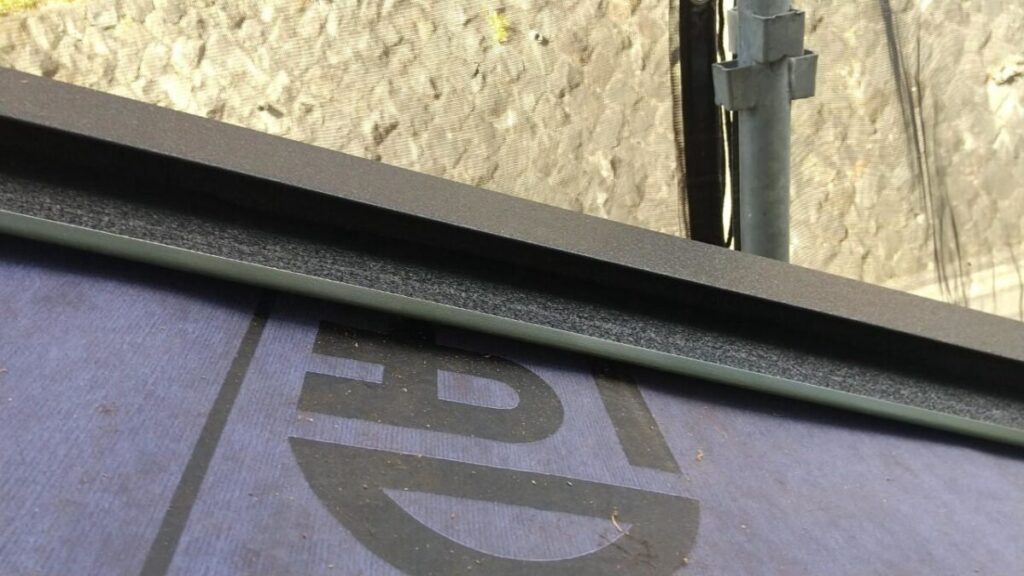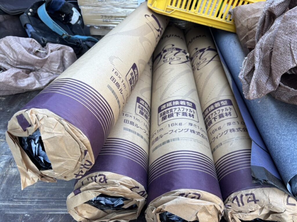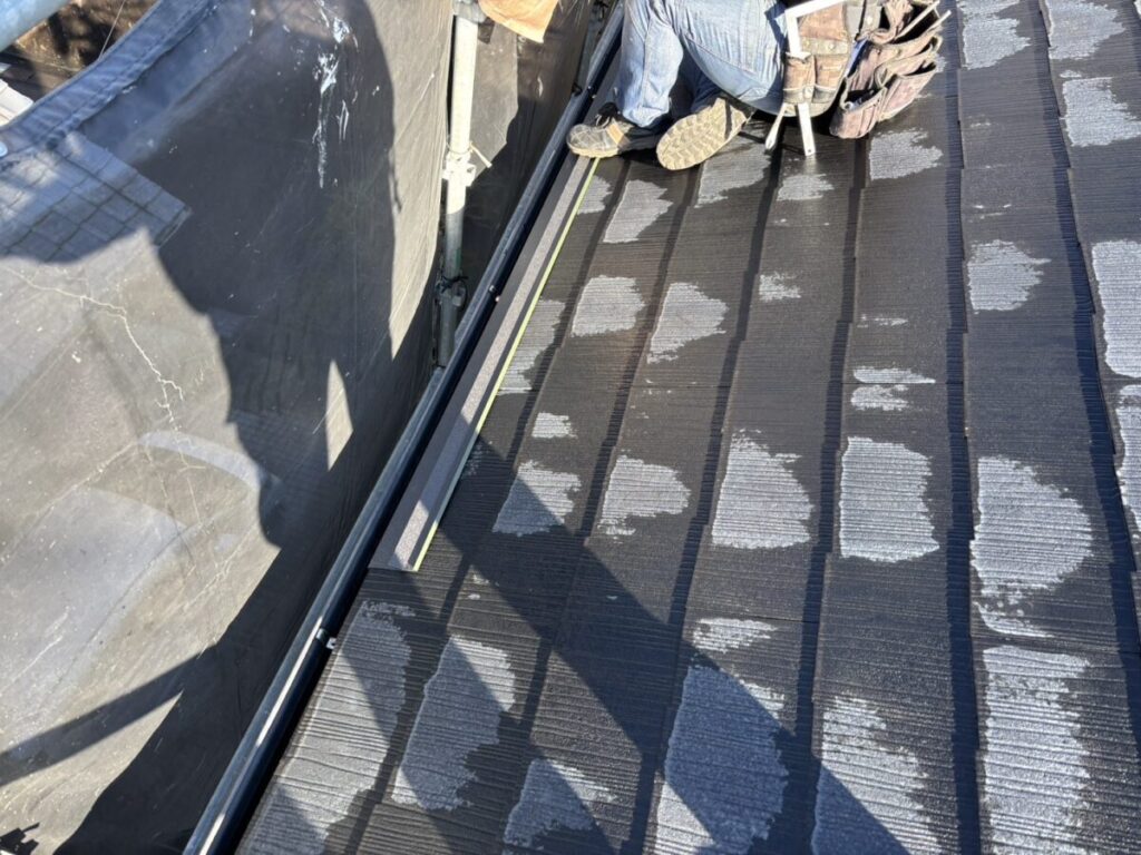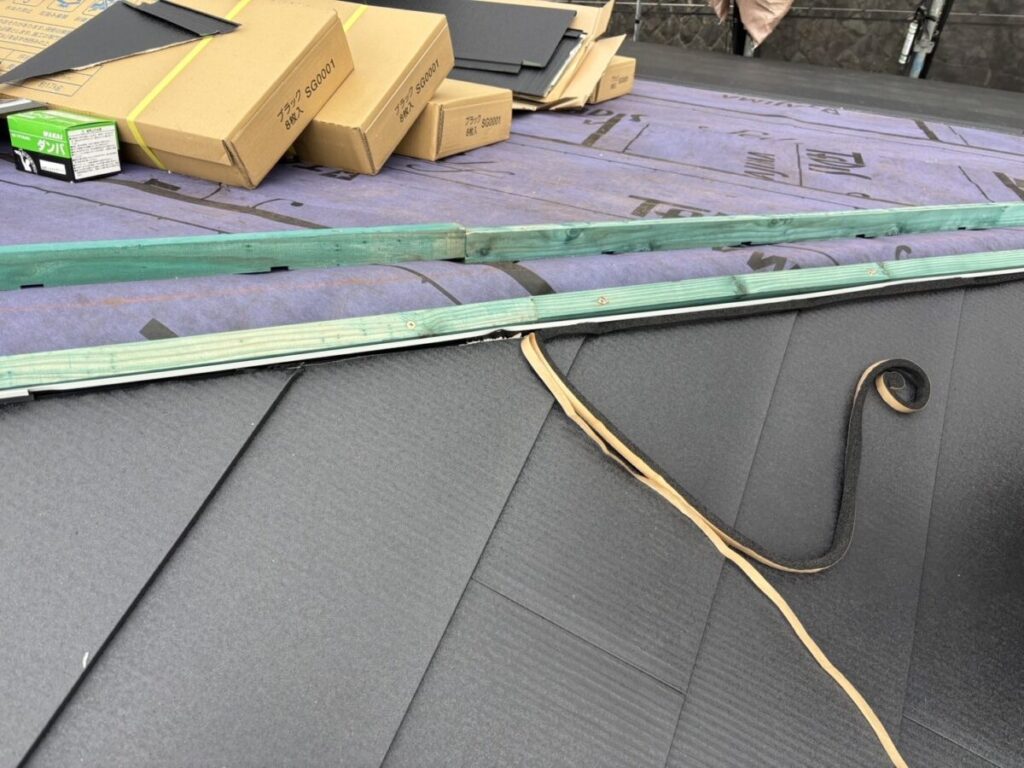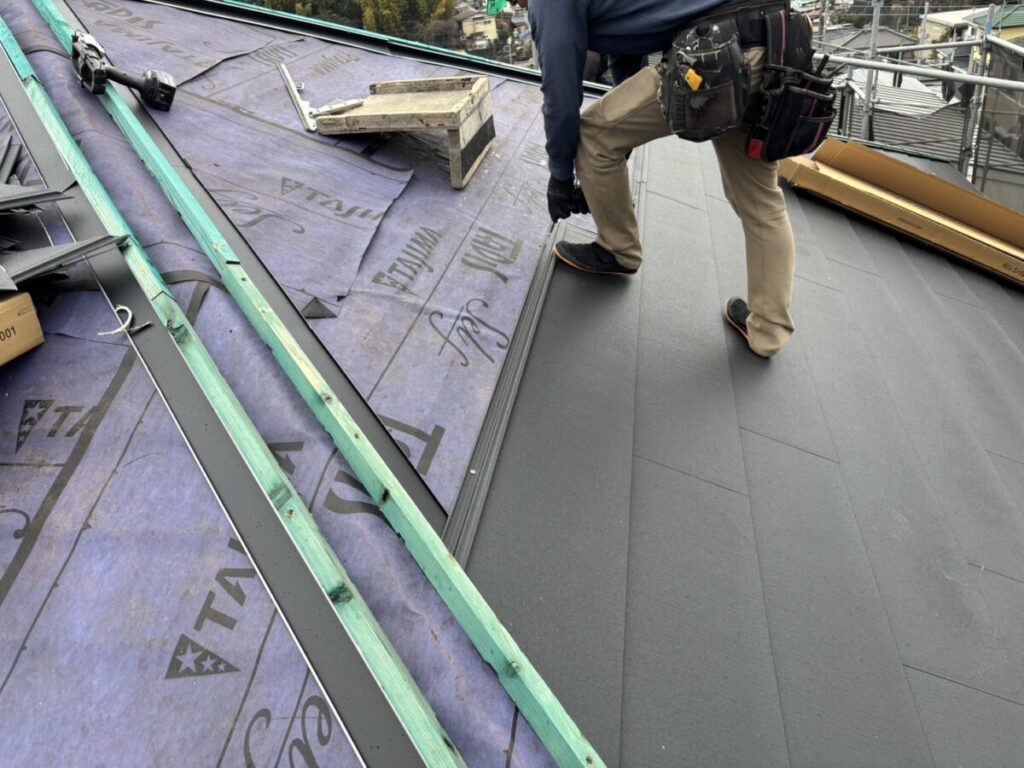 既存の棟板金と棟下地を撤去したら軒先に軒先水切りを取り付けます。粘着層の付いたルーフィングを軒先の先端から張っていきます。