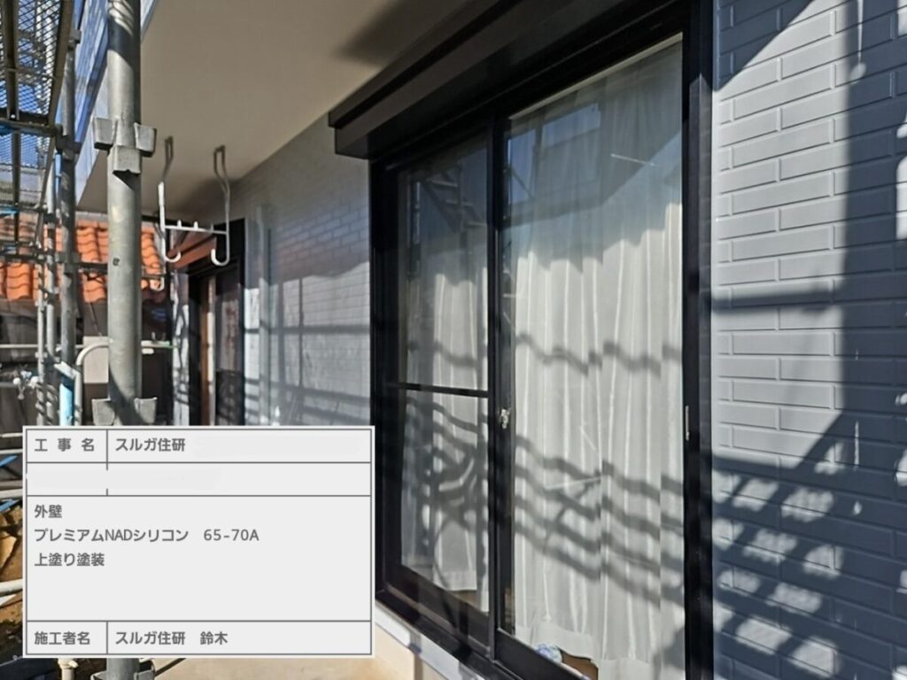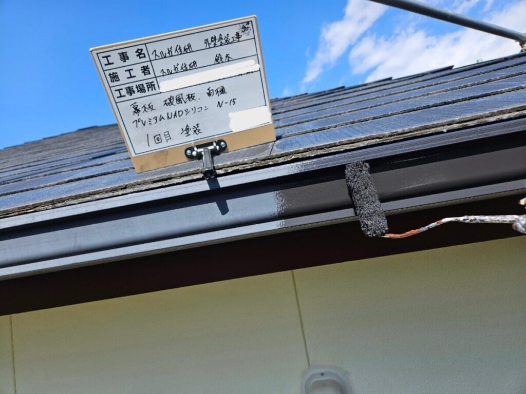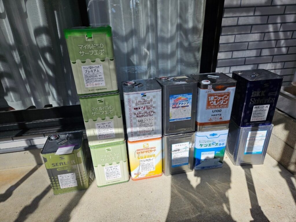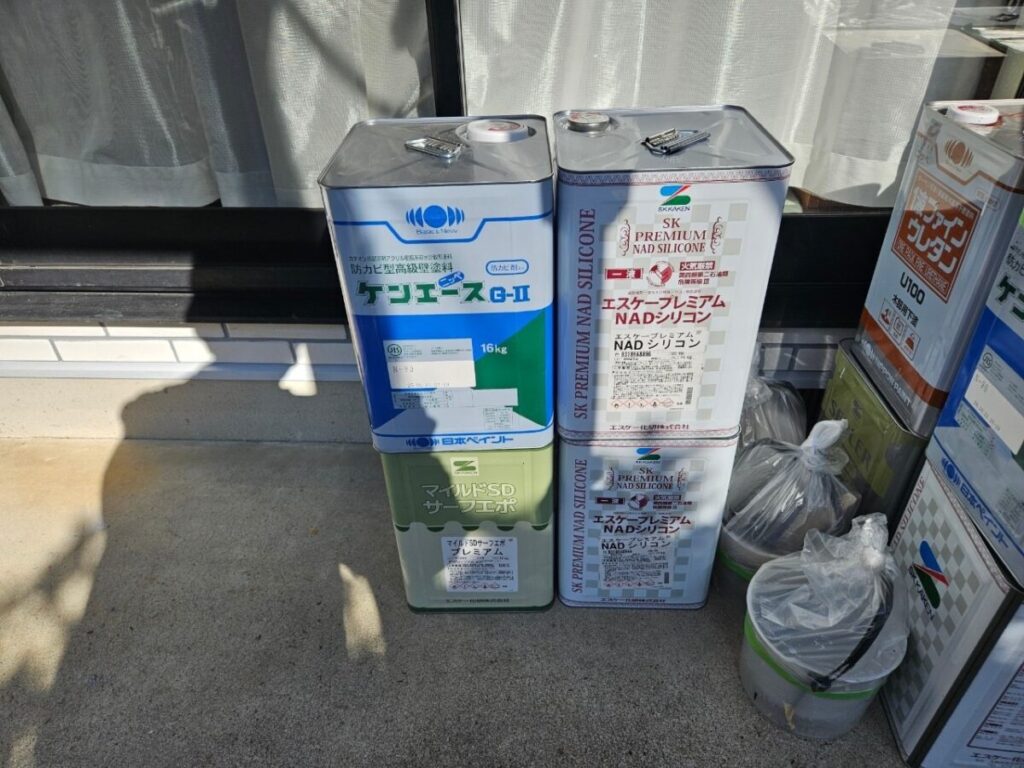 今回の塗料はエスケー化研のラジカル制御型塗料の弱溶剤(油性)エスケープレミアムNADシリコンで塗装しました。屋根工事の前に外壁塗装をおこない、高圧洗浄→シーリング→塗装→屋根工事の順で進めていきましたが工期は約一か月ほどかかります。