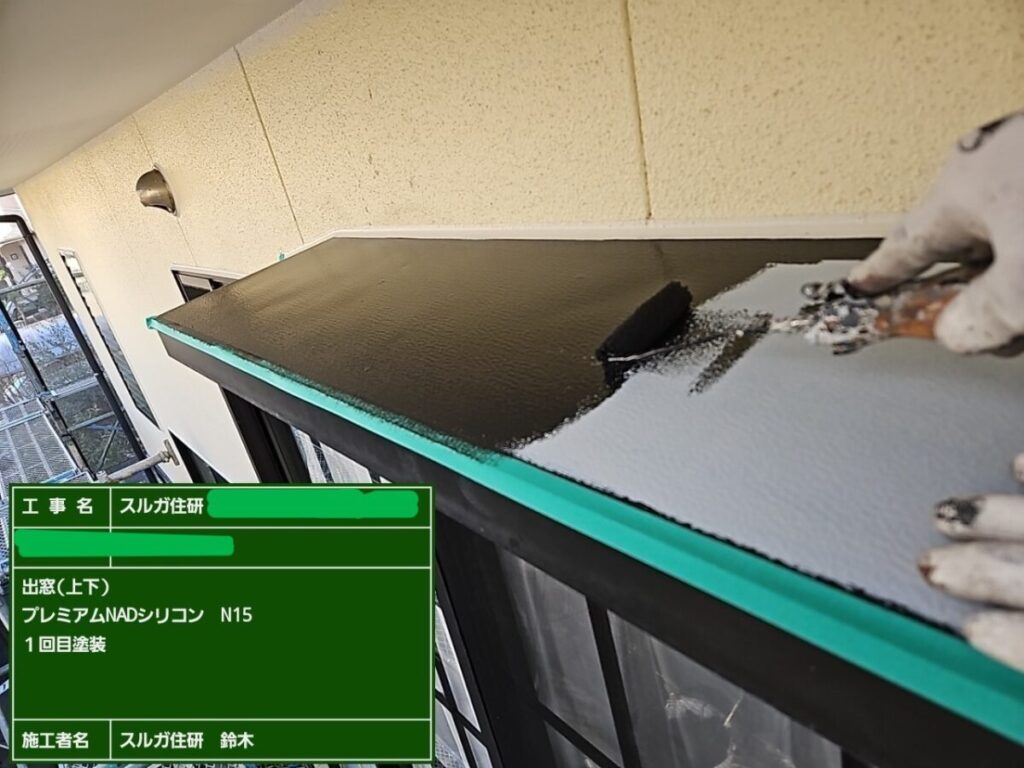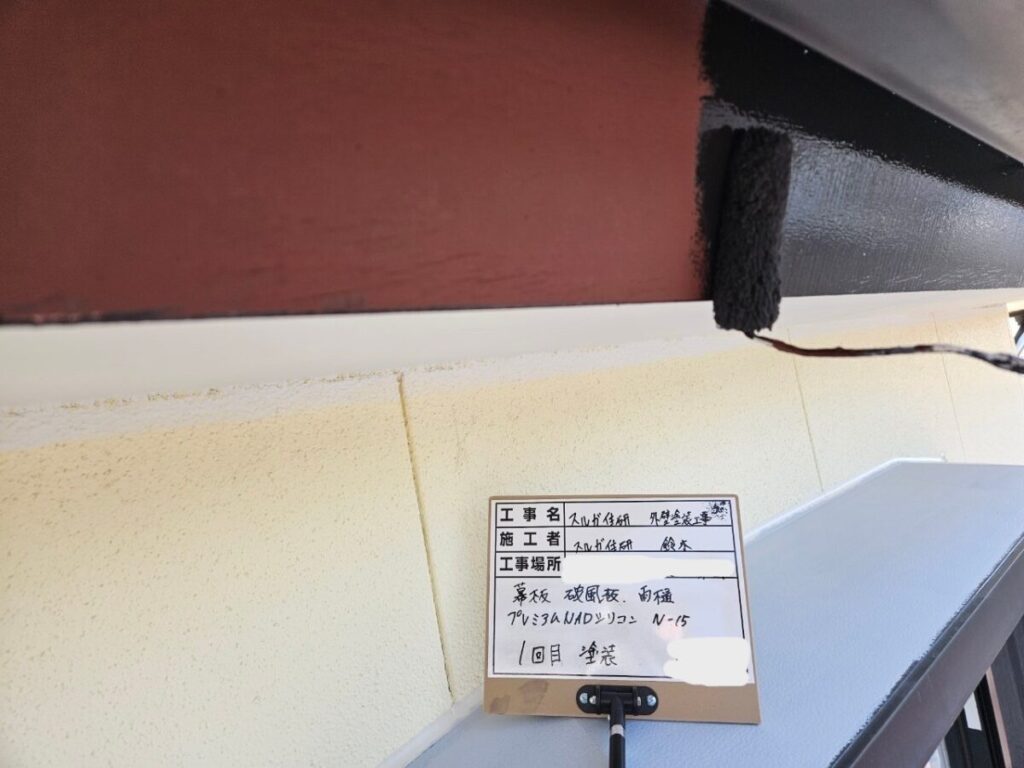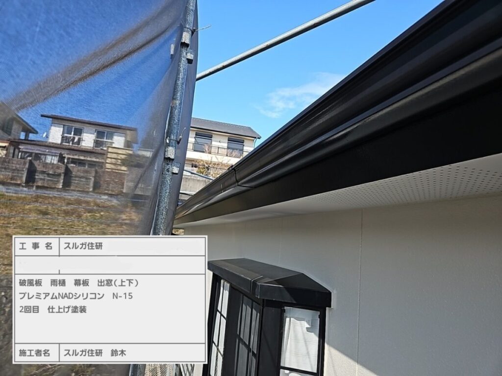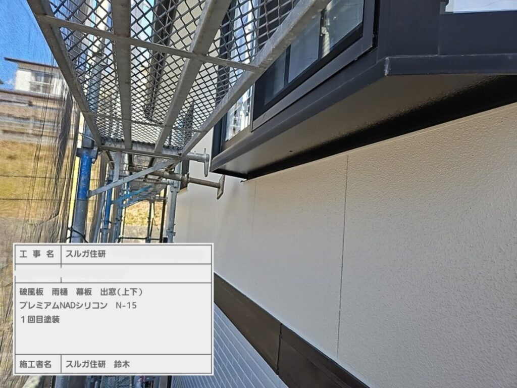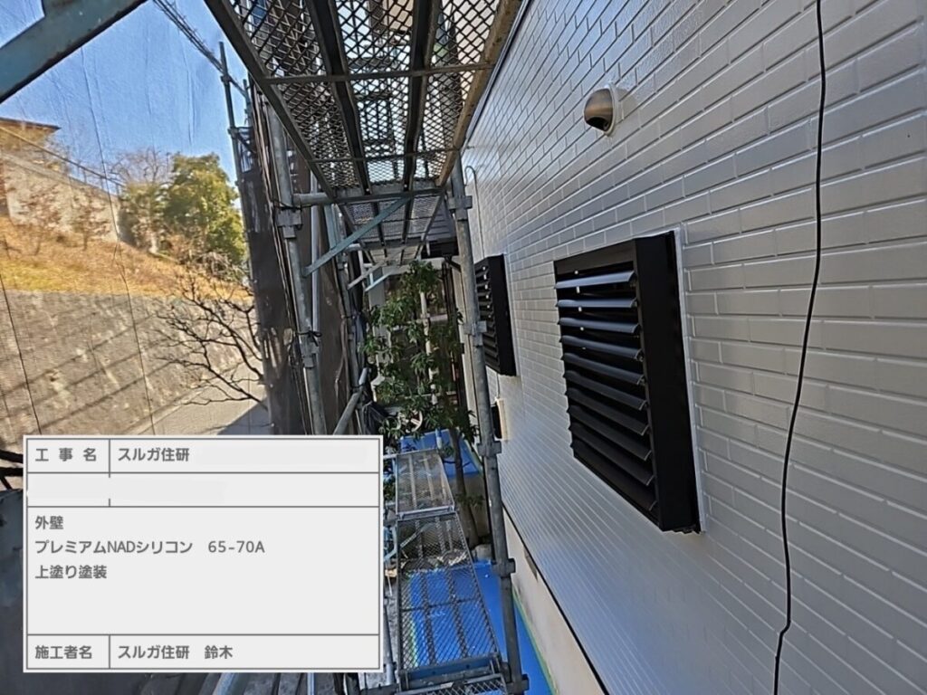 今回の塗料はエスケー化研のラジカル制御型塗料の弱溶剤(油性)エスケープレミアムNADシリコンで塗装しました。屋根工事の前に外壁塗装をおこない、高圧洗浄→シーリング→塗装→屋根工事の順で進めていきましたが工期は約一か月ほどかかります。