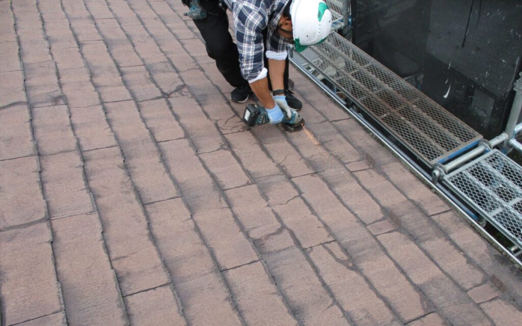 化粧スレートの上にカバー工法 天然石付きガルバリウム鋼板のセネターを施工工程