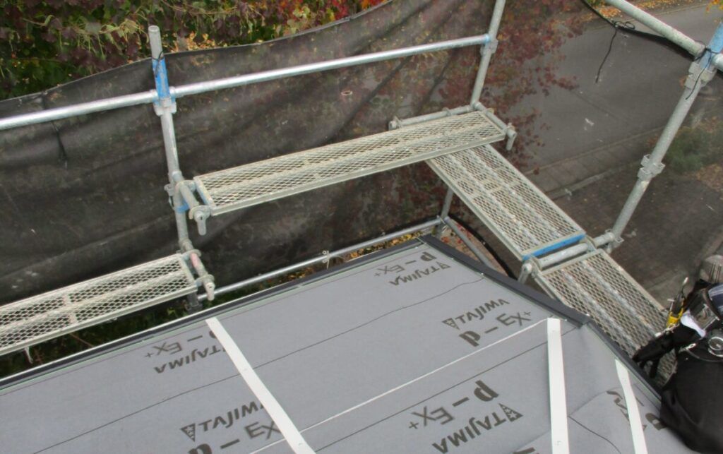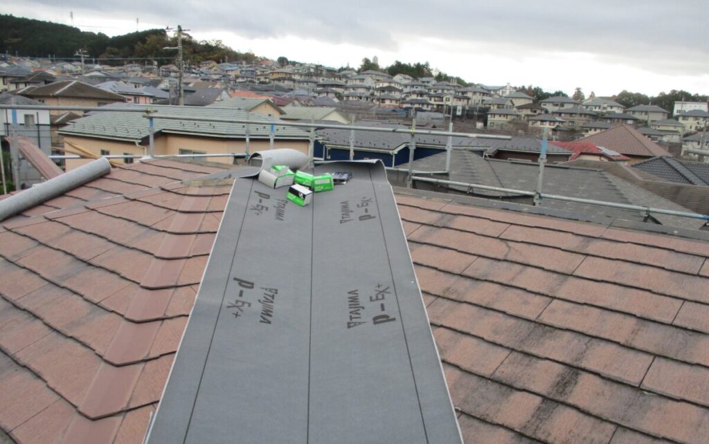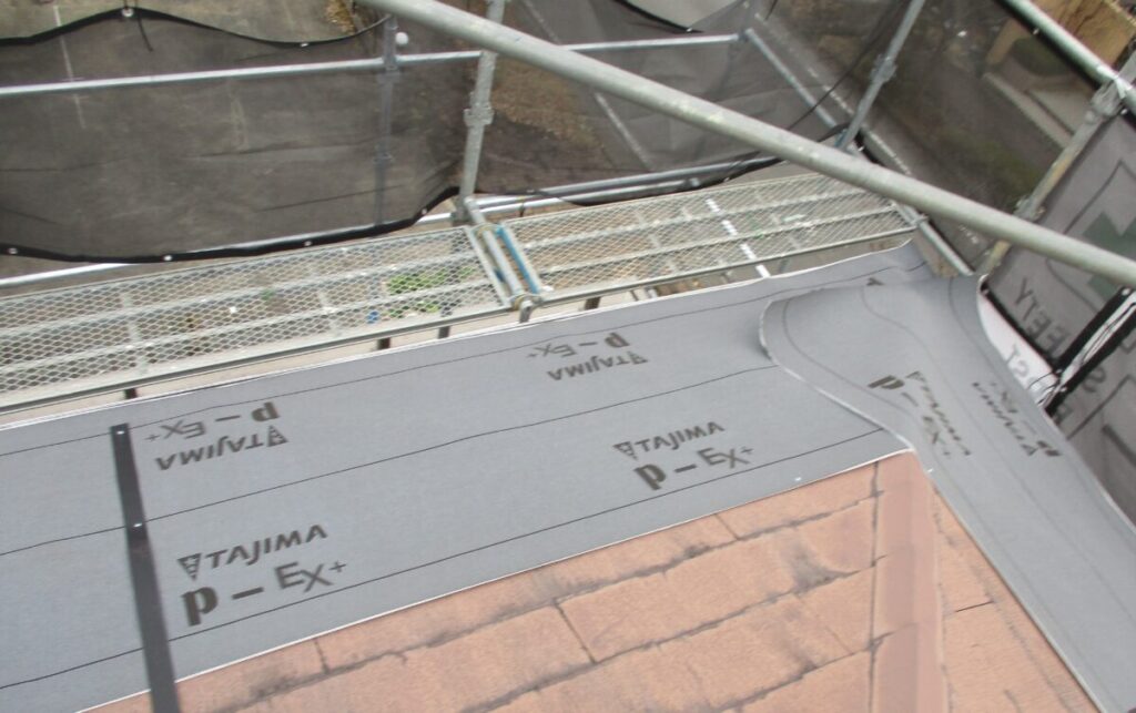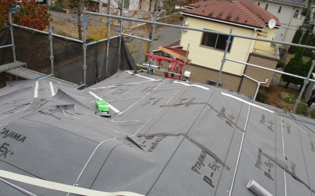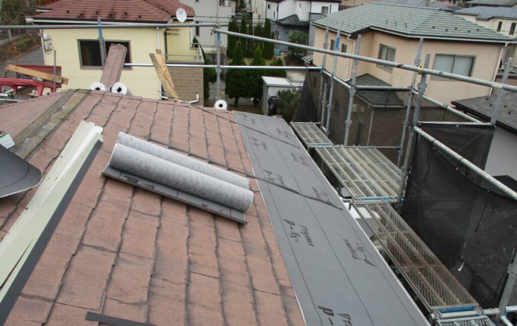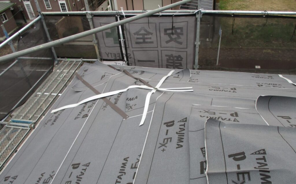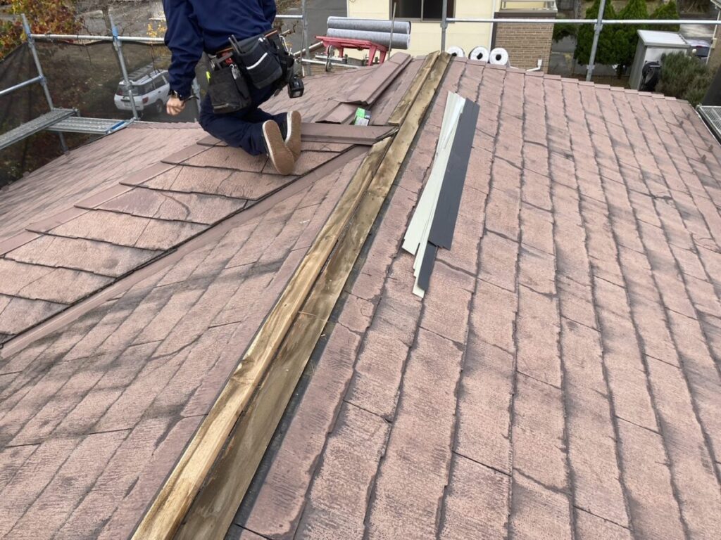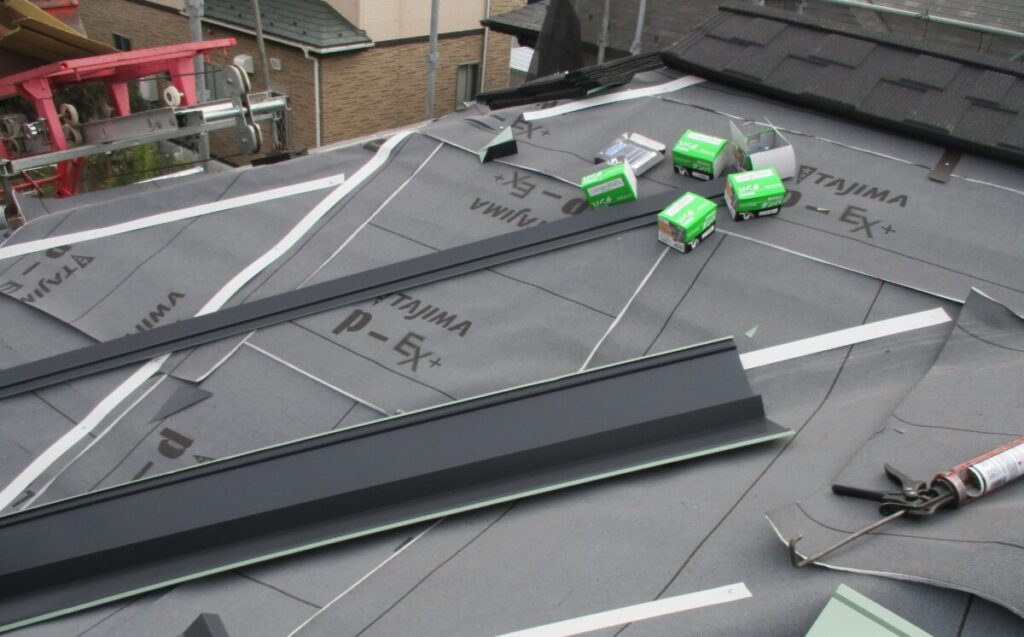 既存の棟板金と棟下地を撤去していきます。雪止めも新しく施工する屋根材に干渉しますのでサンダーで切断してフラットにしていきます。今回新しく施工する屋根材セネターは基本的には雪止め不要の屋根材になります。表面が天然石で凹凸があるのでその摩擦で雪が引っ掛かり落ちにくい構造になっているからです。谷部分にルーフィングを捨て張りしたら軒先から順番にルーフィング(防水シート)を張り重ねていきます。ルーフィングは雨水の浸入を止める最後の砦になりますのでしっかりと規定通り重ねて張っていきます。