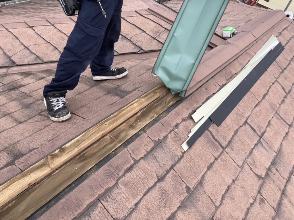 役物板金を取り付けます。役物とは屋根の端部や取り合い部分に取り付ける部材になり本体だけでは屋根の雨仕舞は完成しません。役物は重要なパーツになります。セネター本体をビスでしっかり固定しながら留めていきます。