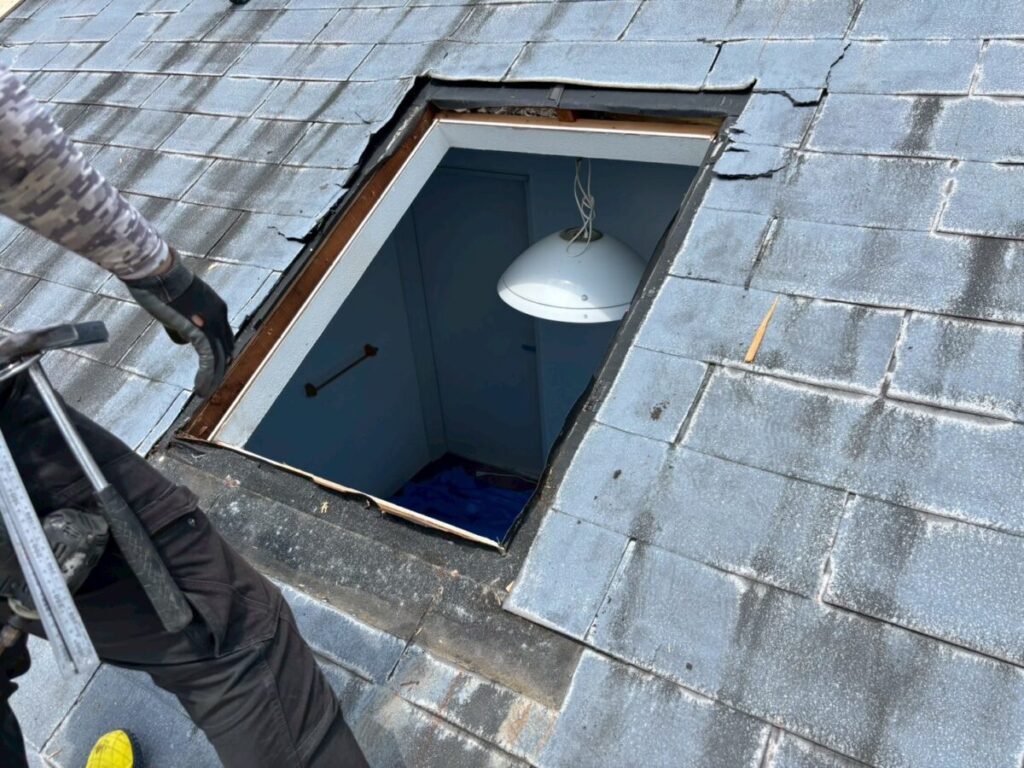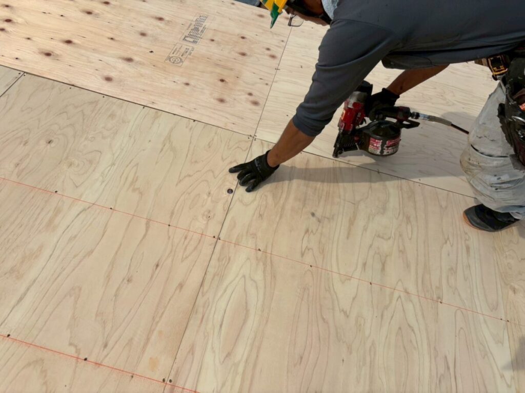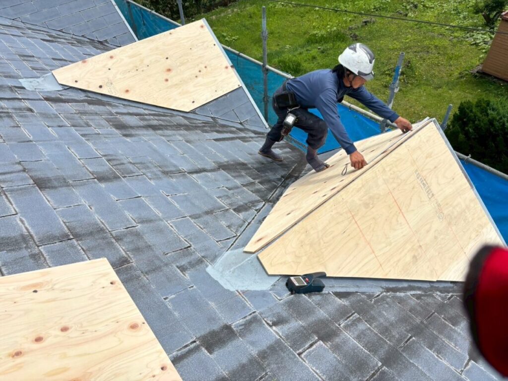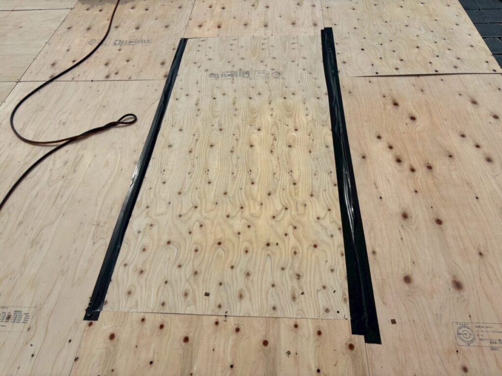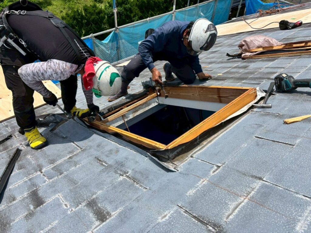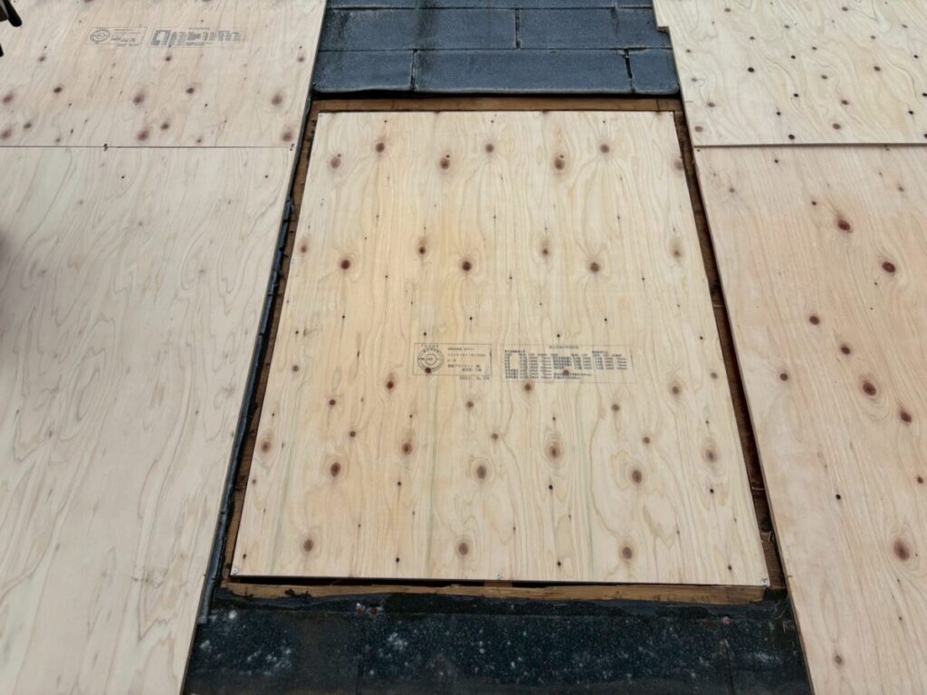 雨漏り原因の一つである天窓を撤去します。既存の天窓を撤去したら室内側には見栄えがいいように白色のべニアを張り屋根側には構造用合板12㎜を2施工します。下地補強のため既存のアスファルトシングルの上に構造用合板を全面に敷き詰めていきます。