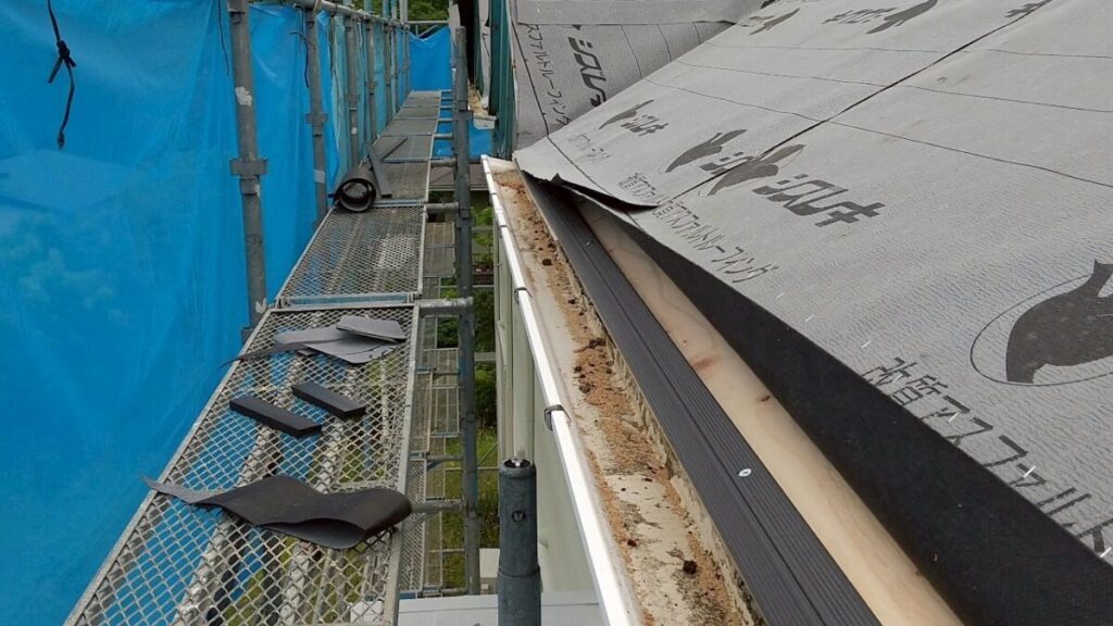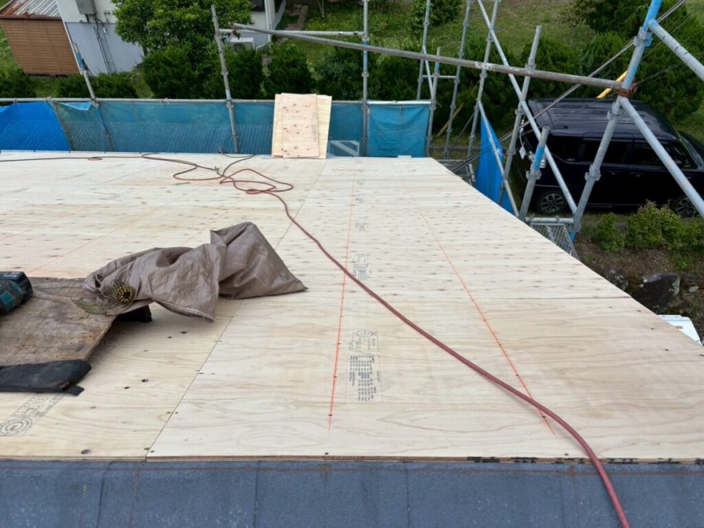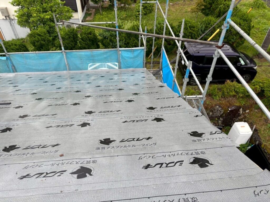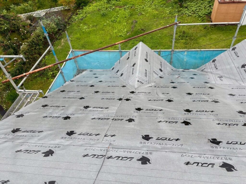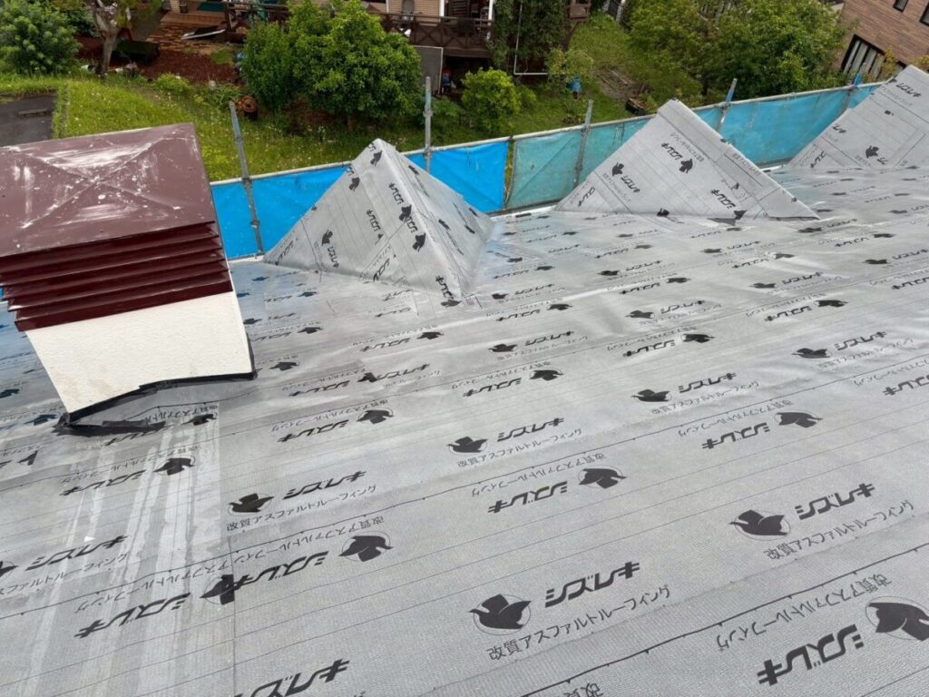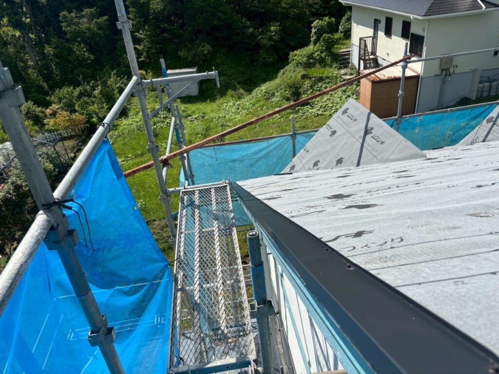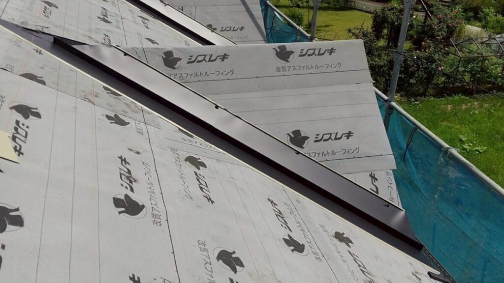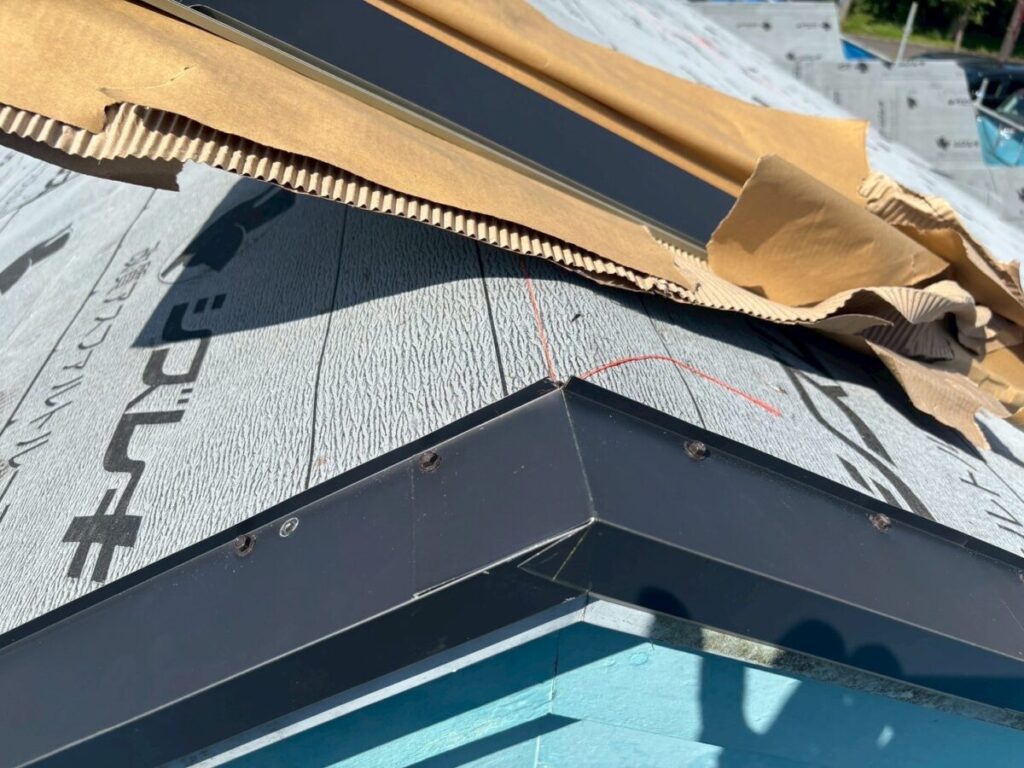 合板の上に改質アスファルトルーフィング(防水シート)を軒先から張っていき役物板金の軒先水切り、ケラバ板金、谷板金を取り付けていきます。