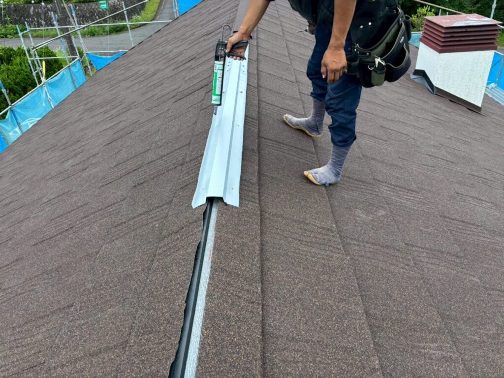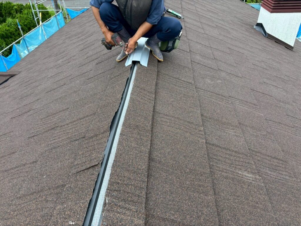 本体を軒先から順番に上に張り上げていきます。本体と本体の突き合せの部分に棟下地の棟用スペーサーを取り付けたら石付の棟カバーを被せて完成です。