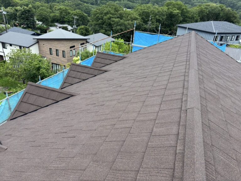 アスファルトシングルとは、ガラス繊維にアスファルトを含浸させ、表面に彩色された砂粒をコーティングしたシート状の屋根材です。柔軟性があり、複雑な屋根形状にも施工しやすく、軽量であるため耐震性が高いという特徴があります。アメリカで広く普及しており、洋風や北欧風のデザインにマッチし、防音性にも優れているとされています。昔のアスファルトシングルはそれほど耐久性は長くありませんでしたが近年は高耐久性といわれるアスファルトシングル材が販売されています。