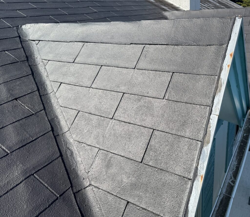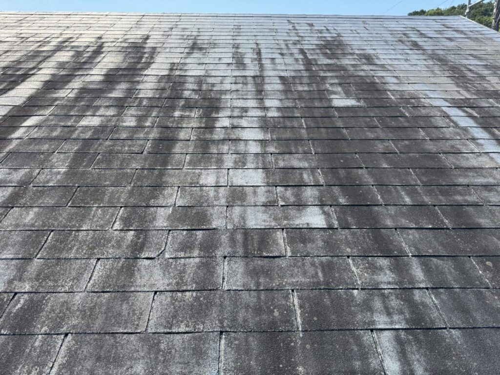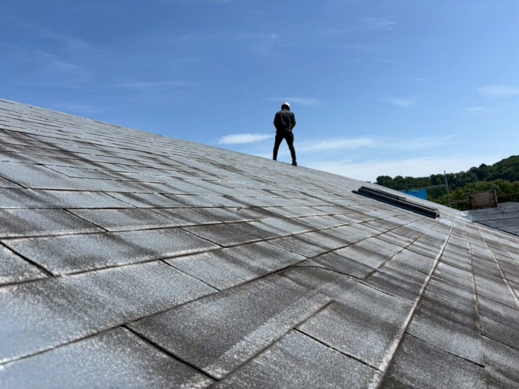 雨漏りのご相談があり現地調査にお伺いいたしました。複数個所の雨漏りが発生している状態で、下地の心配もありましたので、ドローンだけではなく、屋根に実際に上がり歩いてみましたが下地の劣化が進んでいる様子でしたので、現状のアスファルトシングルの上に構造用合板12㎜を敷き詰め下地補強を行ったうえで新しい屋根材を葺くカバー工法でご提案させていただきました。
