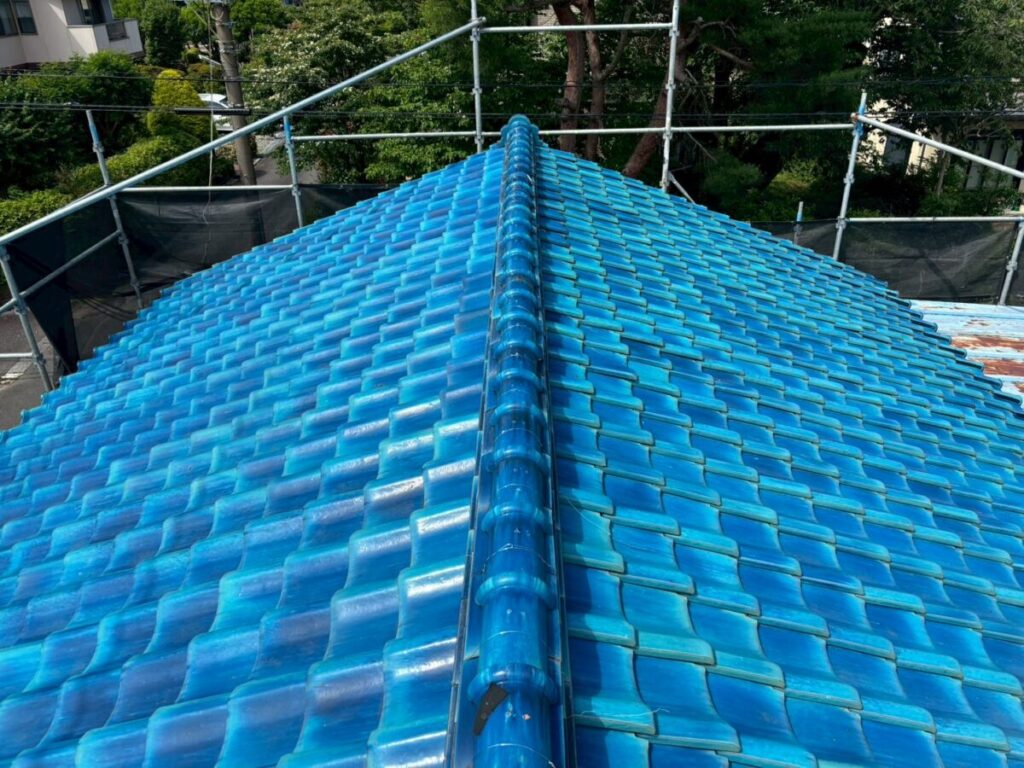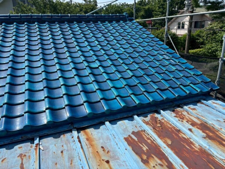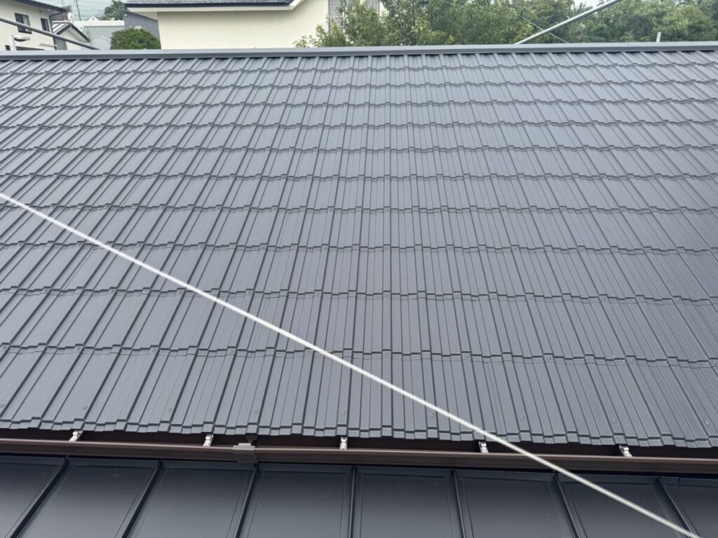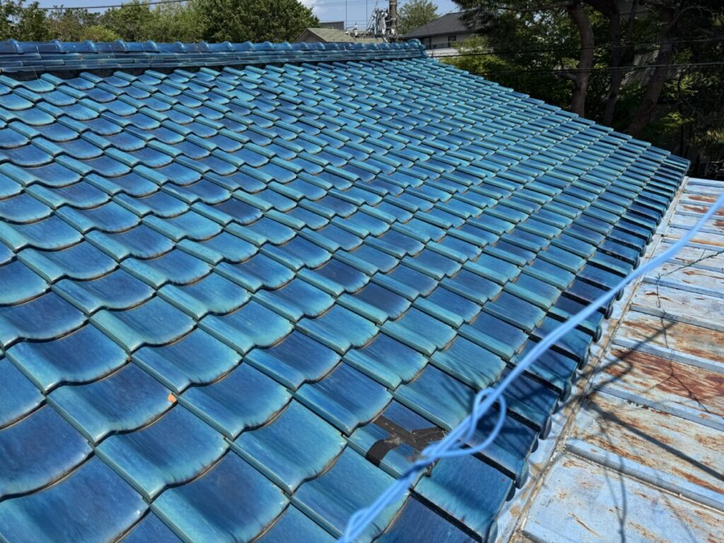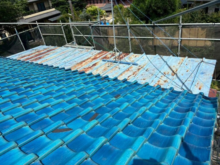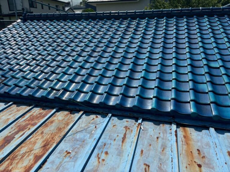 静岡県伊東市で平屋の屋根瓦を撤去して、瓦調ガルバリウム鋼板の屋根に重ね葺き工事をおこないました。