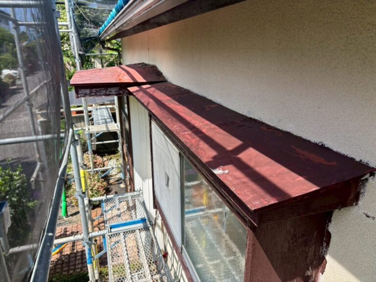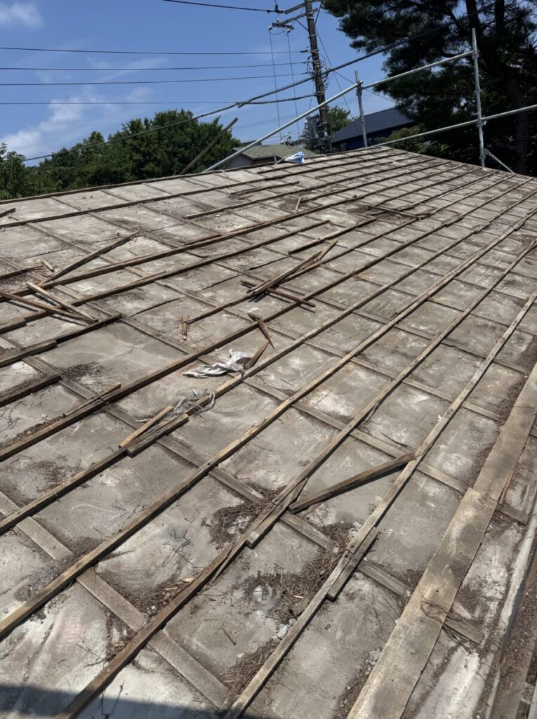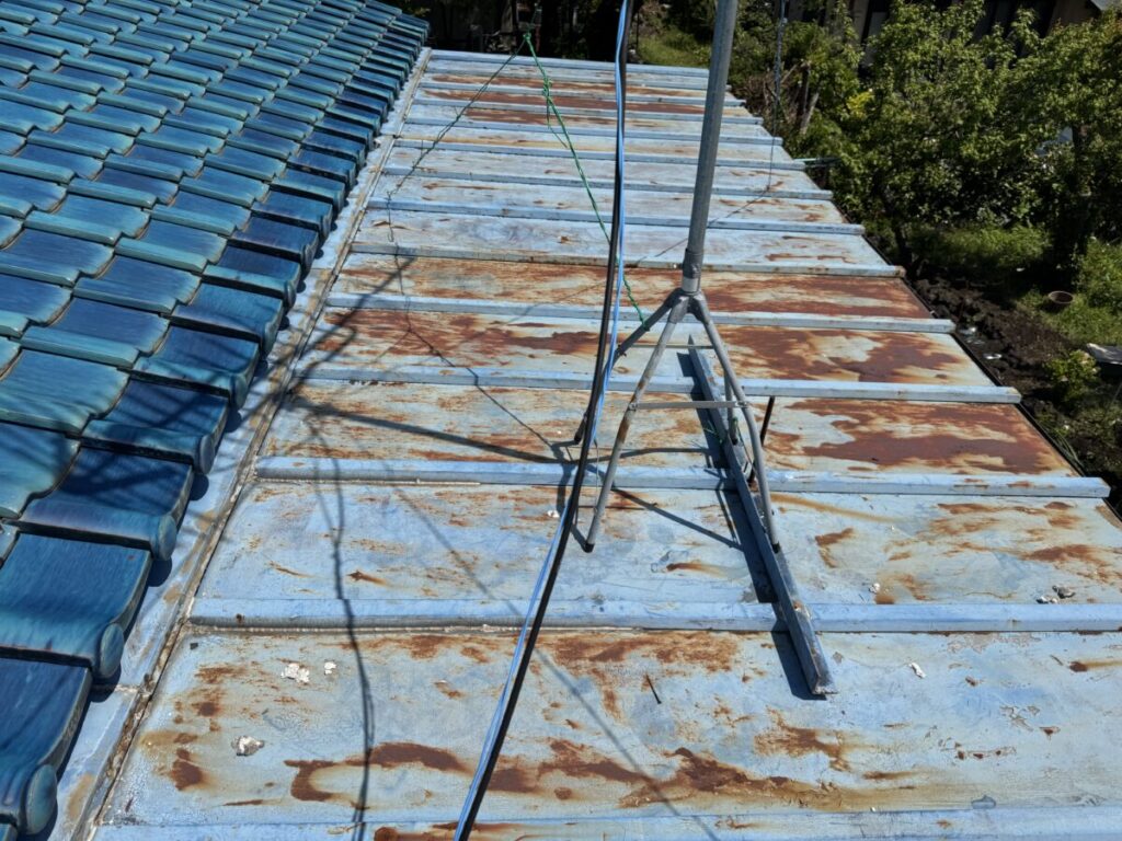 雨漏りのご相談があり現地調査にお伺いいたしました。築50年以上経過しているため瓦葺の方は下葺き材の劣化が進み何箇所か雨漏りが発生していましたので現状の瓦を撤去して、下地を合板で補強し新しい軽量瓦での葺き替え工事をご提案しました。この瓦調の屋根レクトプルーフは見た目が瓦調なので葺き替え後も違和感なく美観が保たれる仕上がりになります。一段下がった下側の屋根ですが瓦棒葺き(桟葺き)と呼ばれる屋根で緩勾配に採用される金属製の屋根になっています。ジョイント部分には角材が入っていますが年数の経過により傷みが進んでいる様子でした。こちらの屋根も葺き替え工事が必要なので一度剥がして新たに屋根材を張っていきますが瓦葺きと比べて勾配が緩い屋根となっていますので、レクトプルーフは使用不可です。こちらは緩勾配対応の立平葺きでご提案させていただきました。