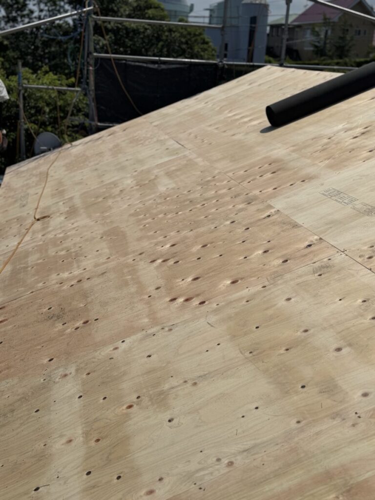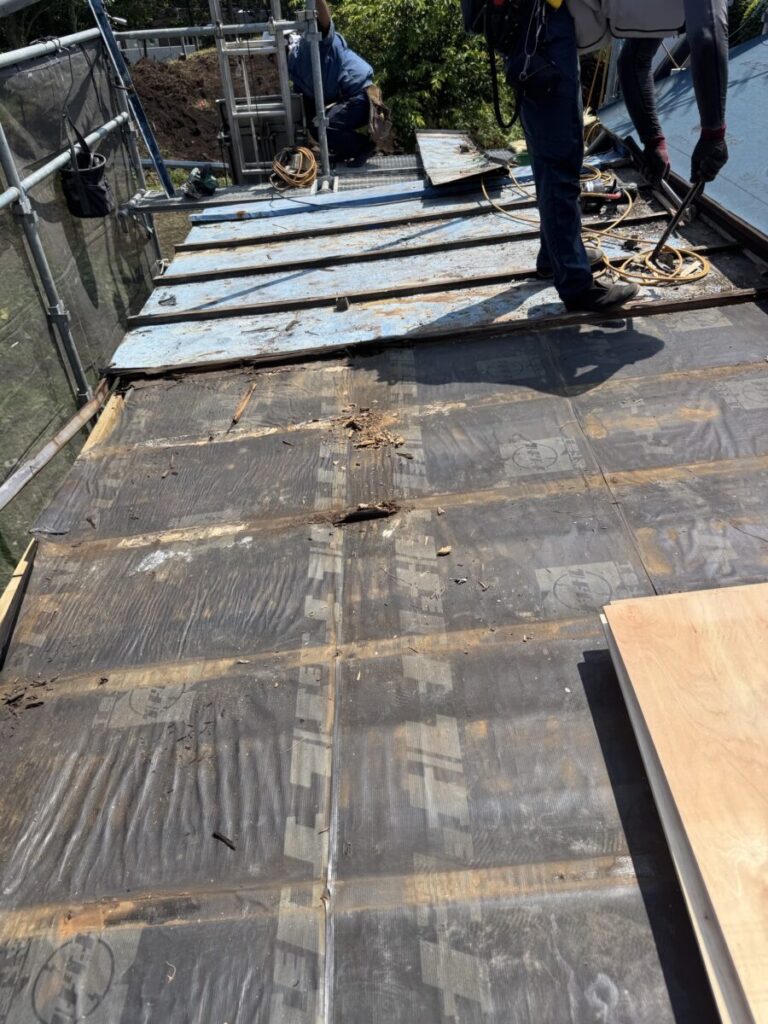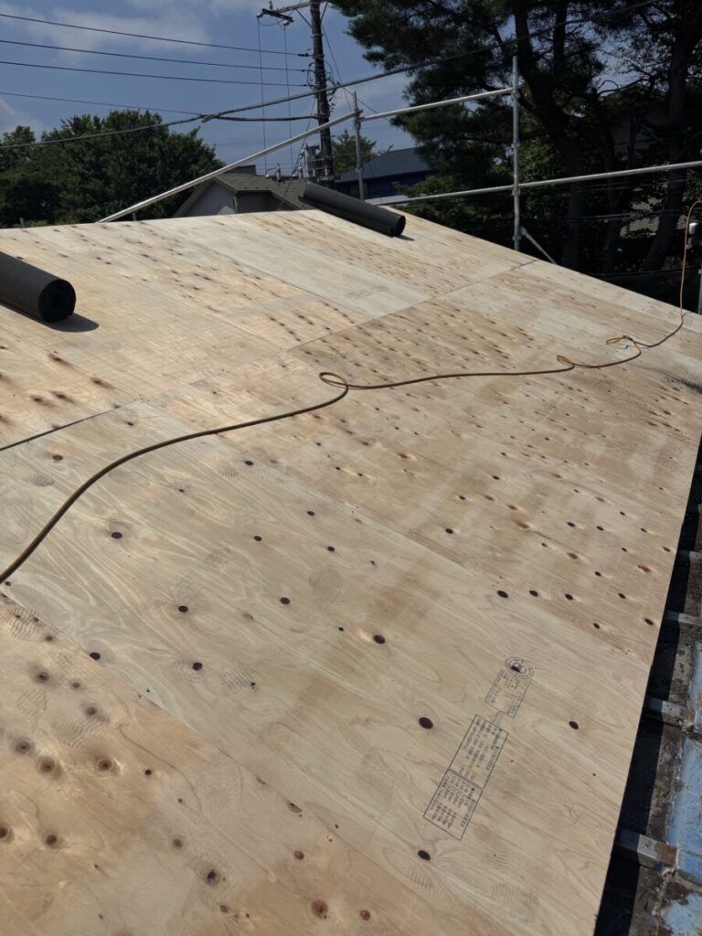 瓦と瓦棒のトタンを撤去したら構造用合板の12㎜を張り詰めていきます。この時は下地の垂木に留めて下地を補強していきます。