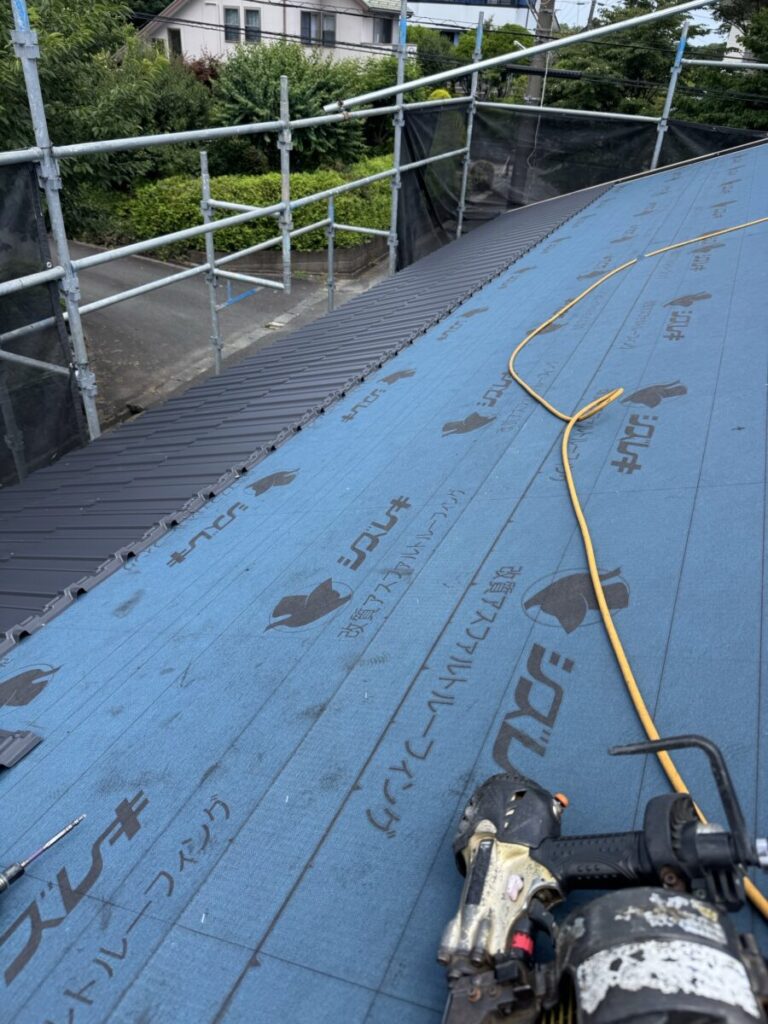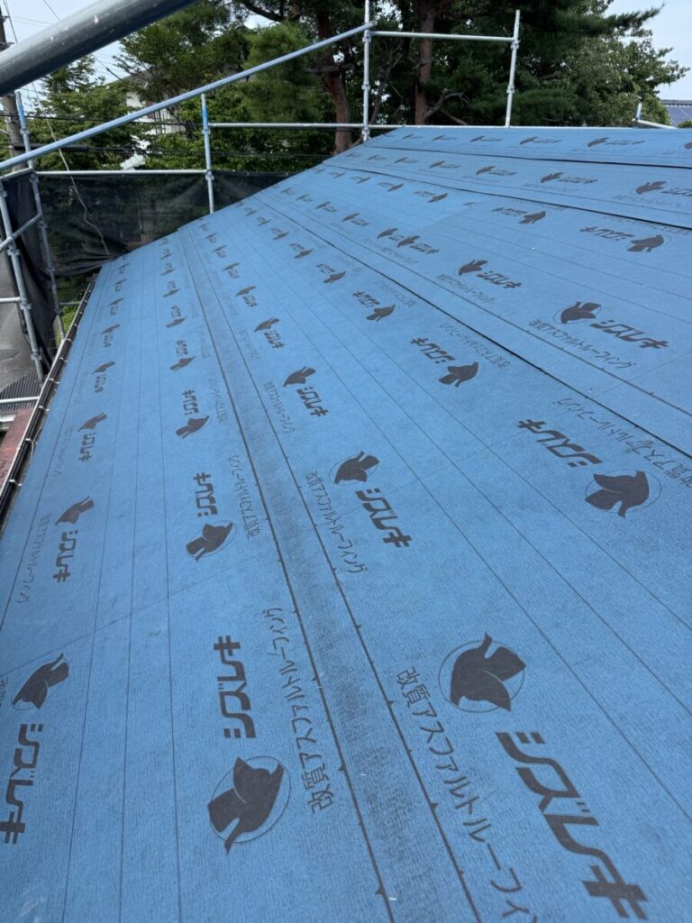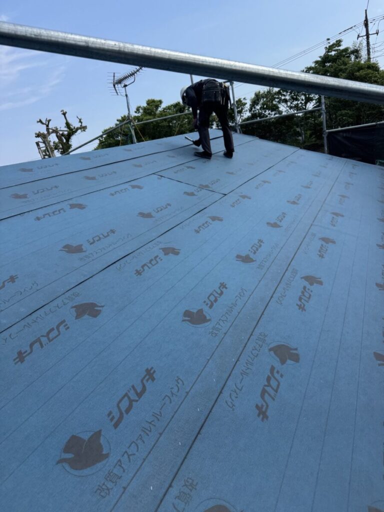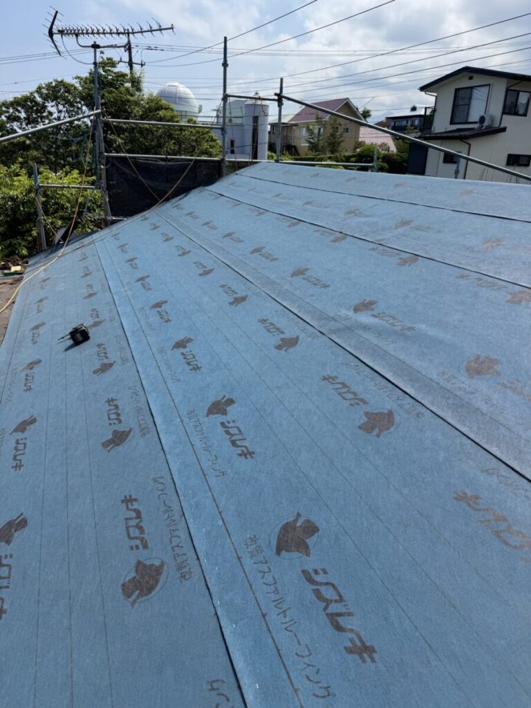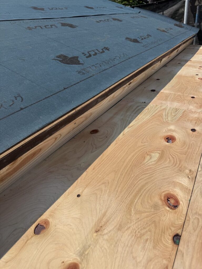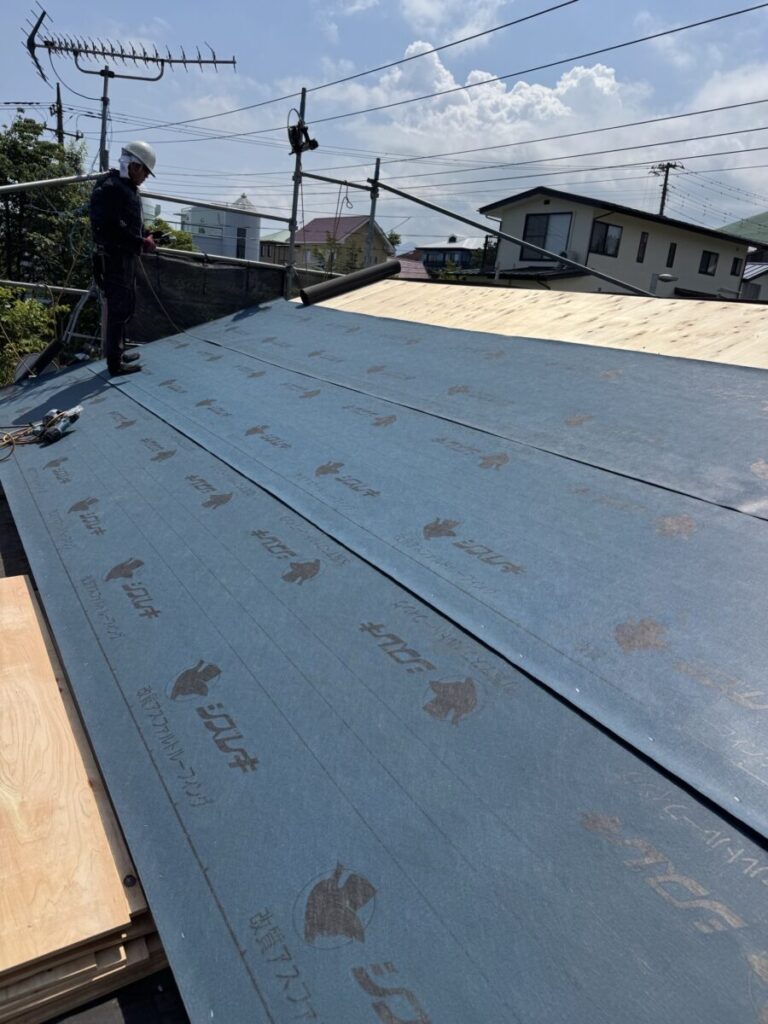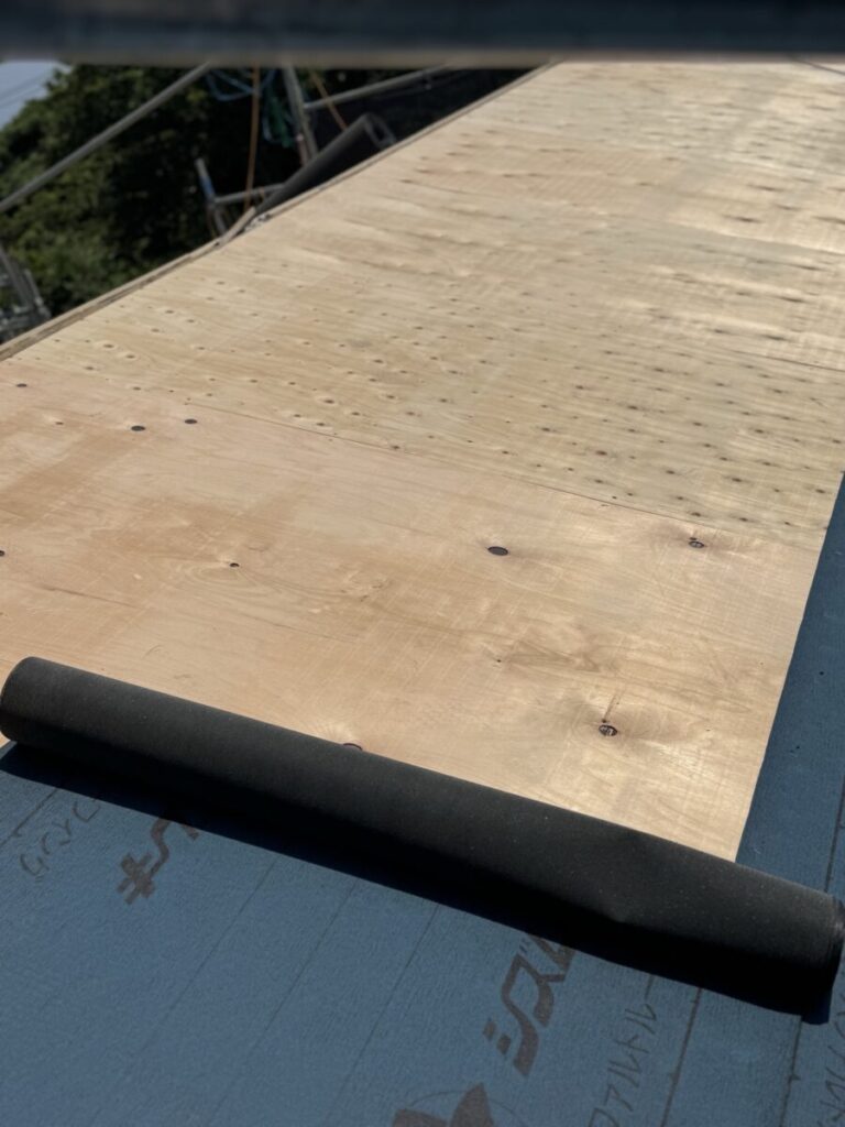 合板の上に改質アスファルトルーフィングを張っていきます。防水シートになります。