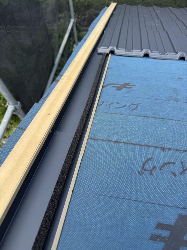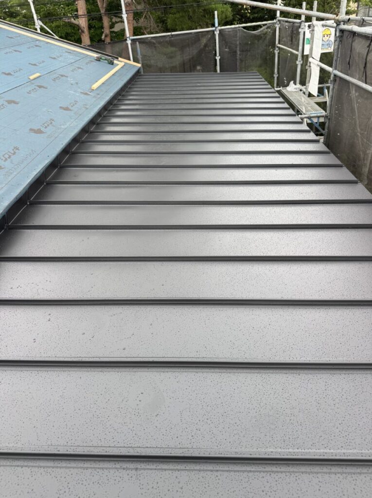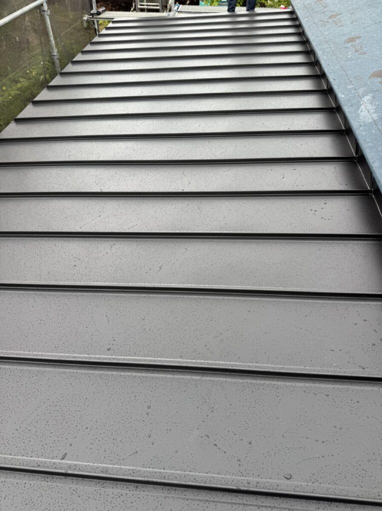 下屋根の立平葺きを張っていき上屋根にレクトプルーフを張っていきます。