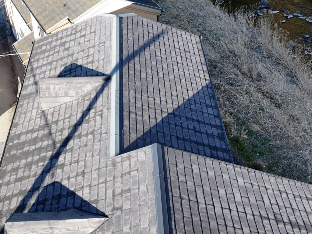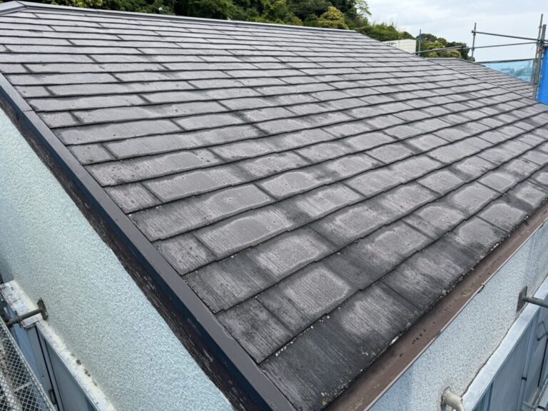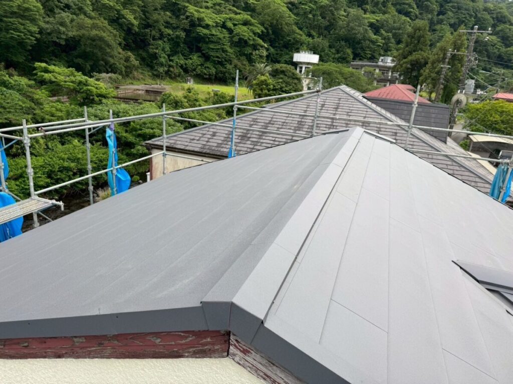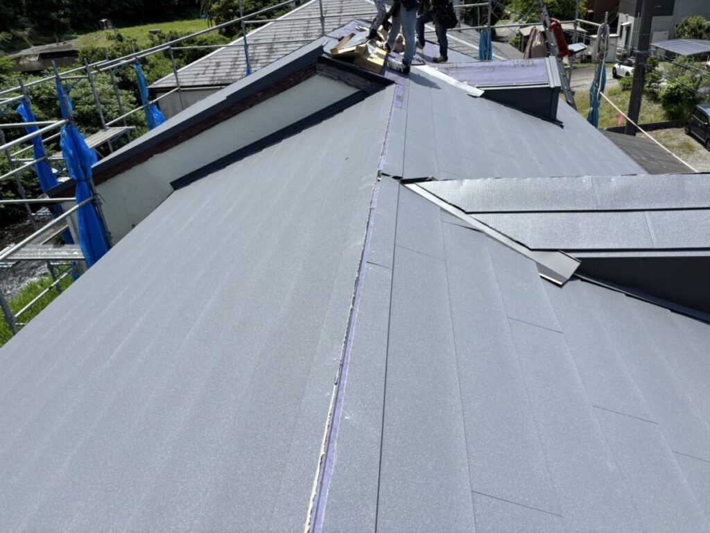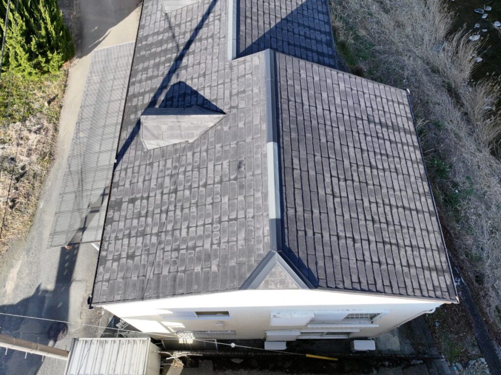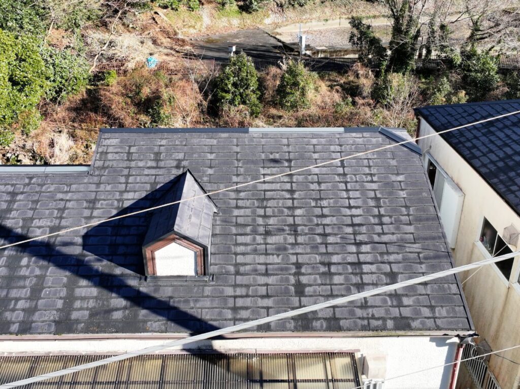 静岡県伊東市で化粧スレートの屋根にシルキーG2をカバー工法で施工しました。
