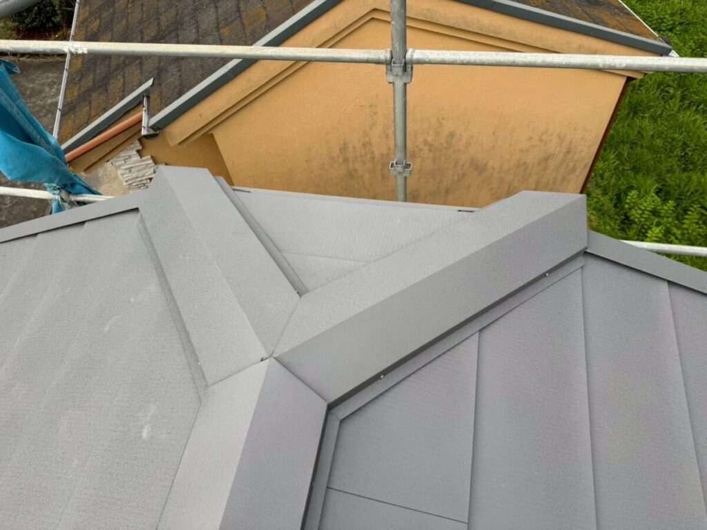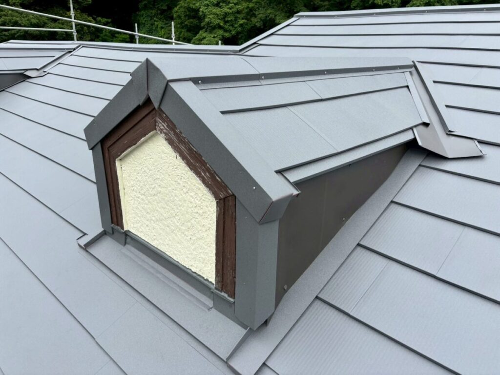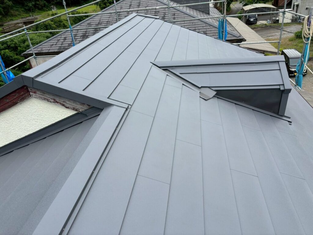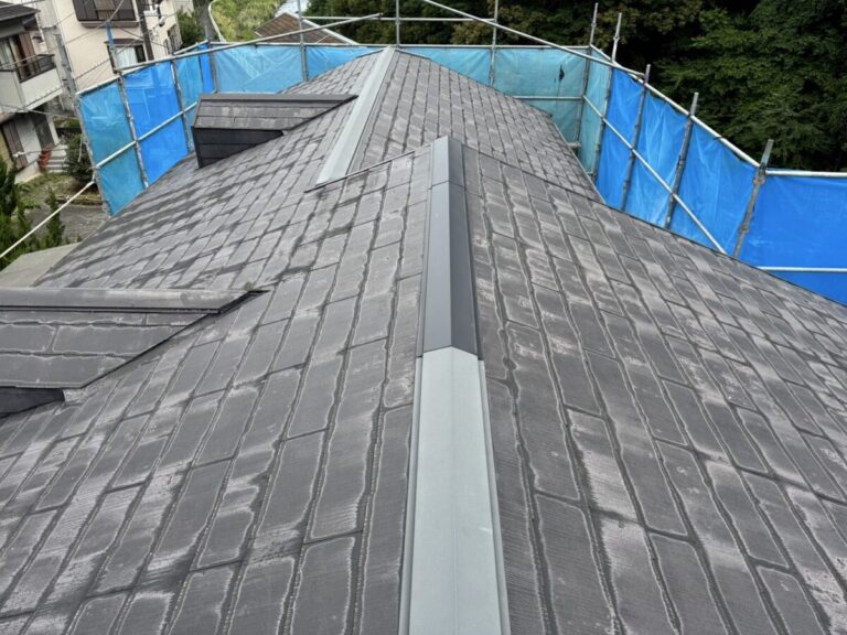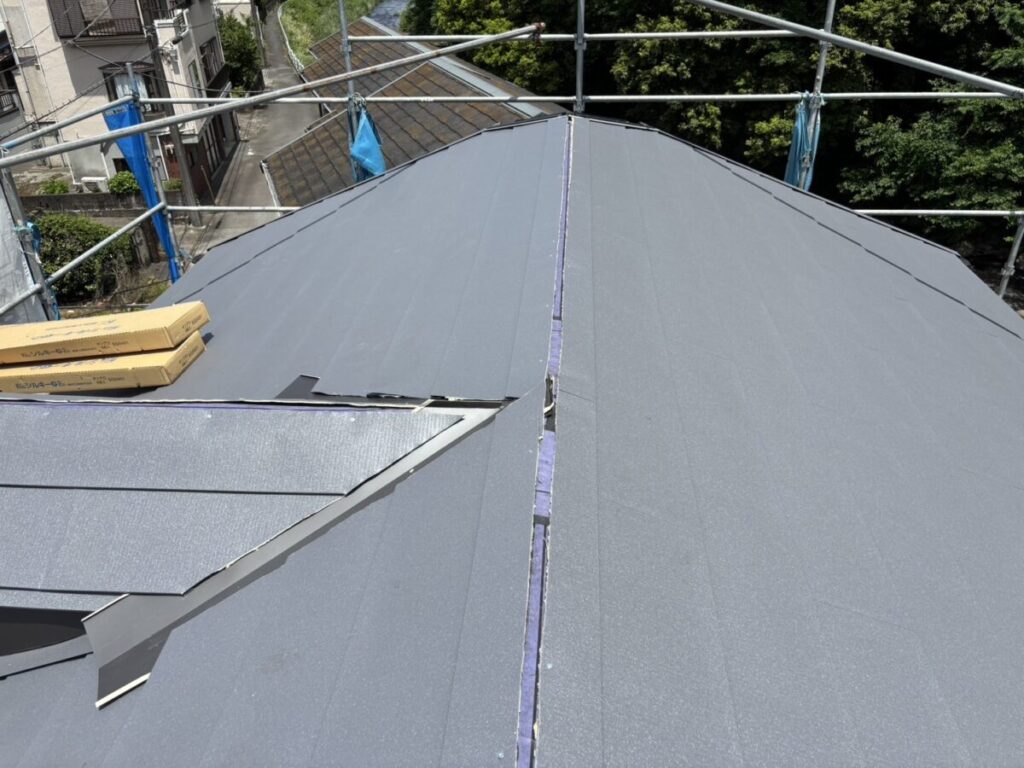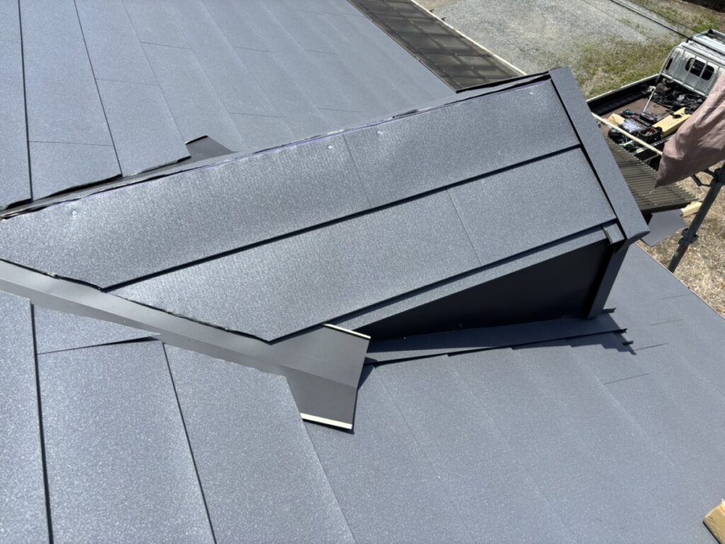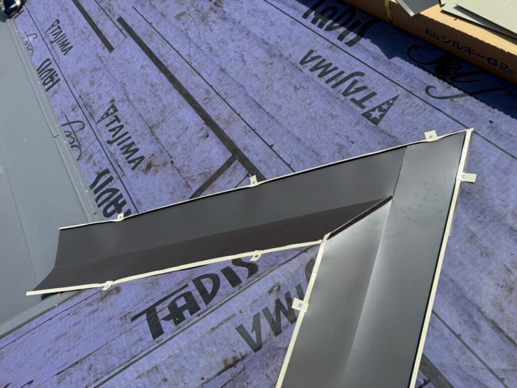 本体を張り合わせた頂上部分には棟を取り付けたら完成です。今回の色はギングロで施工しましたが落ち着いた高級感のある色です。