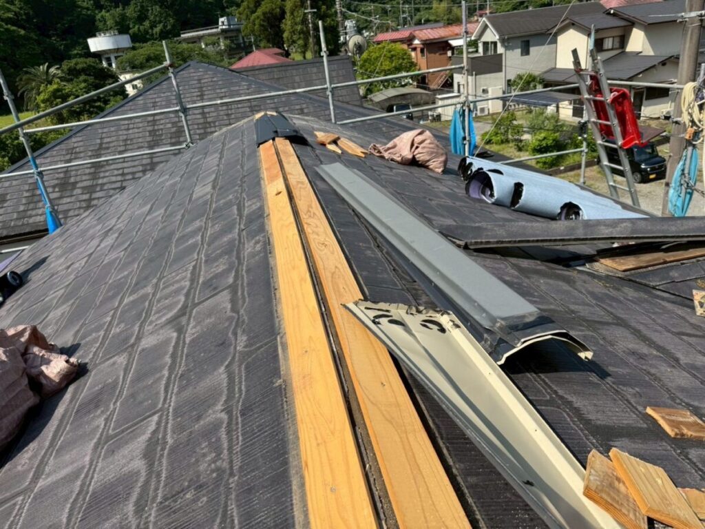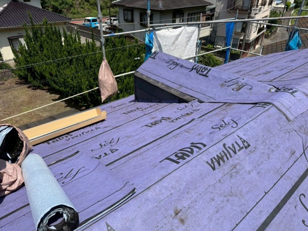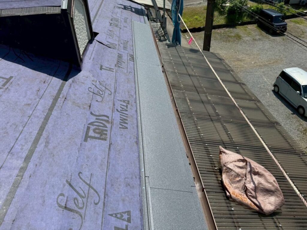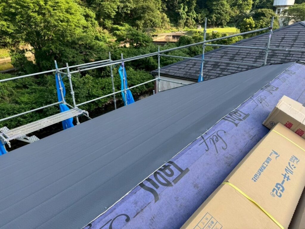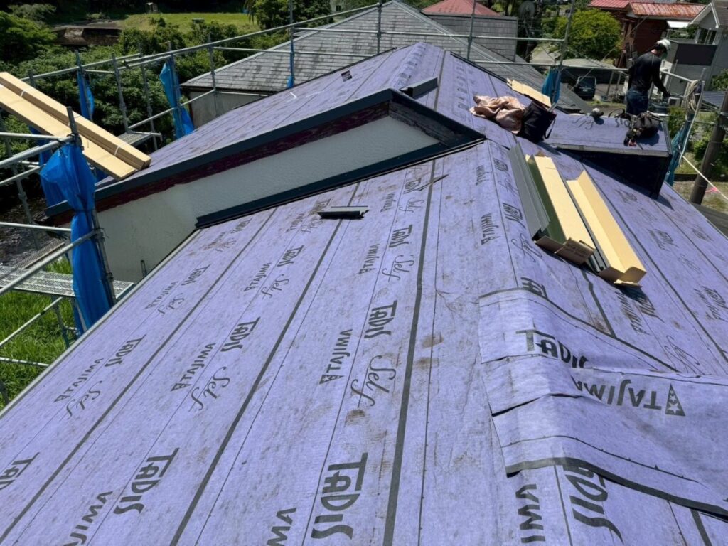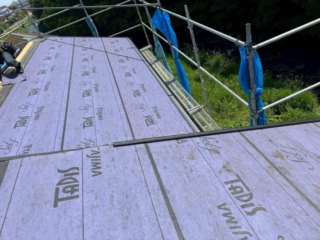 既存の棟を撤去したら屋根の先端部分の軒先にセットバックという役物部材を取り付けます。その役物板金の上から粘着層付き改質アスファルトルーフィング(防水シート)を所定幅重ねながら屋根全体に張っていきます。