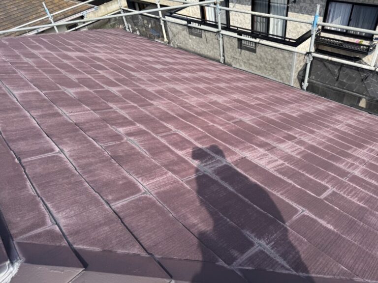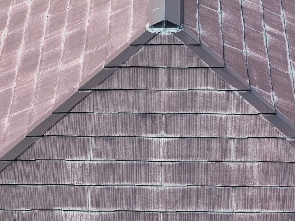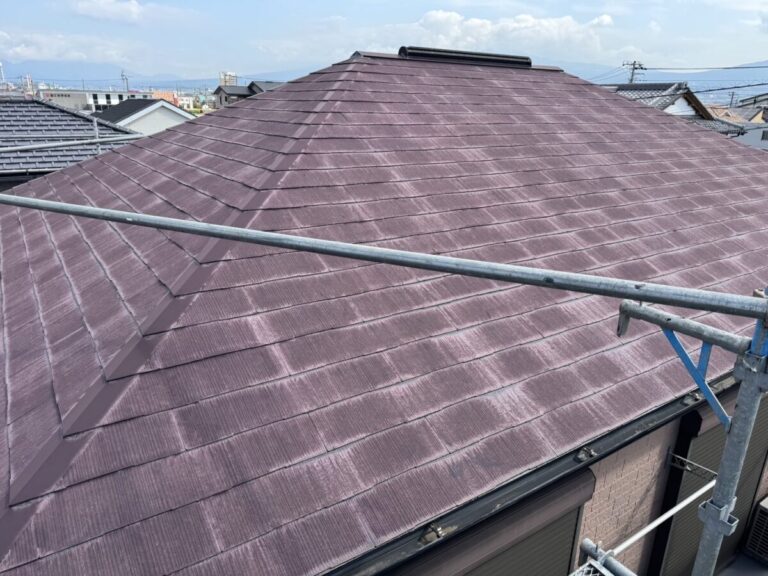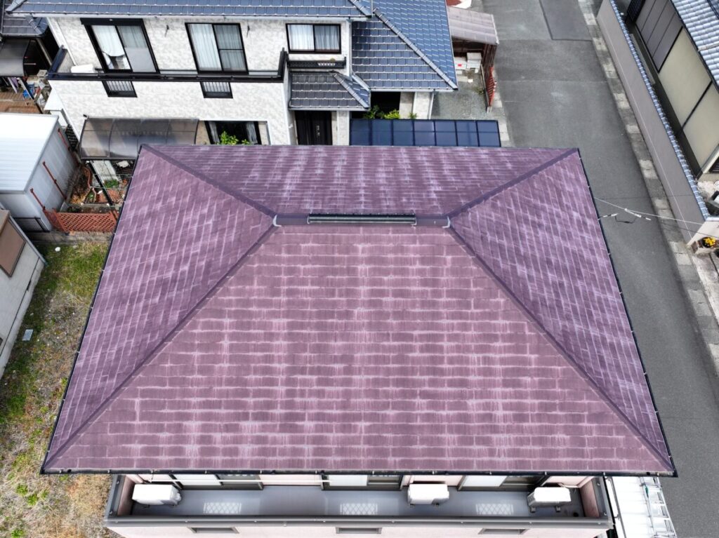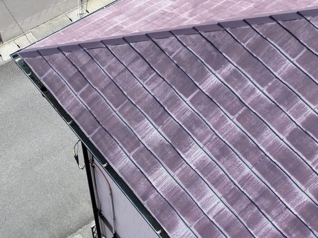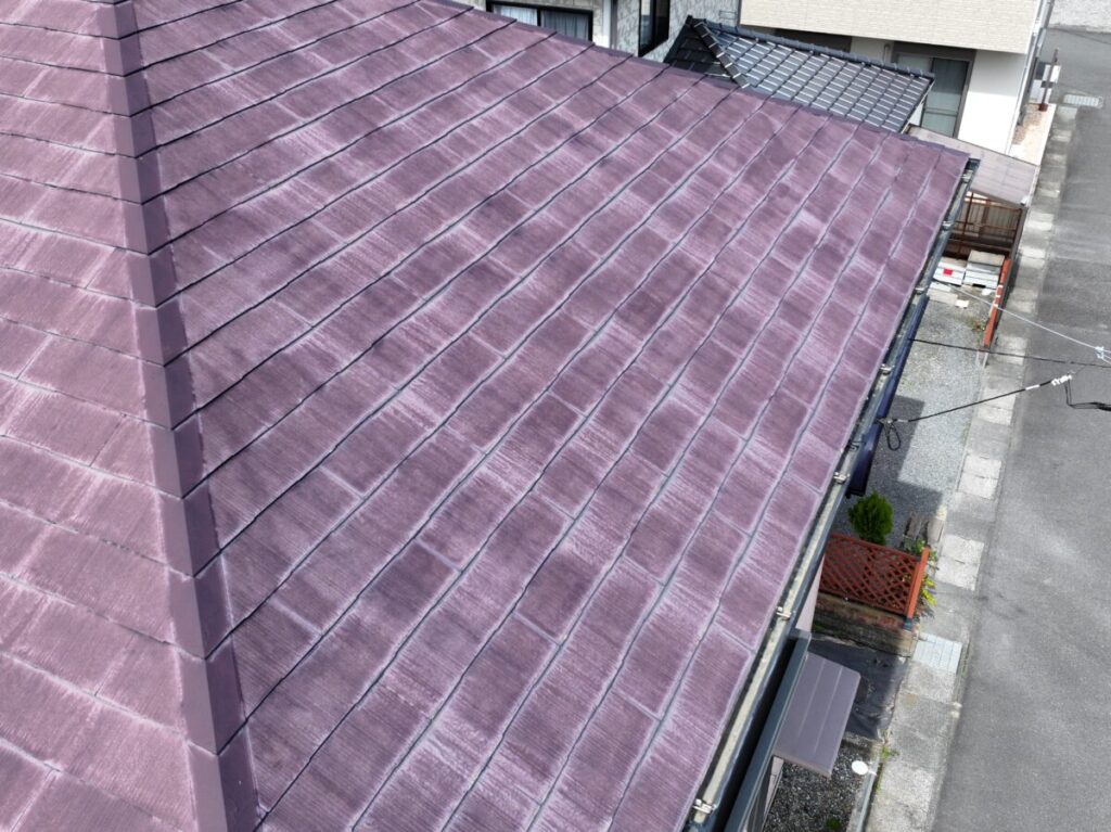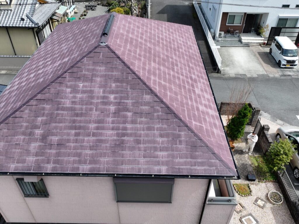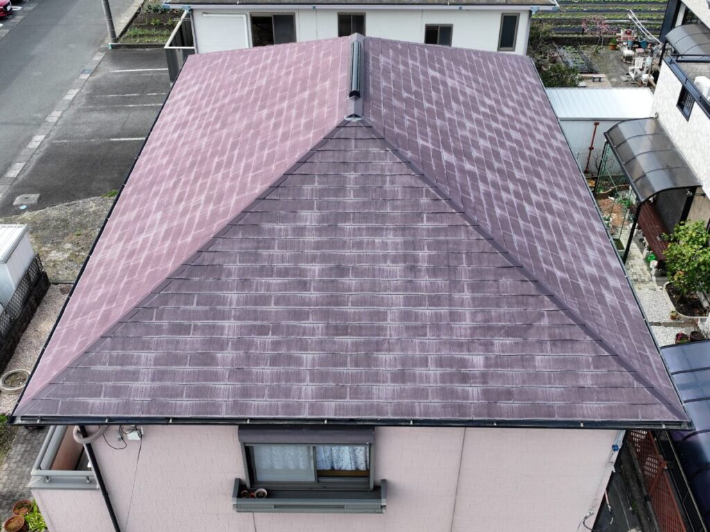 屋根外壁の診断にお伺いいたしました。屋根は化粧スレートのコロニアル、外壁は窯業系のサイディングを使用していました。ドローンで屋根の状態を確認しましたが、25年ほど経過していましたが破損などはなく色あせは見られるものの雨漏りもなく悪い状態ではありませんでした。外壁は色あせて、シーリング材のひび割れなどがありましたので美観の向上のための外壁塗装と屋根は今後の雨漏りリスクをなくすためカバー工法でのご提案をさせていただきました。屋根は塗装を実施しても雨漏りの予防にはならず下葺き材のルーフィングの寿命で雨漏りが発生します。今回は海から近い立地でしたので海岸から0mでもメーカー保証のあるセネターを施工させていただきました。