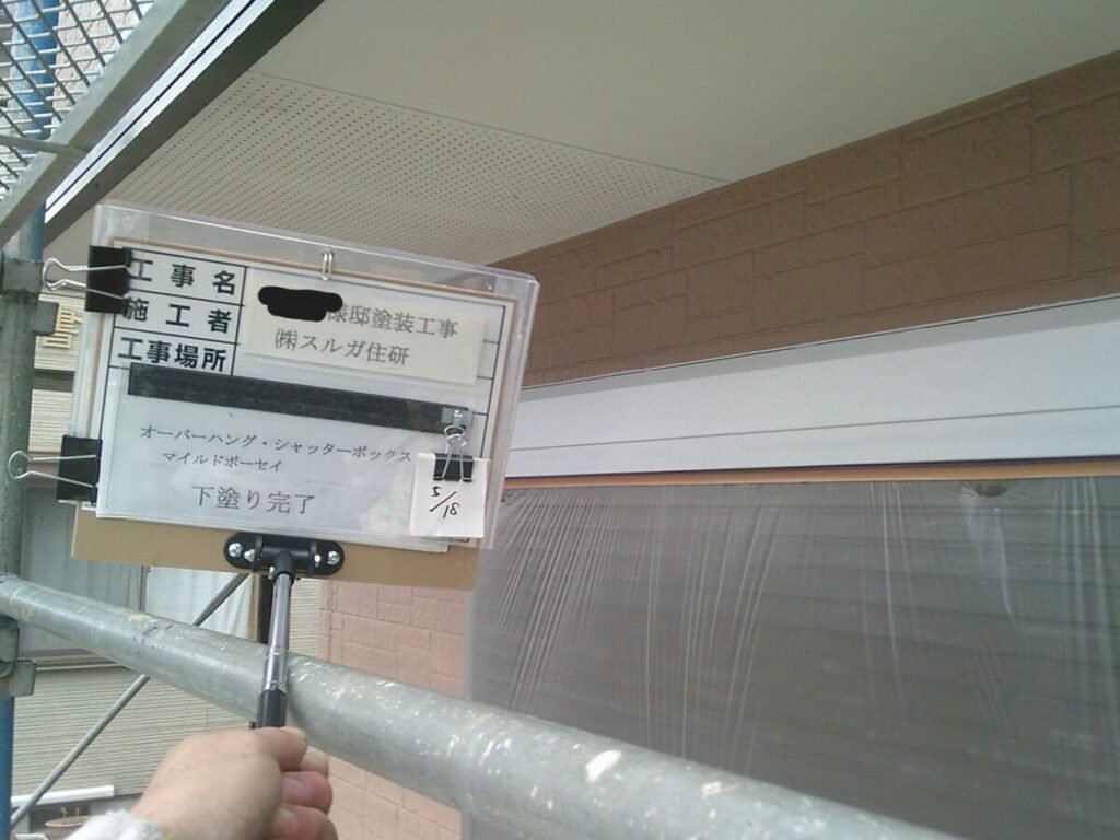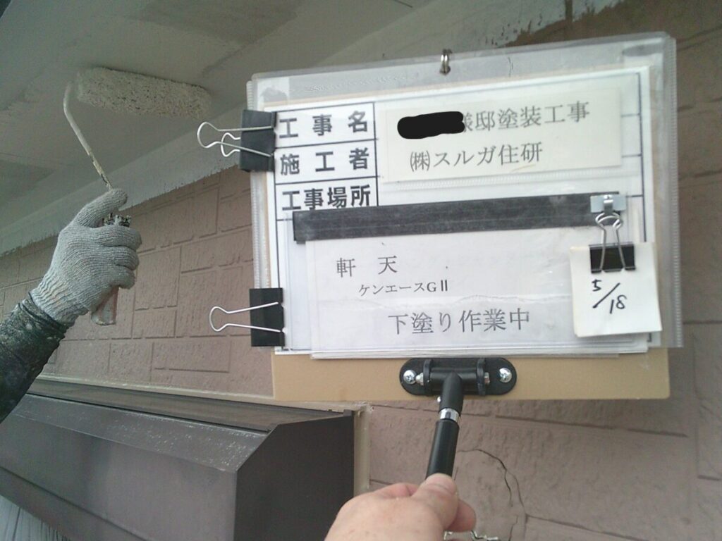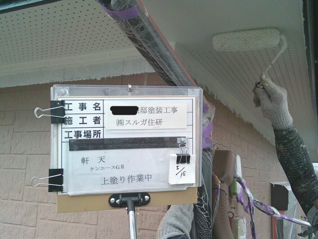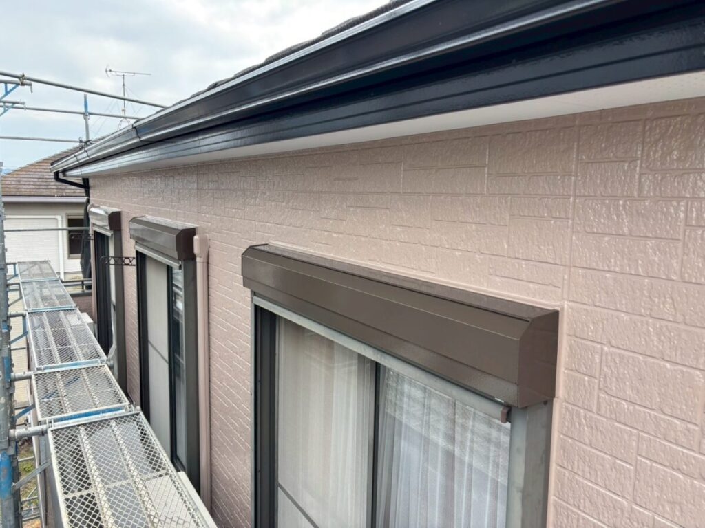 付帯部の軒天、シャッターボックス、幕板、雨樋等の外壁部分以外を塗装していきます。