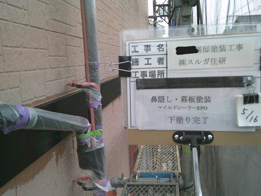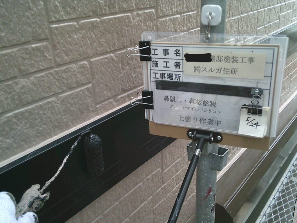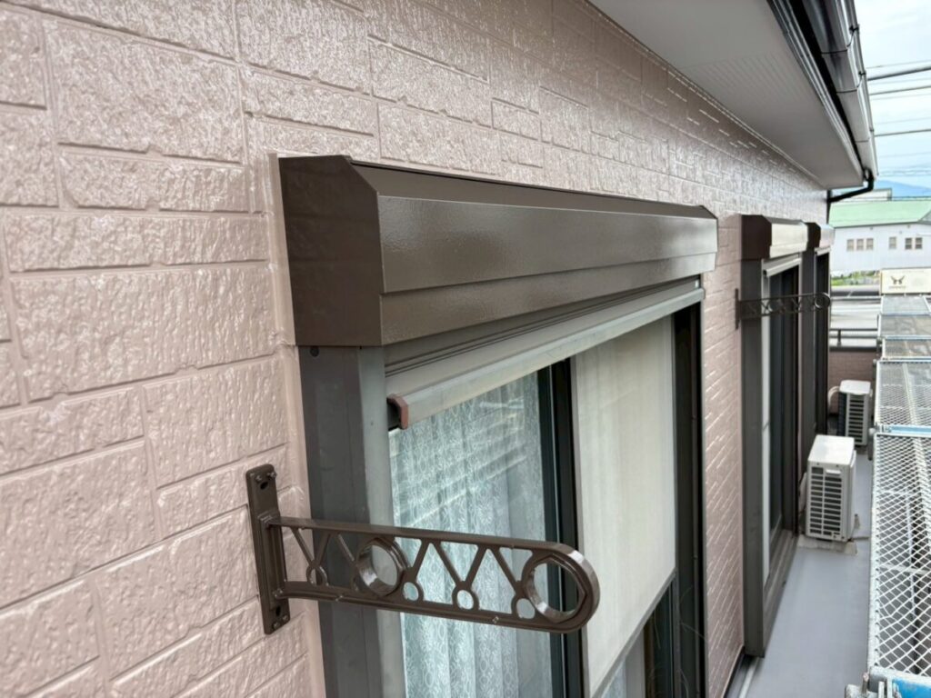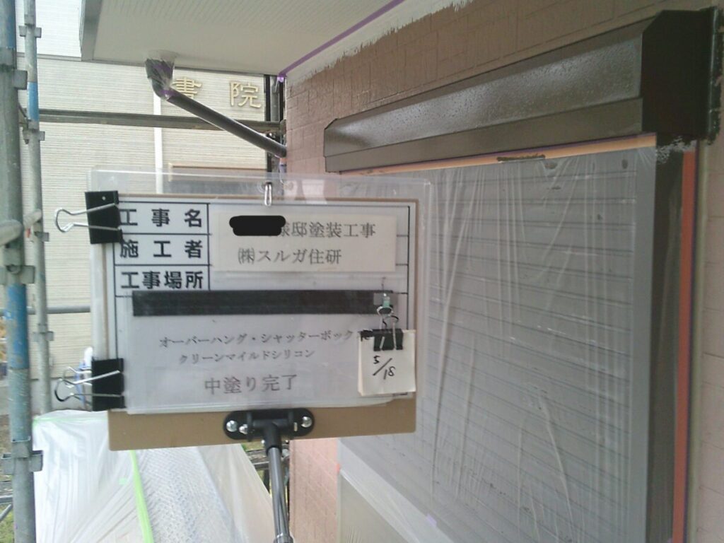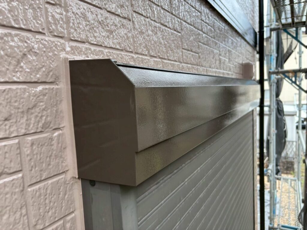 付帯部の軒天、シャッターボックス、幕板、雨樋等の外壁部分以外を塗装していきます。
