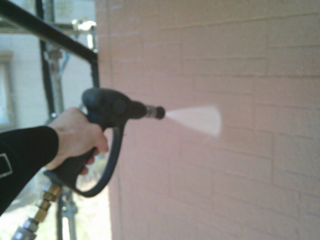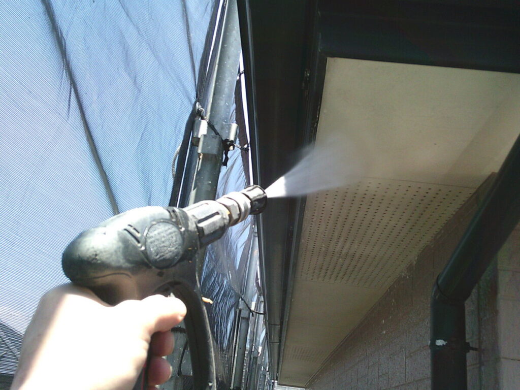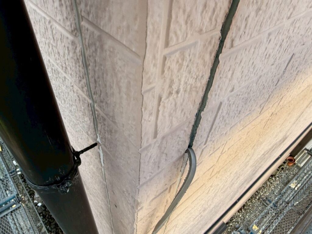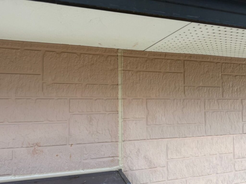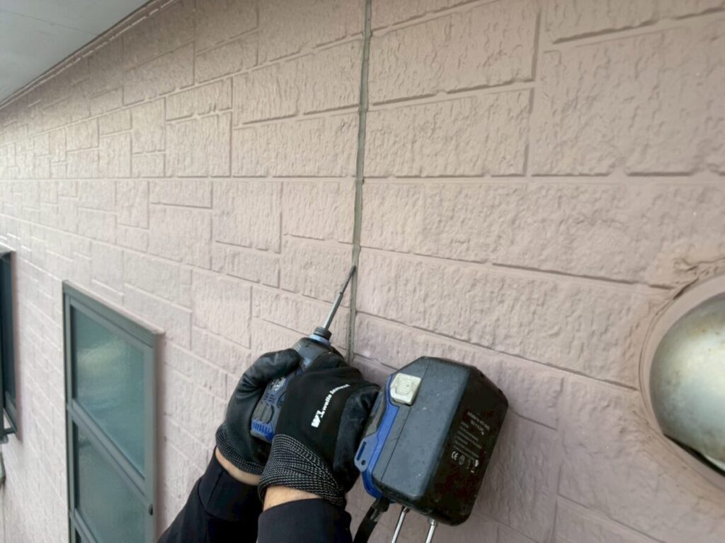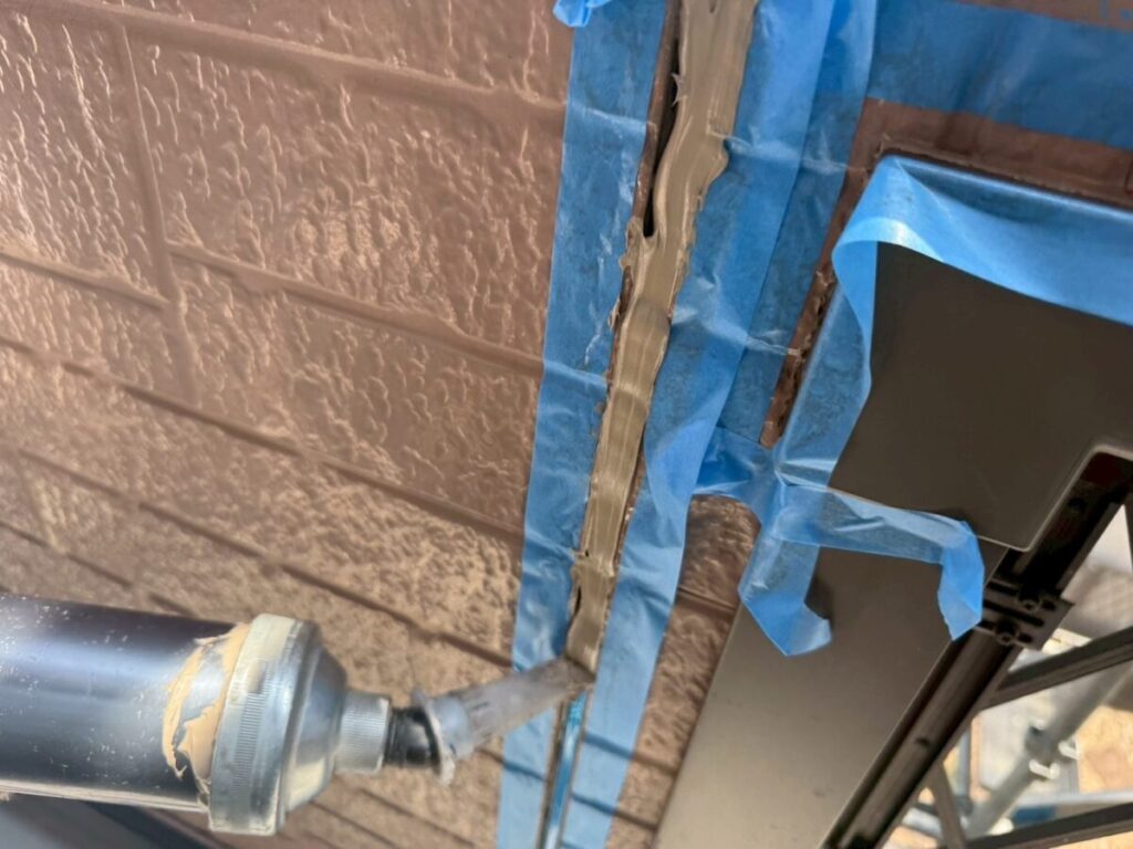 汚れた外壁に高圧洗浄をかけて洗っていきます。この時に付帯部の窓やシャッター、軒天、雨樋なども一緒に洗浄を掛けて綺麗にしていきます。乾燥ししたらシーリング工事に移ります。シーリング材を撤去し、プライマーを塗布したらシーリング材を充填してヘラで撫で綺麗にならしていきます。今回は高耐候性シーリング材オートンイクシードを使用しました。